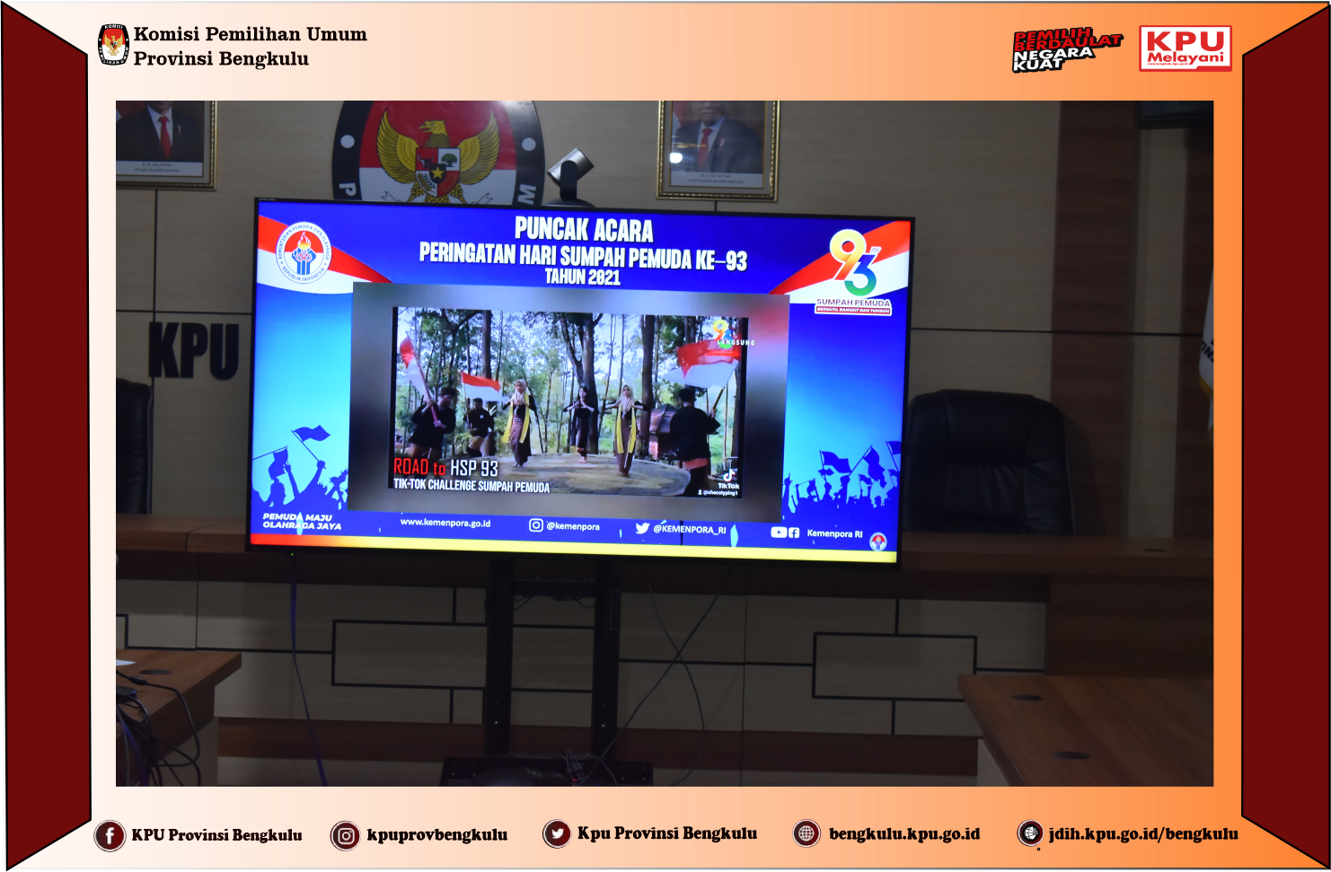 Ketua KPU Provinsi Bengkulu Irwan Saputra dan Anggota KPU Provinsi Bengkulu Darlinsyah serta Sekretaris Kemas M Ajir, Kabag Hukum Teknis dan Hupmas Oktan Huzaeiry dan Operator PPID mengikuti Pembukaan Rapat Koordinasi Nasional PPID & Workshop Kehumasan KPU RI yang diselenggarakan KPU Republik Indonesia secara daring (zoom meeting) pada Rabu (27/10). Kegiatan Rakornas yang diikuti KPU Provinsi dan KPU Kabupaten/Kota ini dibuka langsung oleh Plh. Ketua KPU RI I Dewa Kade Wiarsa Raka Sandi dan Anggota KPU RI Pramono Ubaid Tanthowi dan Arief Budiman. Dalam arahannya Dewa menyampaikan rakornas ini sebagai upaya untuk meningkatkan kualitas SDM Kehumasan dalam rangka menghadapi Pemilu dan Pemilihan Tahun 2024.