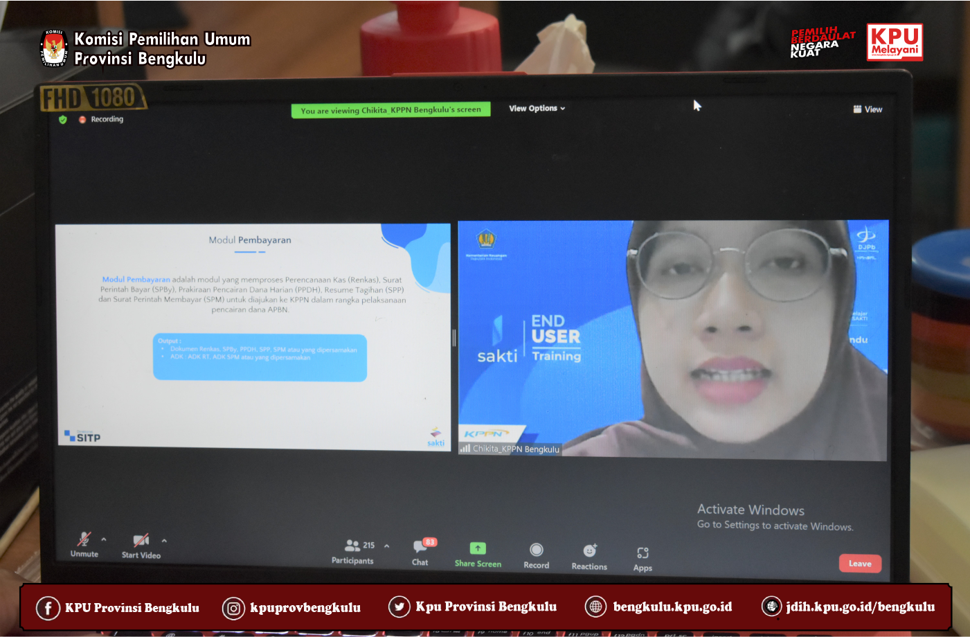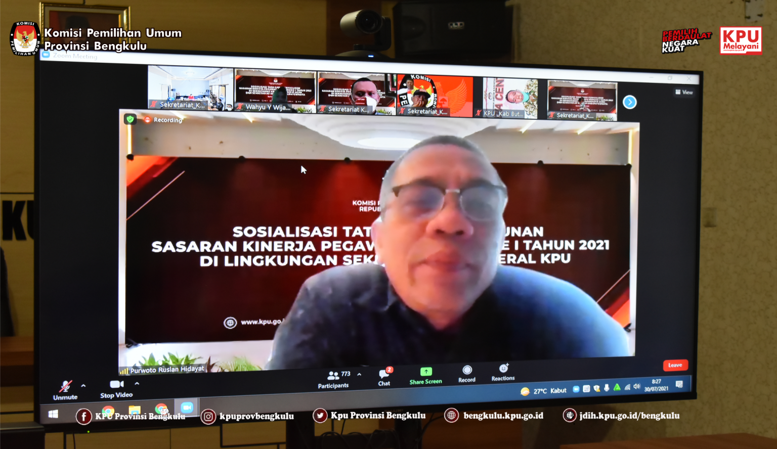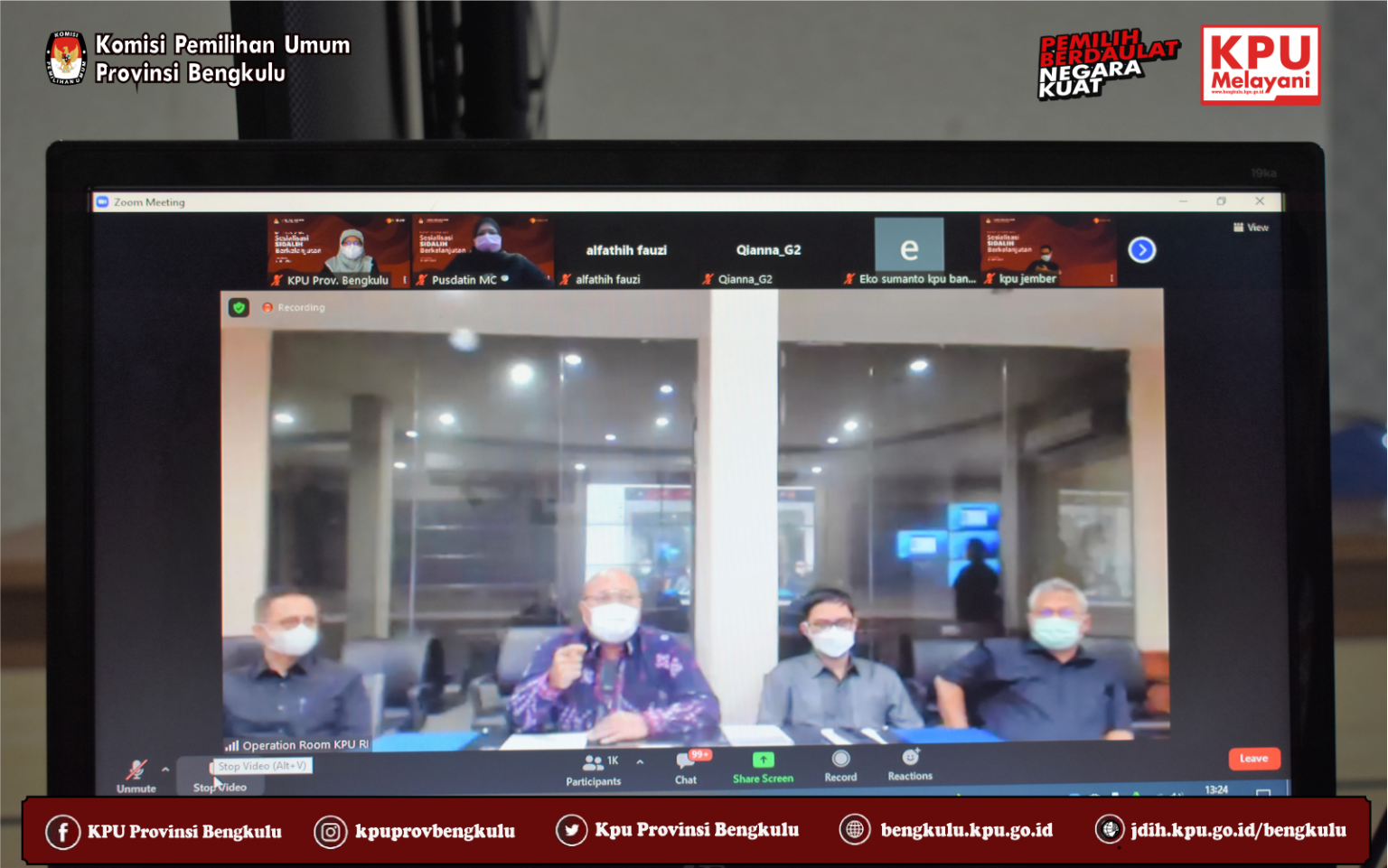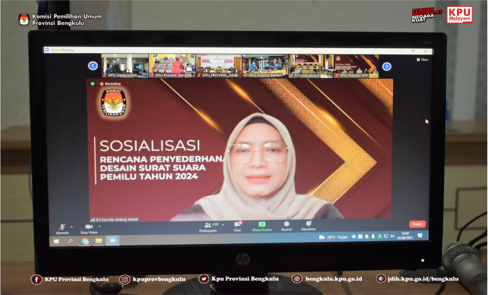 Anggota KPU Provinsi Bengkulu Siti Baroroh dan Sekretaris Kemas M Ajir mengikuti Sosialisasi Rencana Penyederhanaan Desain Surat Suara Pemilu Tahun 2024 yang dilaksanakan secara daring (zoom meeting) oleh KPU Republik Indonesia pada Selasa (24/8). Acara ini diikuti KPU Provinsi dan KPU Kabupaten/Kota Se-Indonesia. Acara yang dibuka langsung oleh Ketua KPU RI Ilham Saputra dan penyampaian materi dari Anggota KPU RI Evi Novida Ginting Manik, Viryan, I Dewa Kade Wiarsa Raka Sandi, Pramono Ubaid Tanthowi, dan Hasyim Asy’ari.