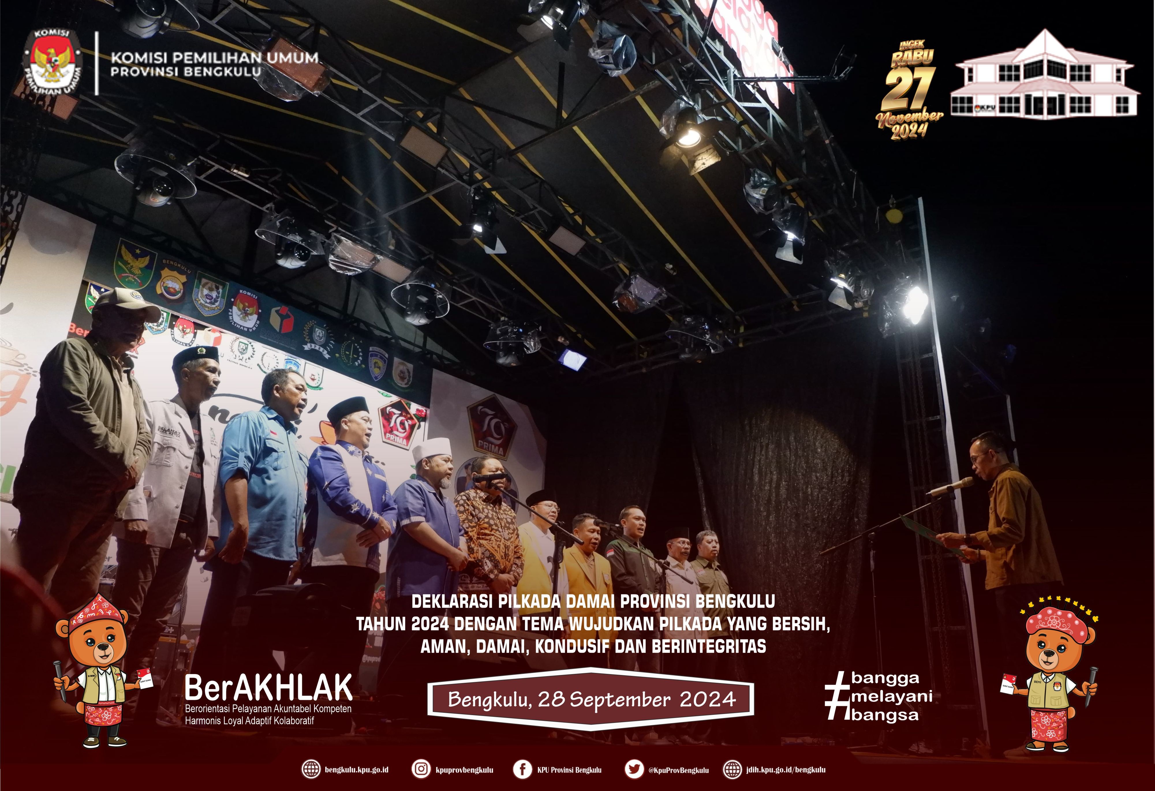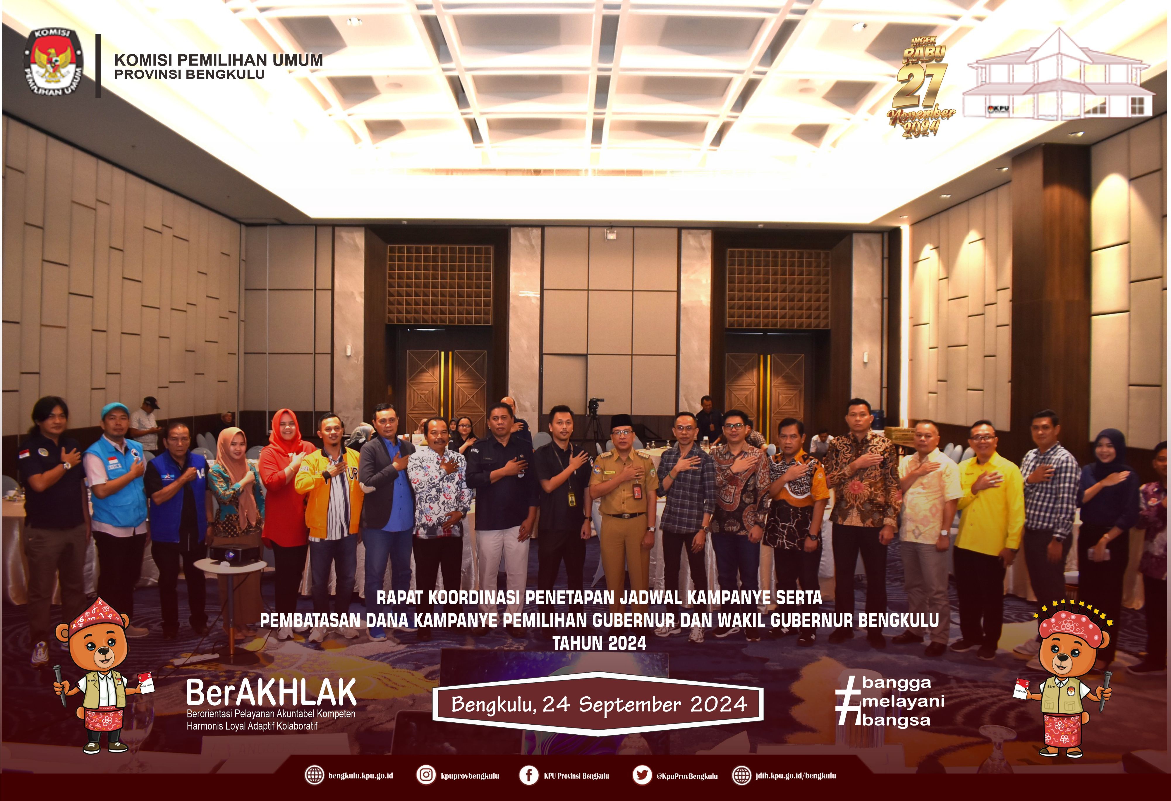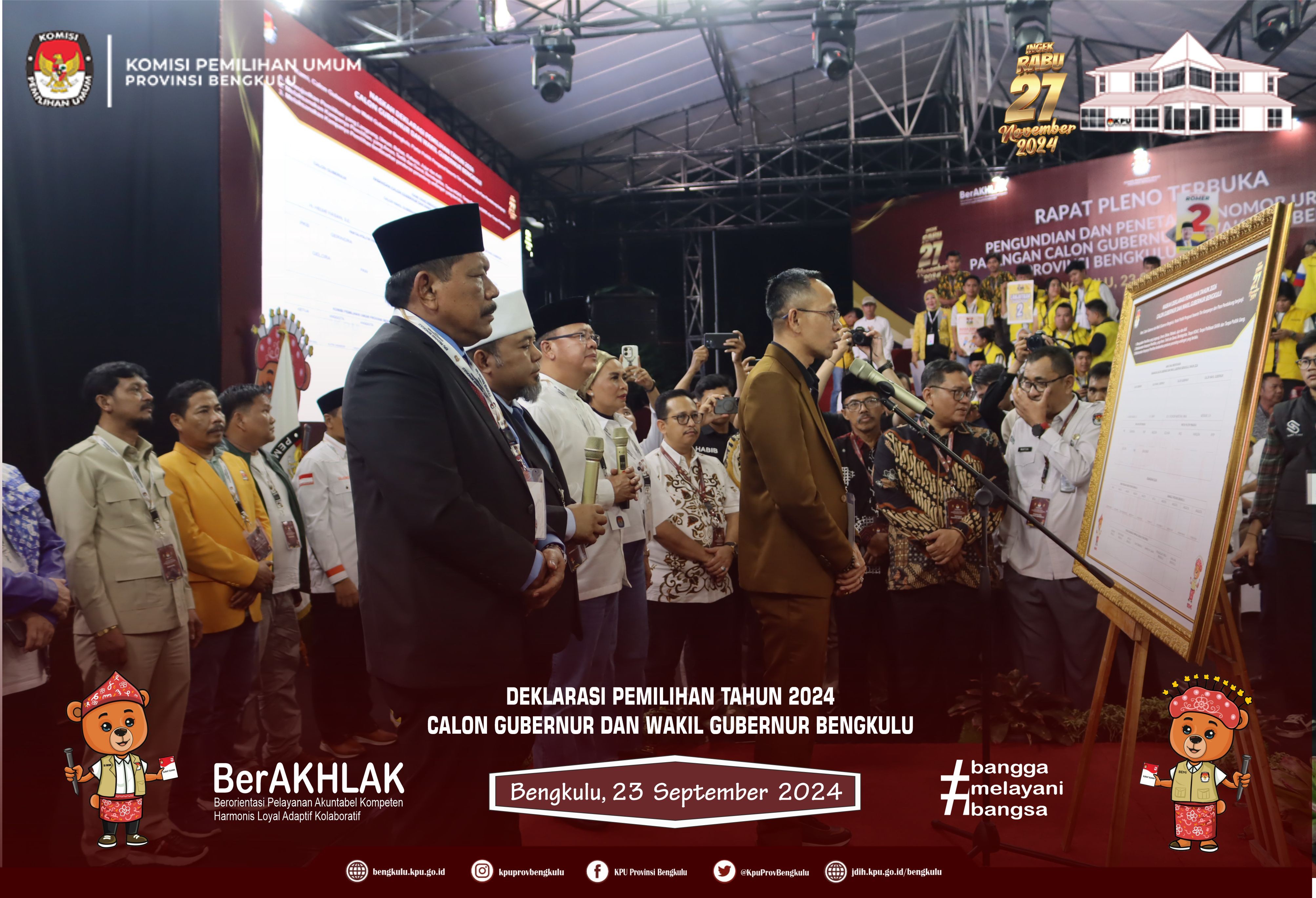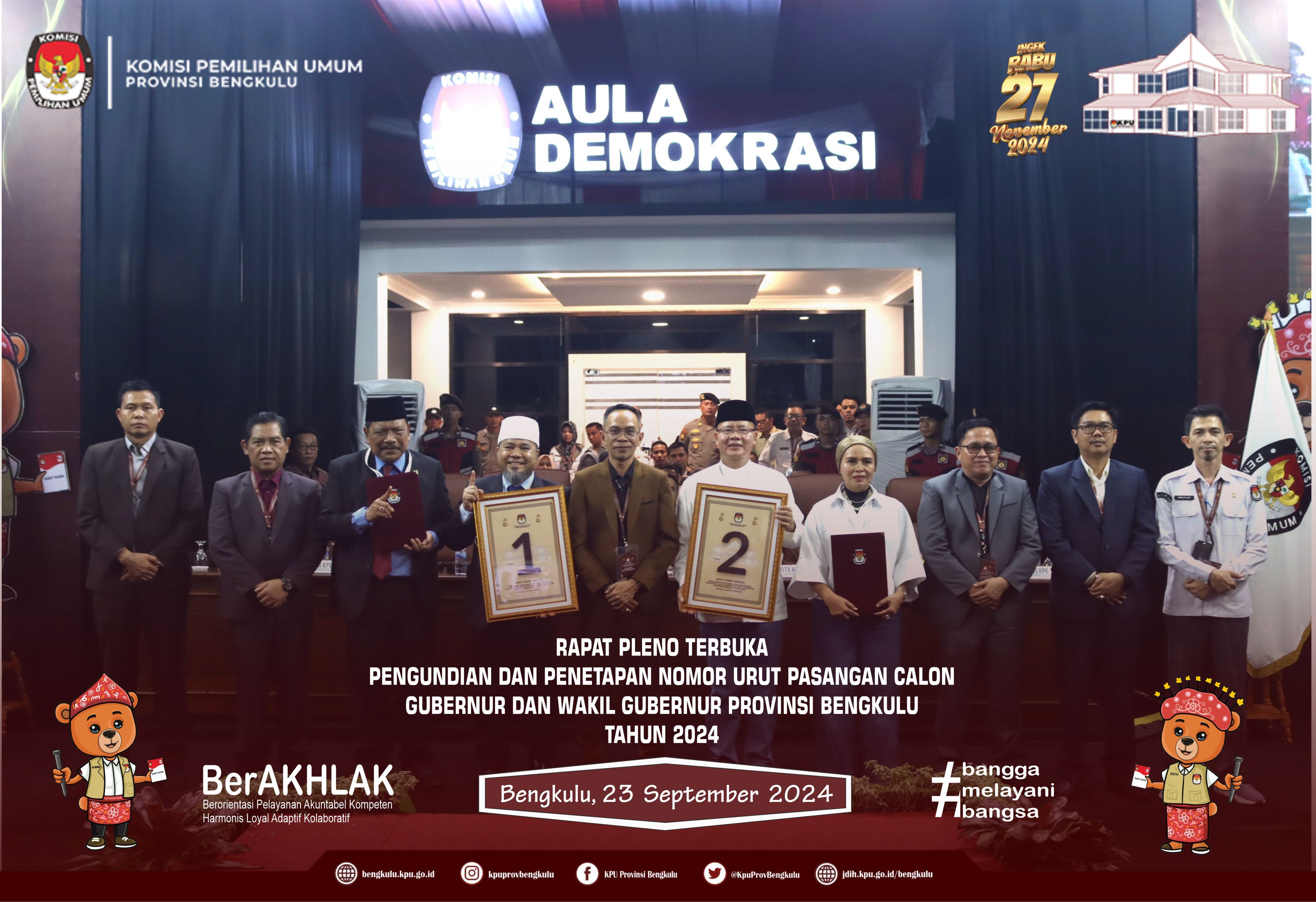 Bengkulu, bengkulu.kpu.go.id - Ketua KPU Provinsi Bengkulu Bapak Rusman Sudarsono, Anggota KPU Provinsi Bengkulu Bapak Alpin Samsen, Bapak Dodi Hendra Supiarso, Bapak Emex Verzoni dan Bapak Sarjan Efendi serta Sekretaris Kemas Mohammad Ajir membuka sekaligus memimpin Rapat Pleno Terbuka Pengundian dan Penetapan Nomor Urut Pasangan Calon Gubernur dan Wakil Gubernur Provinsi Bengkulu Tahun 2024, Senin (23/9/2024) di Halaman Kantor KPU Provinsi Bengkulu. Hadir Gubernur Bengkulu yang diwakil oleh Sekda Provinsi Bengkulu, Unsur Forkompinda meliputi DPRD Provinsi, Kapolda, Kejati, Danrem 041 Gamas, Pengadilan Tinggi, dan Lanal, Tim Pelaksana Kegiatan Pendaftaran, Penelitian Persyaratan, dan Penetapan Pasangan Calon Gubernur dan Wakil Gubernur dalam Pemilihan Serentak Tahun 2024, Bawaslu Provinsi, KPID, KIP, Pasangan Calon H. Helmi Hasan, SE - Ir. H. Mian ditetapkan Nomor Urut 1 dan Pasangan Calon Dr. H. Rohidin Mersyah, MMA - Meriani, SH,, Partai Politik Pengurus dan Pendukung serta Awak Media. Pelaksanaan rapat pleno terbuka berjalan aman dan lancar, dimana hasilnya menetapkan Nomor Urut 1 untuk Pasangan H. Helmi Hasan, SE - Ir. H. Mian dan Nomor Urut 2 untuk Pasangan Calon Dr. H. Rohidin Mersyah, MMA - Meriani, SH. Hasil Pleno dituangkan ke dalam Berita Acara dan Keputusan KPU Provinsi Bengkulu Nomor 57 Tahun 2024 tentang Penetapan Nomor Urut Pasangan Calon Peserta Pemilihan Gubernur dan Wakil Gubernur Bengkulu Tahun 2024.