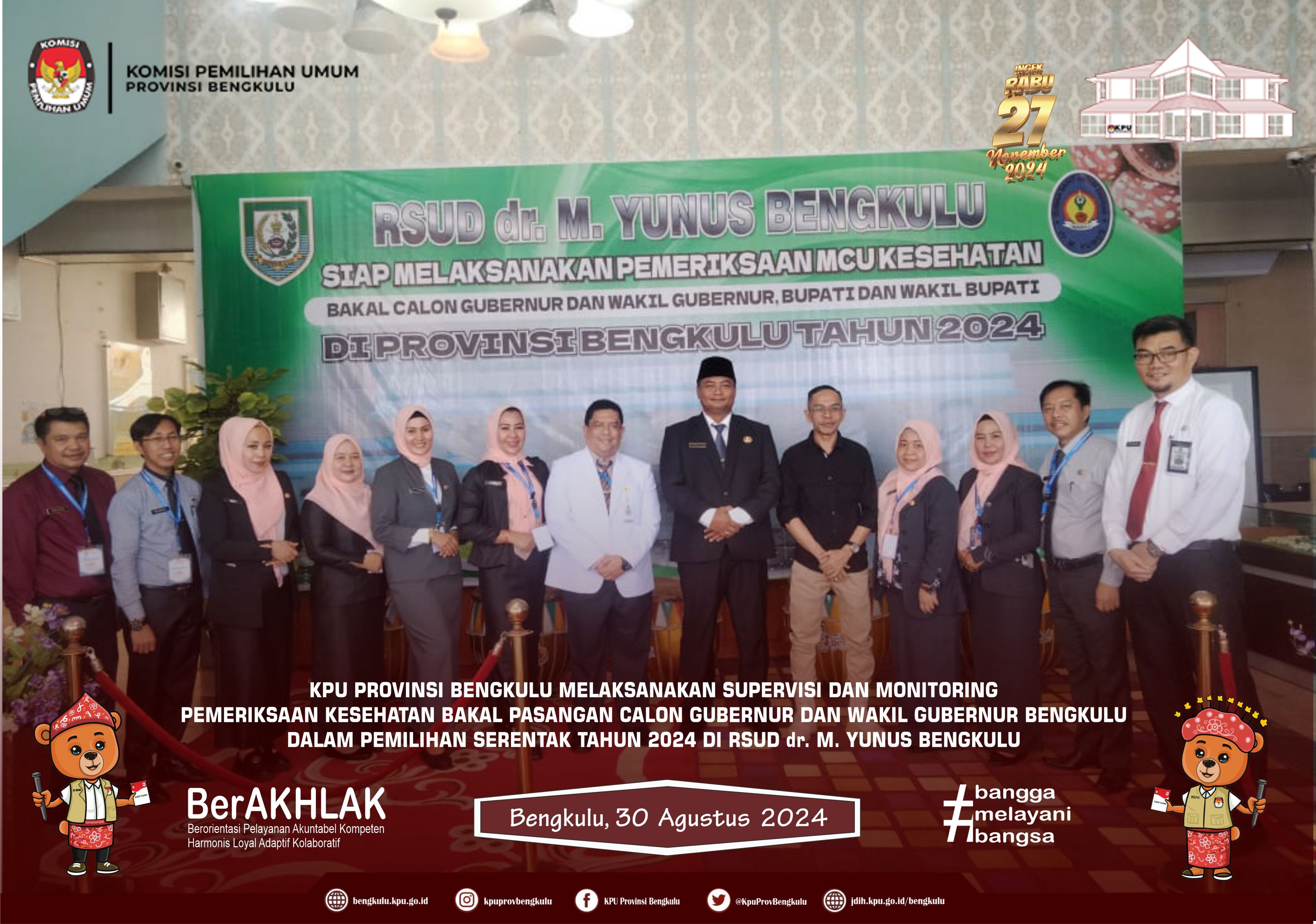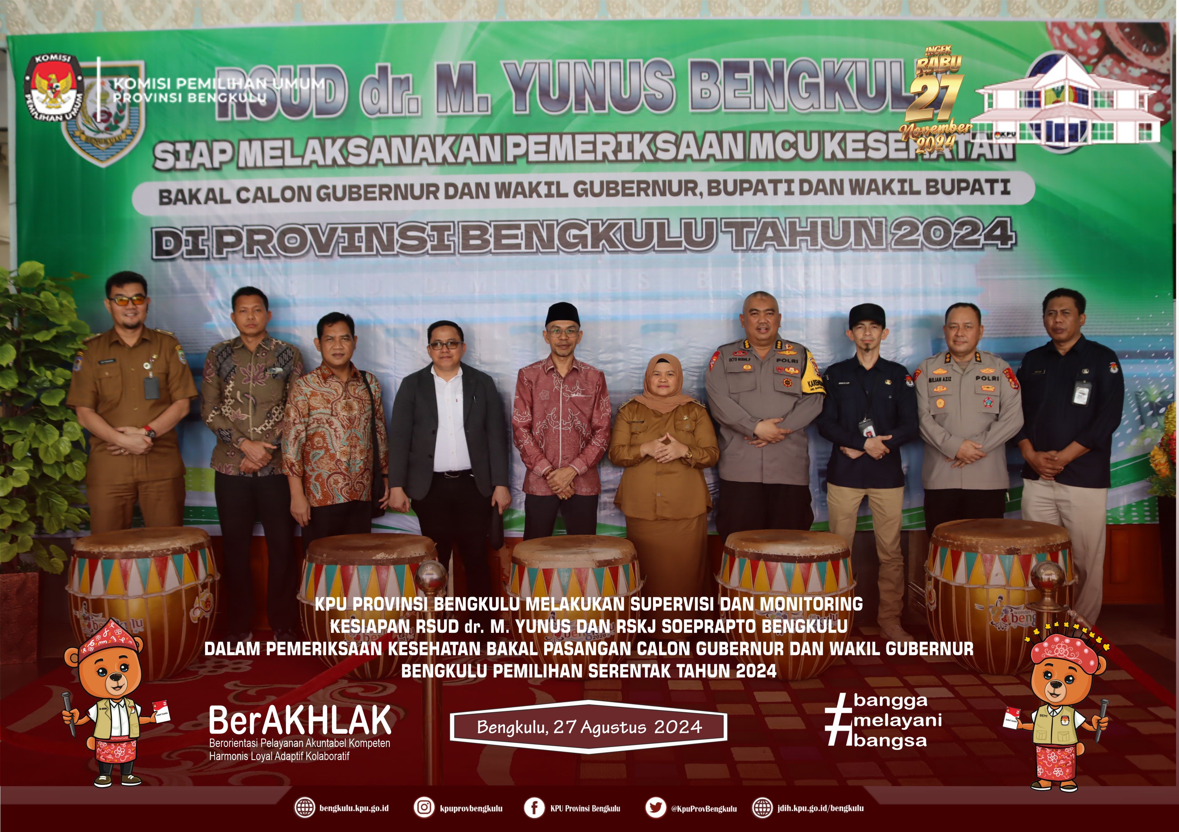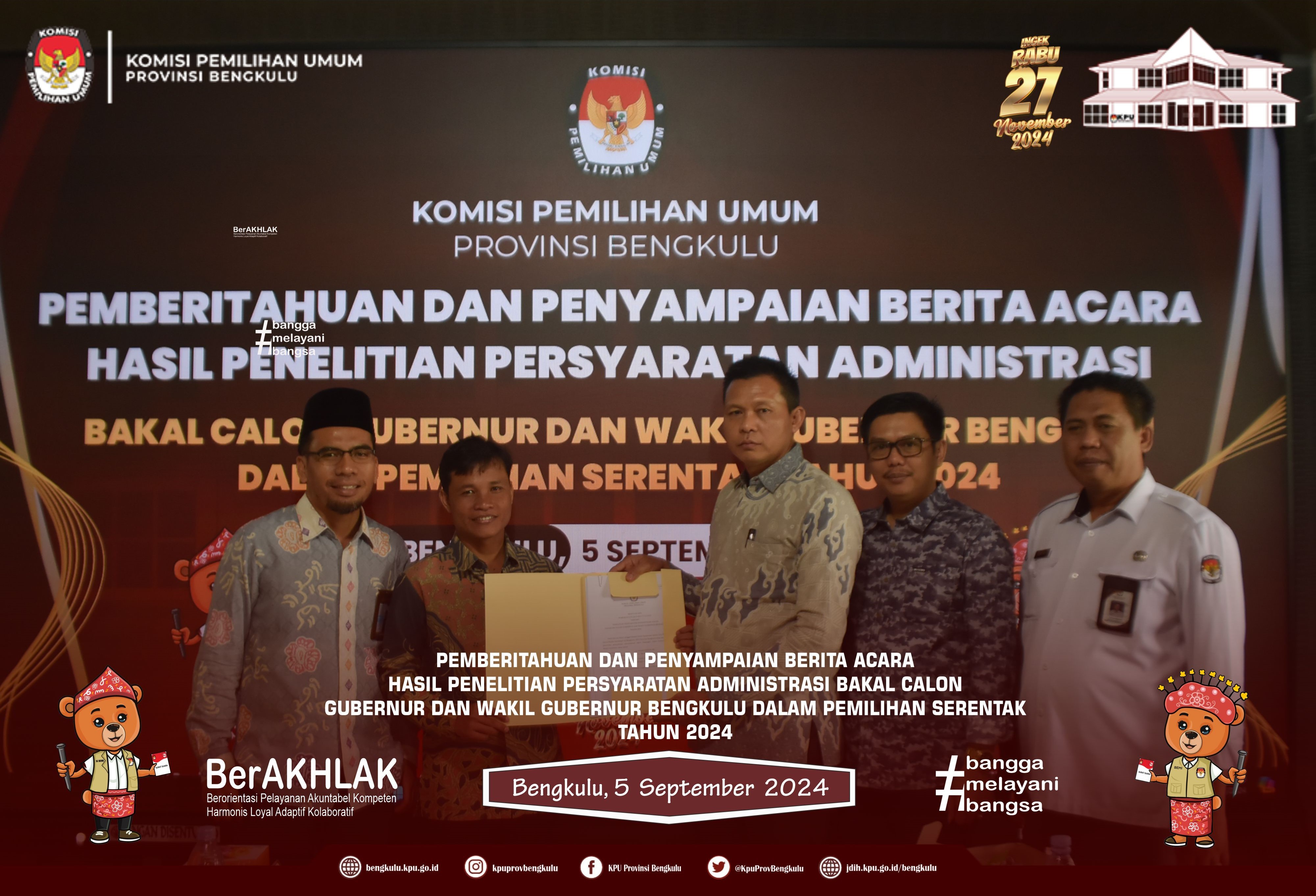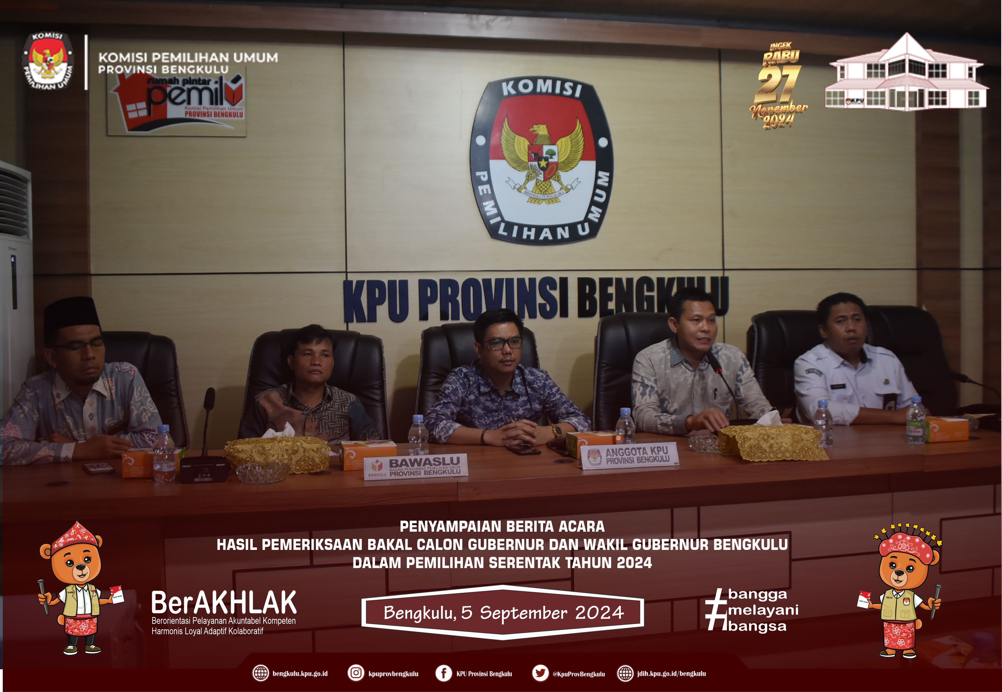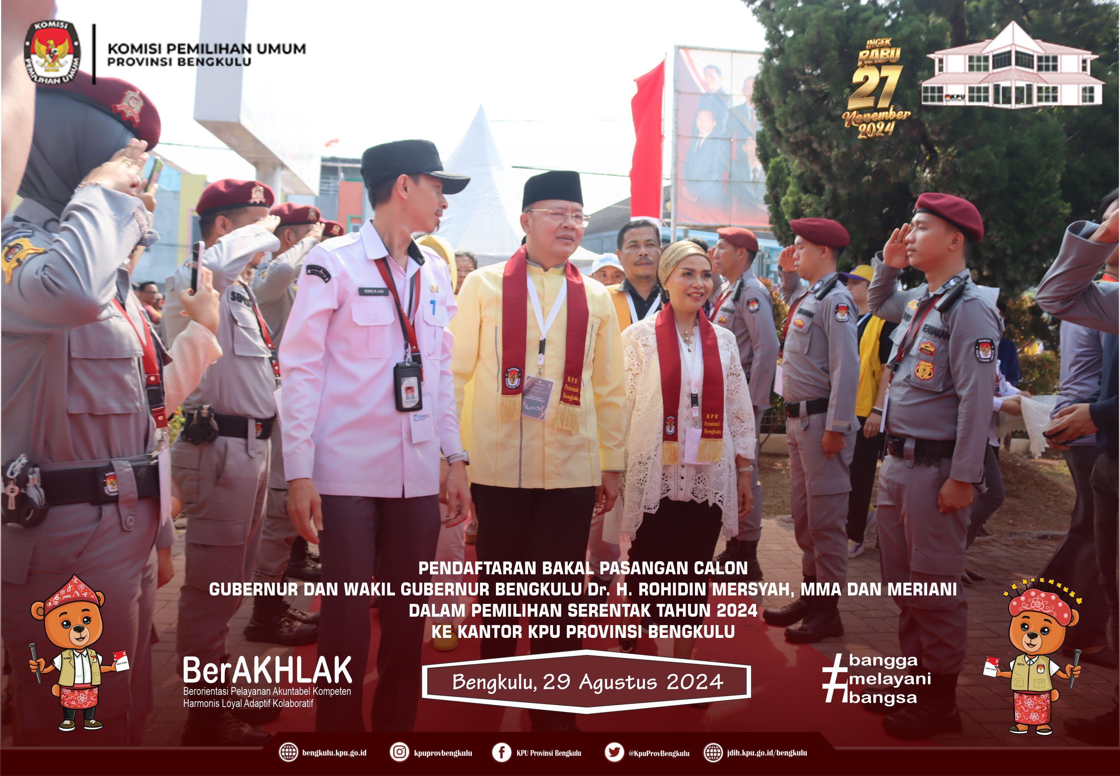 Bengkulu, bengkulu.kpu.go.id - KPU Provinsi Bengkulu Menerima Pendaftaran Bakal Pasangan Gubernur dan Wakil Gubernur Bengkulu Dalam Pemilihan Serentak Tahun 2024, Kamis (29/8/2024), di Aula DePemokrasi KPU Provinsi Bengkulu. Rombongan Bakal Pasangan Calon Bapak Dr. H. Rohidin Mersyah, MMA dan Ibu Meriani bersama Pimpinan Partai Politik Pengusul disambut Ketua KPU Provinsi Bengkulu Bapak Rusman Sudarsono bersama Anggota KPU Provinsi Bengkulu Bapak Alpin Samsen, Bapak Dodi Hendra Supiarso, Bapak Emex Verzoni dan Bapak Sarjan Efendi serta Sekretaris Bapak Kemas Mohammad Ajir. Hadir Ketua Bawaslu Provinsi Bengkulu Bapak Fahamsyah dan Anggota Bawaslu Provinsi Bengkulu Bapak Eko Sugianto, Bapak Asmara Wijaya, serta Bapak Debisi Ilhodi dan Kapolda Bengkulu Bapak Irjen. Pol. Anwar, S.IK.,M.Si. Acara dibuka dengan menyanyikan Lagu Kebangsaan Indonesia Raya dan Jingle Pemilihan Serentak Provinsi Bengkulu, Sambutan Perwakilan Bakal Pasangan Calon disampaikan oleh Bapak Sumardi yang menyampaikan bahwa hari ketiga ini Dr. H. Rohidin Mersyah, MMA dan Ibu Meriani mendaftar ke KPU Provinsi Bengkulu dengan diusung 8 (tujuh) partai politik, yaitu GOLKAR, HANURA, PKS, PPP, PBB, PSI, GARUDA dan PERINDO kemudian dilanjutkan dengan penyerahan dokumen syarat pencalonan dan syarat bakal calon kepada Ketua KPU Provinsi Bengkulu. Sambutan Bakal Calon Gubernur Bapak Dr. H. Rohidin Mersyah, MMA menyampaikan ucapan terima kasih dan apresiasi kepada KPU Provinsi Bengkulu yang telah menerima pendaftaran bakal pasangan calonDr. H. Rohidin Mersyah, MMA dan Ibu Meriani serta berharap ke depan penyelenggaraan pilkada berjalan dengan baik dan lancar. Sambutan Ketua KPU Provinsi Bengkulu Bapak Rusman Sudarsono menyampaikan bahwa jadwal pendaftaran bakal pasangan calon Gubernur dan Wakil Gubernur Bengkulu Dalam Pemilihan Serentak Tahun 2024 dimulai 27 s.d 29 Agustus 2024 dan pada hari terakhir bakal pasangan calon Dr. H. Rohidin Mersyah, MMA dan Ibu Meriani yang mendaftar ke KPU Provinsi Bengkulu. Setelah itu, Pengecekan dokumen syarat pencalonan dan syarat bakal calon oleh petugas pengecekan dan disaksikan oleh Bawaslu Provinsi Bengkulu kemudian ditutup dengan penyerahan cinderamata dan foto bersama.