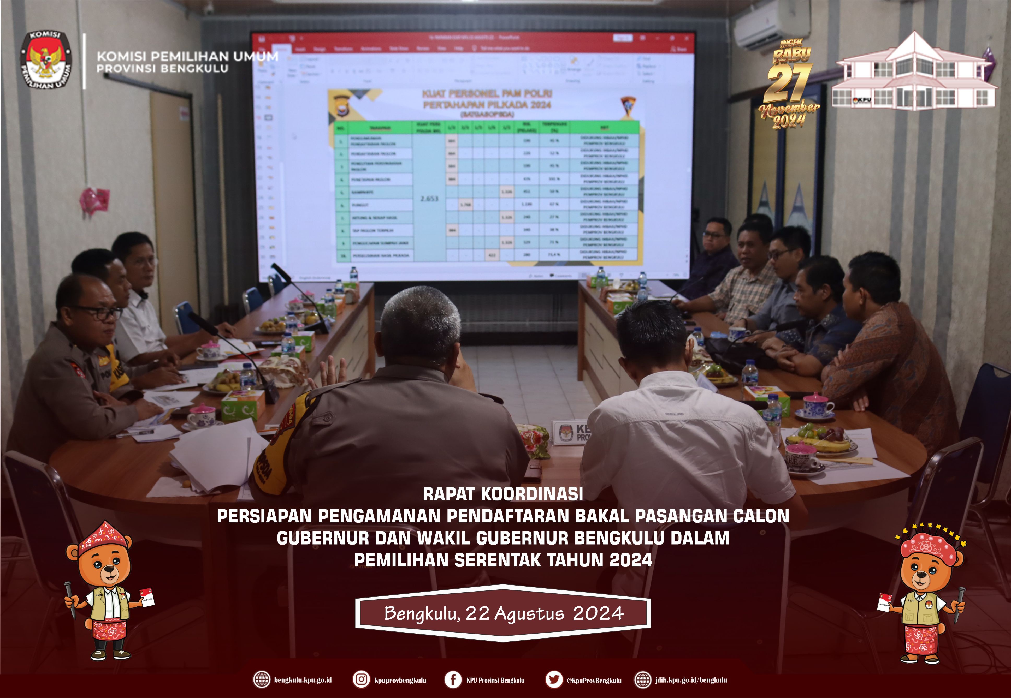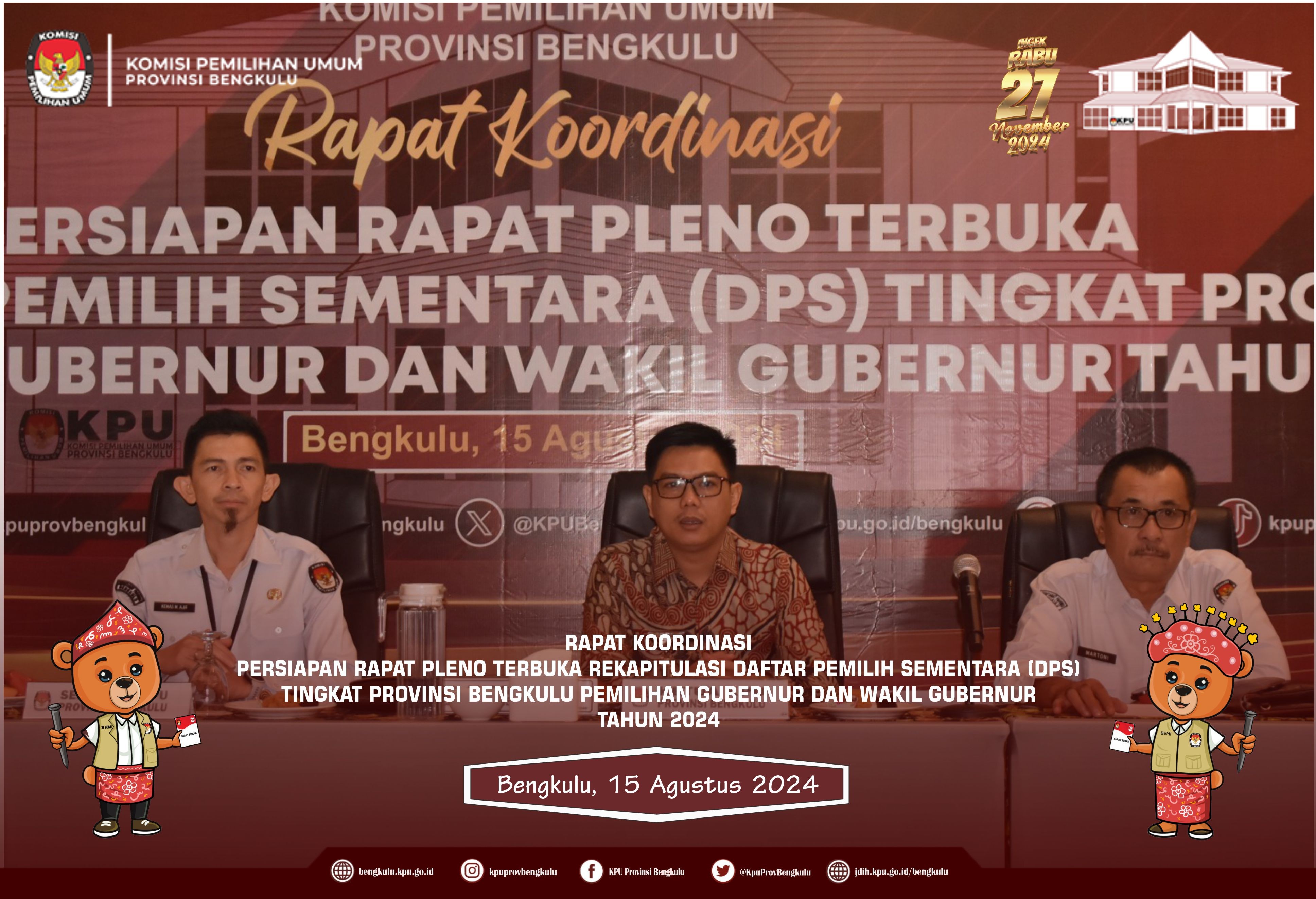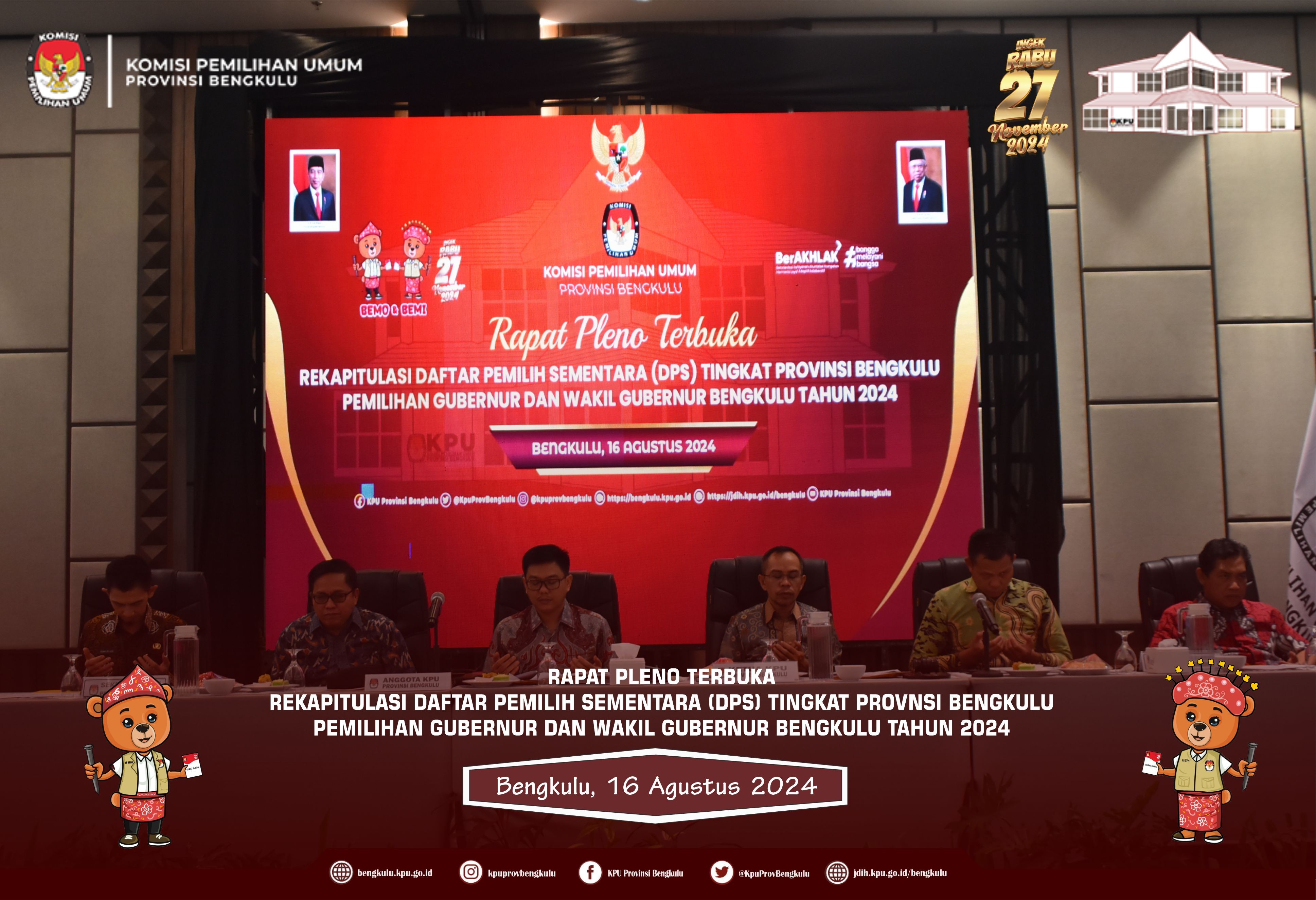 Bengkulu, bengkulu.kpu.go.id - Ketua KPU Provinsi Bengkulu Rusman Sudarsono bersama Anggota KPU Provinsi Bengkulu Alpin Samsen, Dodi Hendra Supiarso dan Emex Verzoni serta Sekretaris Kemas Mohamad Ajir membuka Rapat Pleno Terbuka Rekapitulasi Daftar Pemilih Sementara (DPS) Tingkat Provinsi Bengkulu Pemilihan Gubernur dan Wakil Gubernur Tahun 2024. Jum'at (16/2024) di Hotel Mercure Bengkulu. Hadir dalam rapat pleno terbuka yaknu KPU Kabupaten, Forkopimda diwkili asisten, Polda, Kajati. Korem 041 Gamas, Binda, Lanal, KPID, Kemenkumham, KIP, Pengadilan tinggi serta Partai Politik dan sebagainya. Bahwa berdasarkan Keputusan KPU Provinsi Bengkulu Nomor 35 Tahun 2024 tentang Rekapitulasi Daftar Pemilih Sementara (DPS) Provinsi Bengkulu dalam penyelenggaraan Pemilihan Gubernur dan Wakil Gubernur Tahun 2024. Jumlah DPS Provinsi Bengkulu sebanyak 1.506.003 pemilih dengan rincian laki-laki sebanyak 760.265 dan perenpuan sebanyak 745.738 pemilih yang tersebar pada 129 kecamatan, 1.513 desa/kelurahan dan 3.451 TPS. KPU Provinsi Bengkulu menyerahkan Hasil Rekapitulasi DPS kepada Parpol dan Instansi terkait serta Bawaslu Provinsi Bengkulu.