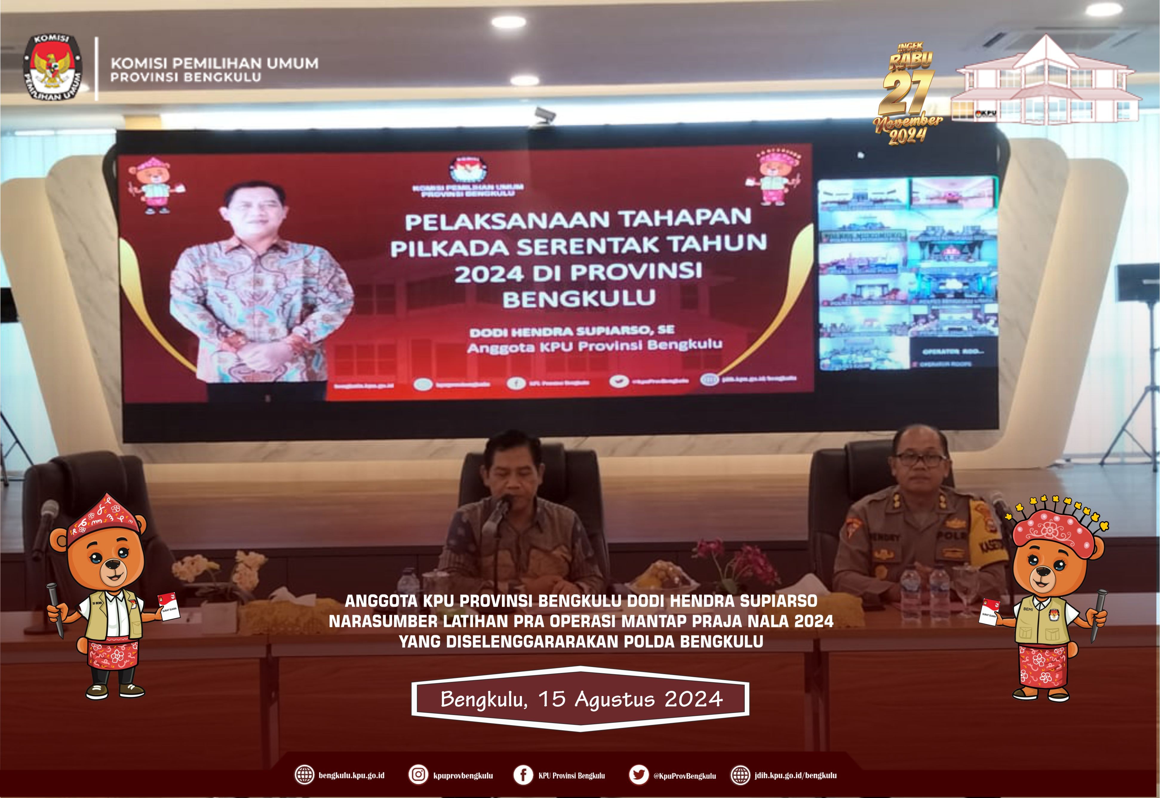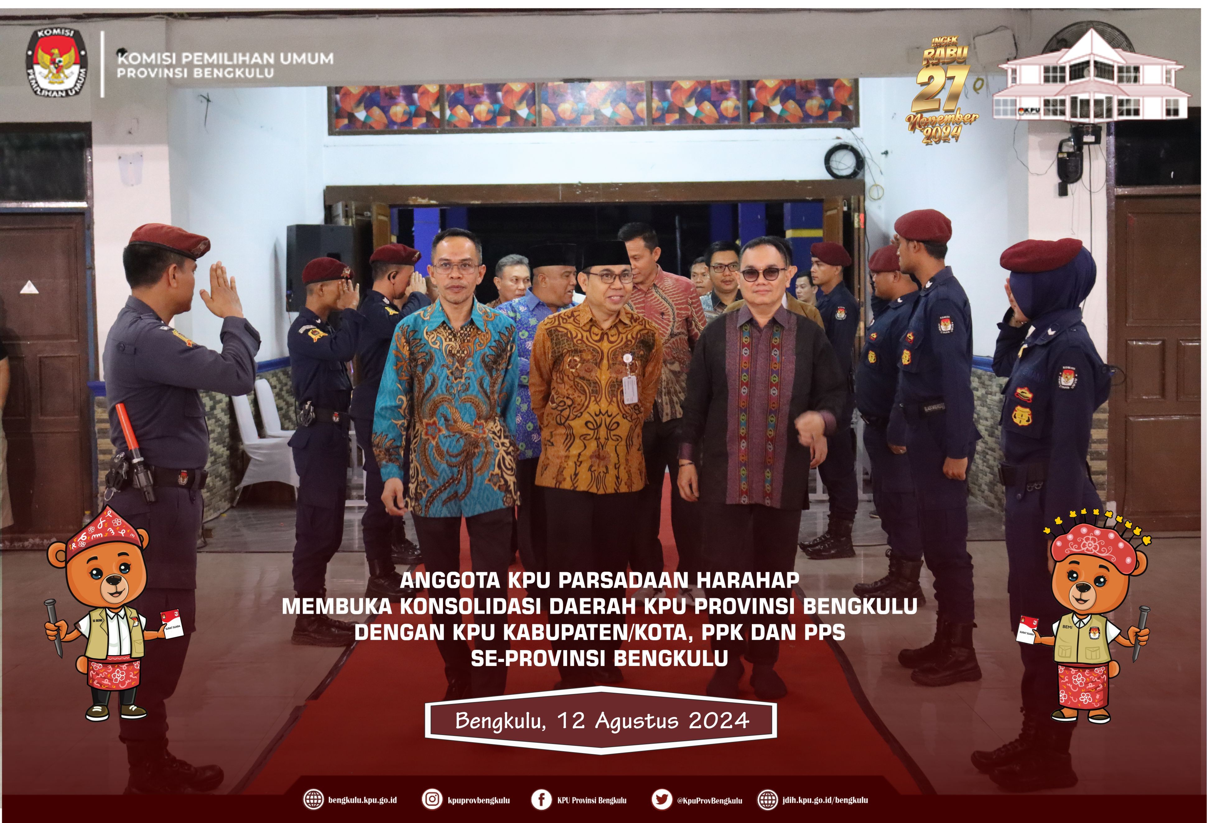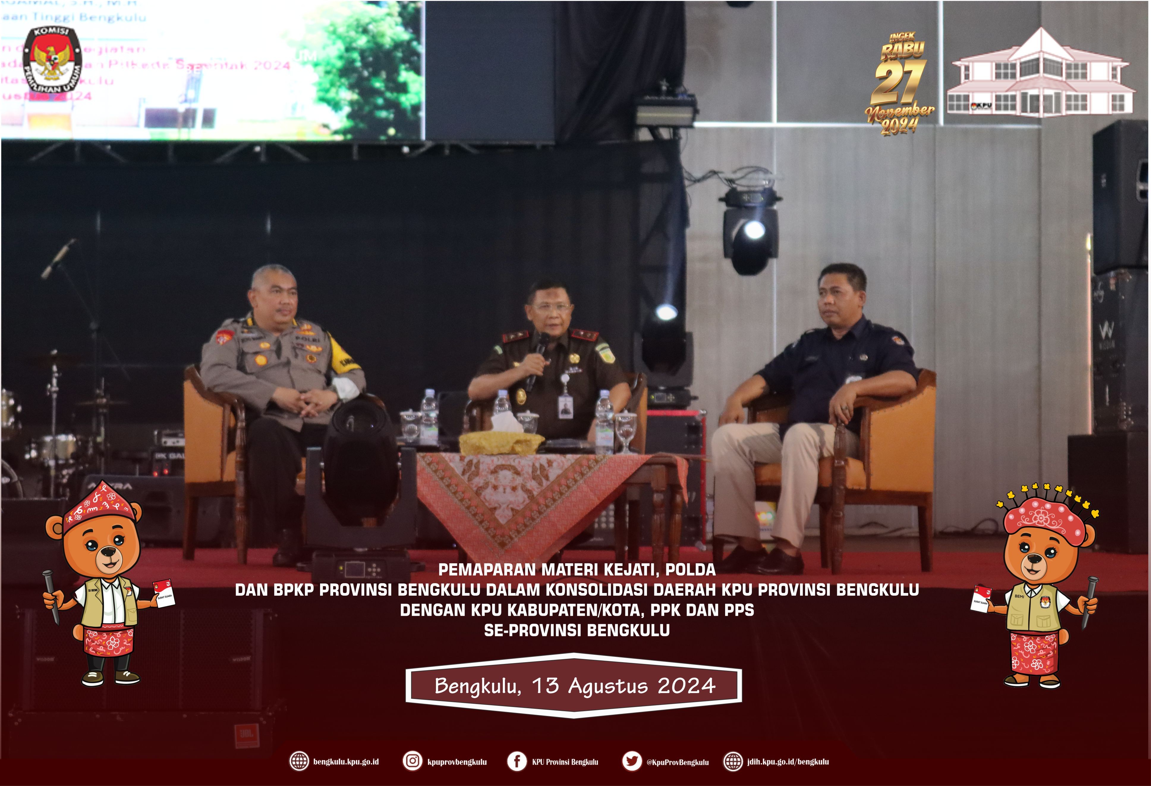 Bengkulu, bengkulu.kpu.go.id - Hari Kedua Selasa (13/8/2024) Konsolidasi Daerah KPU Provinsi dengan KPU Kabupaten/Kota, PPK dan PPS se-Provinsi Bengkulu dilanjutkan dengan pemaparan materi dari Anggota KPU Provinsi Bengkulu Bapak Alpin Samsen dan Bapak Sarjan Efendi, Kepala Kejaksaan Tinggi Bengkulu Bapak Syaifudin Tagamal, SH.,MH, Kepala Biro Operasi (Roops) Polda Bengkulu Bapak Kombes Pol. Octo Budhi Prasetyo S.IK, M.M, dan Koordinator Pengawasan Kelompok JFA Bidang Instansi Pemerintah Pusat BPKP Perwakilan Provinsi Bengkulu Bapak Muzakkir, SE., Ak., M.Bus (Acc), CA., CRGP, CRMP. Alpin menyampaikan ucapan terima kepada jajaran KPU Kabupaten/Kota, PPK dan PPS yang telah menetapkan Daftar Pemilih Sementara (DPS) dan menjelaskan mekanisme pemutakhiran data pemilih Pilkada 2024, Sarjan menegaskan agar seluruh penyelenggara pemilihan KPU Kabupaten/Kota, PPK dan PPS bekerja secara profesional, solid, dan berintegritas dalam melaksanakan tahapan pilkada 2024 secara baik sesuai dengan regulasi yang ada, Muzakkir menyampaikan materi SPIP dan Manajemen Risiko Pertanggungjawaban Keuangan, Syaifudin menjelaskan materi Pencegahan Korupsi dalam Pengelolaan Keuangan Negara Terkait Pengelolaan Anggaran Penyelenggaraan Pilkada 2024, dan Octo menjelaskan materi Kesiapan Polda Bengkulu dalam Pengamanan Pilkada Tahun 2024 di Wilayah Hukum Polda Bengkulu. Selain materi acara juga diisi dengan diskusi tanya jawab dan pemberian doorpize.
