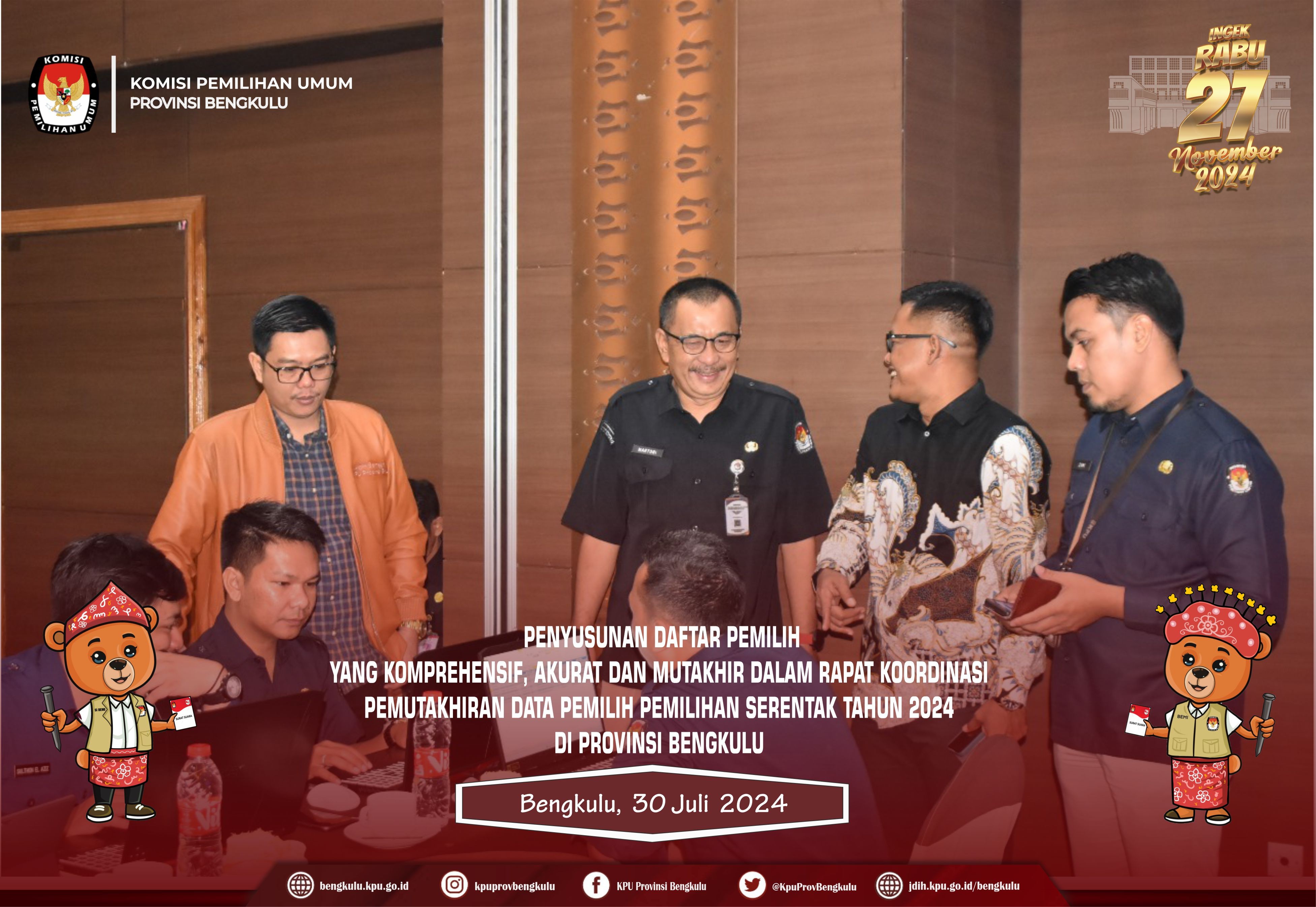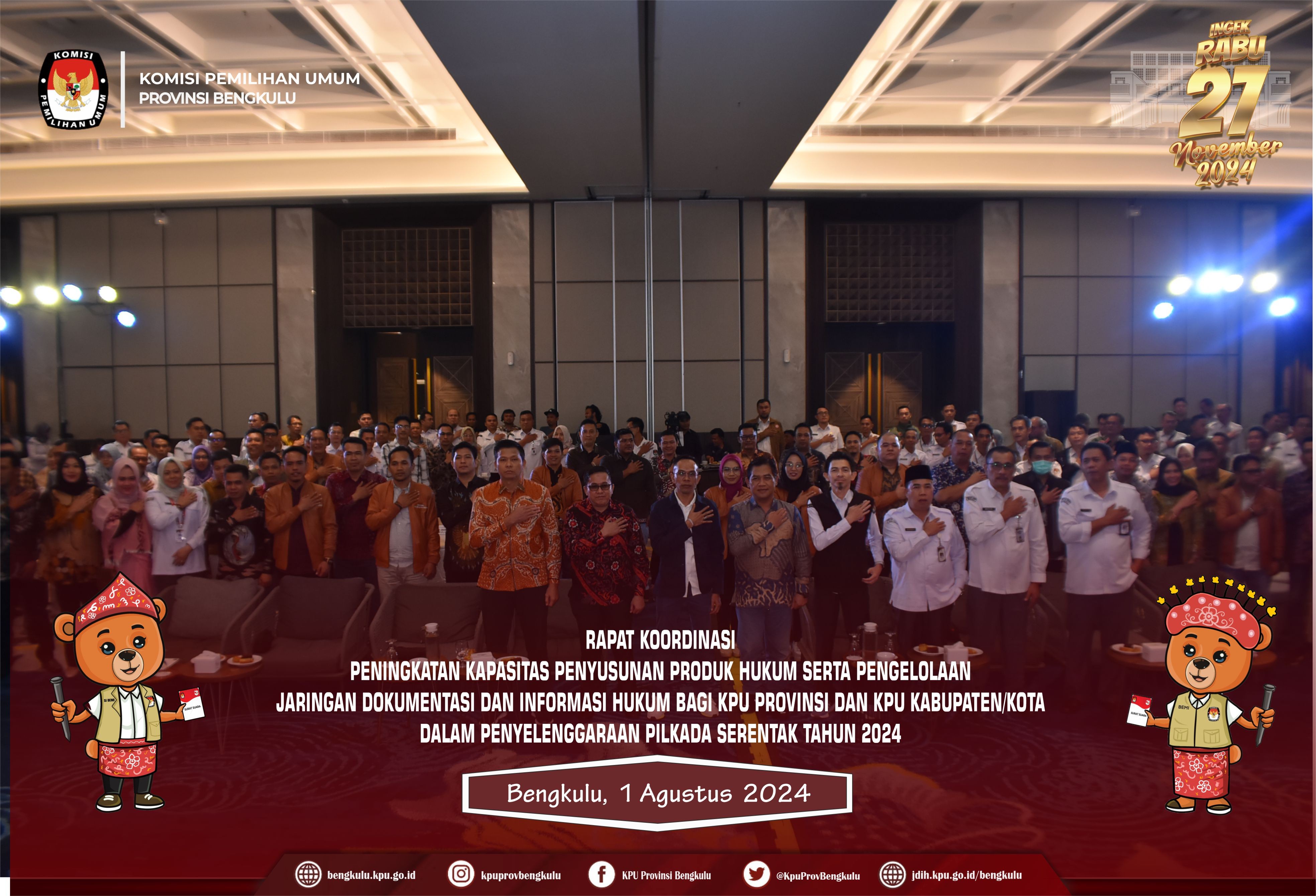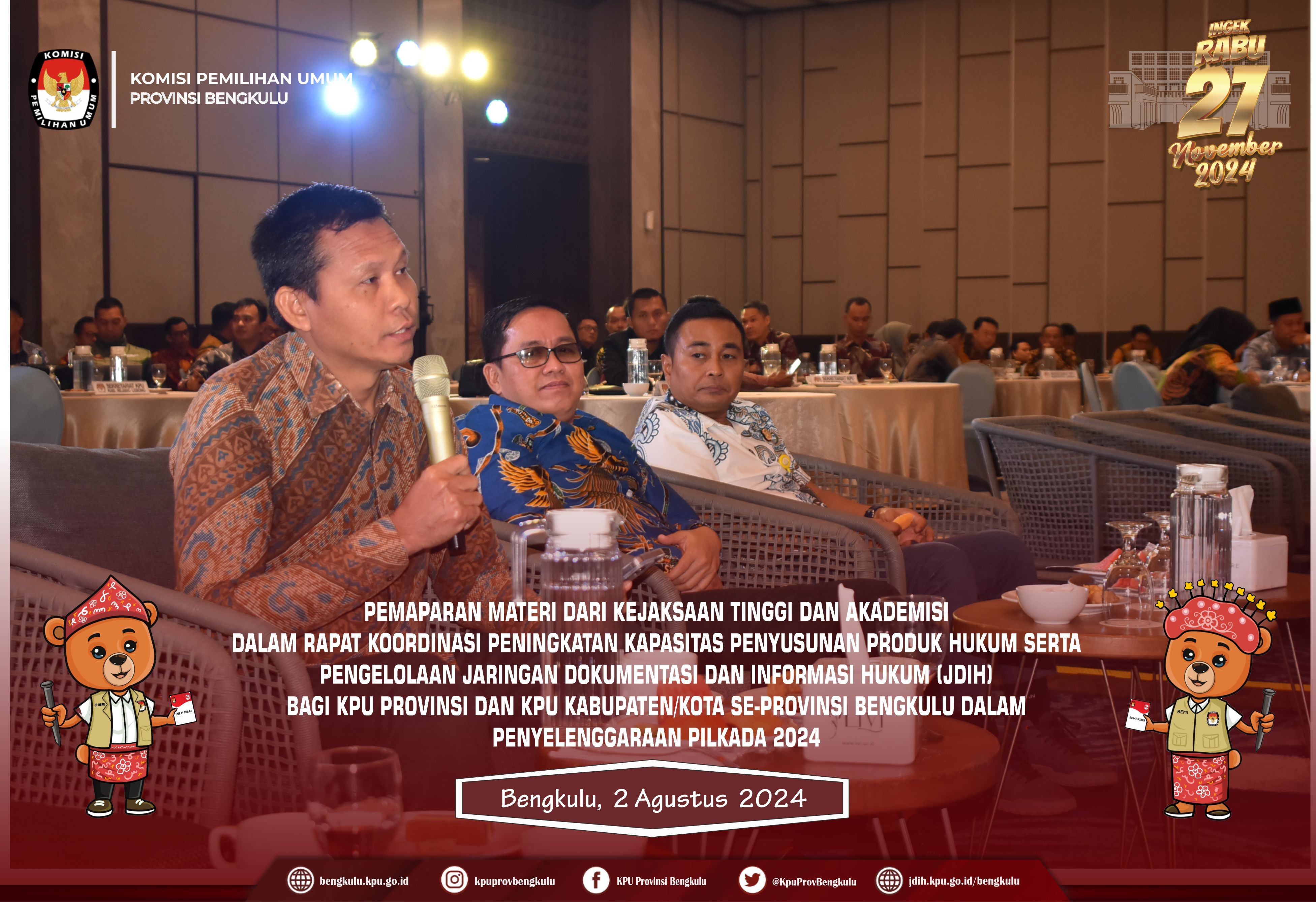 Bengkulu, bengkulu.kpu.go.id - Ketua KPU Provinsi Bengkulu Bengkulu Rusman Sudarsono, Anggota KPU Provinsi Bengkulu Alpin Samsen, Dodi Hendra Supiarso, Emex Verzoni dan Sarjan Efendi serta Sekretaris Kemas Mohammad Ajir membuka Rapat Koordinasi Peningkatan Kapasitas Penyusunan Produk Hukum serta Pengelolaan Jaringan Dokumentasi dan Informasi Hukum (JDIH) bagi KPU Provinsi dan KPU Kabupaten/Kota se-Provinsi Bengkulu dalam penyelenggaraan Pilkada Serentak 2024, Kamis (1/8/2024) di Hotel Mercure Bengkulu. Rusman menegaskan bahwa rapat koordinasi dilaksanakan dalam rangka meningkatkan pemahaman dan pengetahuan mengenai penyusuan produk hukum dan pengelolaan JIDH yang baik sesuai dengan standar pengelolaan JDIH KPU RI. Untuk itu, Rusman meminta kepada seluruh peserta untuk mengikuti kegiatan ini dengan serius dan sungguh-sunggu. Acara dilanjutkan dengan Penyampaian materi dari Biro Hukum Bagian Perundang-undangan dan Informasi Hukum Setjen KPU RI Evi Yulianda dan Khalisa Magfira Putri. Klaisa menjelaskan materi Teknik Penyusunan Keputusan di Lingkungan KPU, KPU Provinsi dan KPU Kabupaten/Kota sedangkan Evi menjelaskan materi Pengelolaan Jaringan Dokumentasi dan Informasi Hukum (JDIH). Emex dalam arahannya menegaskan bahwa perlu dilakukan langkah konkrit dalam penataan dan pengelolaan JDIH KPU Provinsi dan JDIH KPU Kabupaten/Kota se-Provinsi Bengkulu yang baik dan sesuai dengan standar KPU RI. Hal itu ditambahkan Emex dilakukan dalam rangka mendukung KPU RI yang selama 5 (lima) tahun berturut-turut mendapatkan pengelolaan JDIH terbaik nasional sehingga harus ada upaya lebih JDIH di setiap satker lebih tertib dan berkesinambungan dalam rangka wujud keterbukaan infromasi kepada publik mengenai regulasi tahapan pemilu maupun pemilihan. Pengelolaan tersebut bukan hanya melalui website resmi JDIH tetapi media sosial harus dilakukan dengan menampilkan konten-konten kreatif dan inovatif. Sarjan menyampaikan usulan agar JDIH lebih aktif dan meminta KPU Provinsi Bengkulu untuk memantau dan mensupervisi pengelolaan JDIH di setiap satker. Hadir dalam kegiatan, Ketua, Anggota, Sekretaris, Kasubbag dan Operator JDIH KPU Kabupaten/Kota se-Provinsi Bengkulu