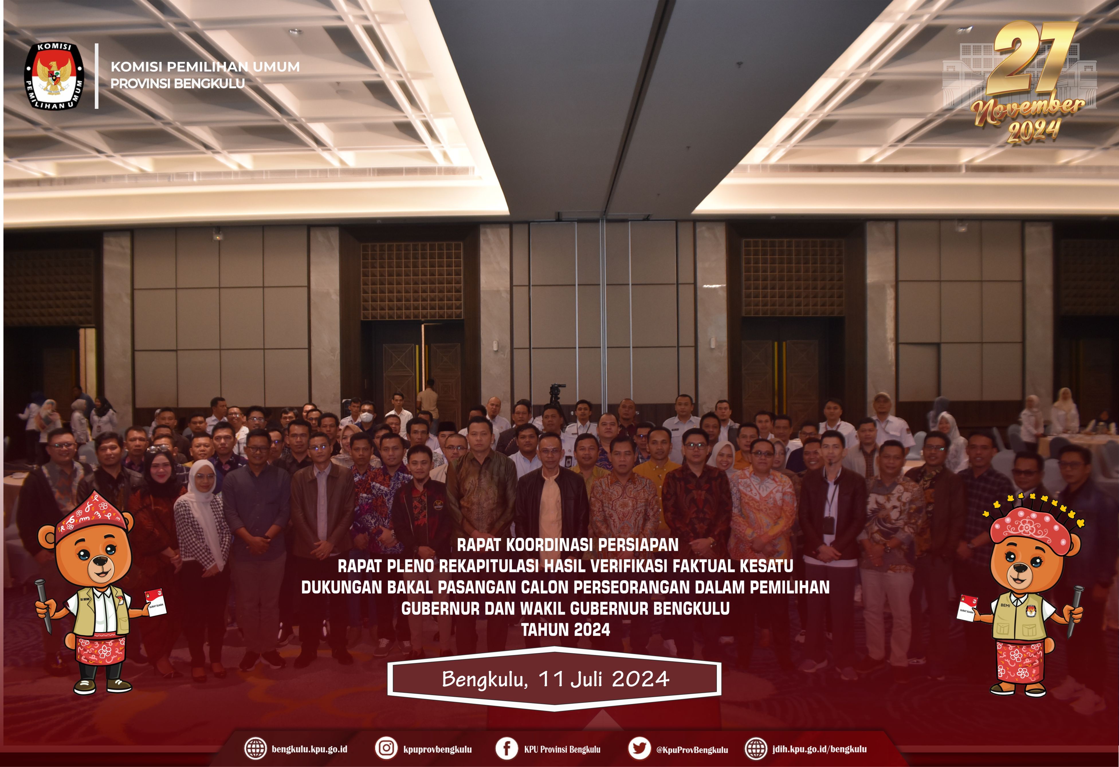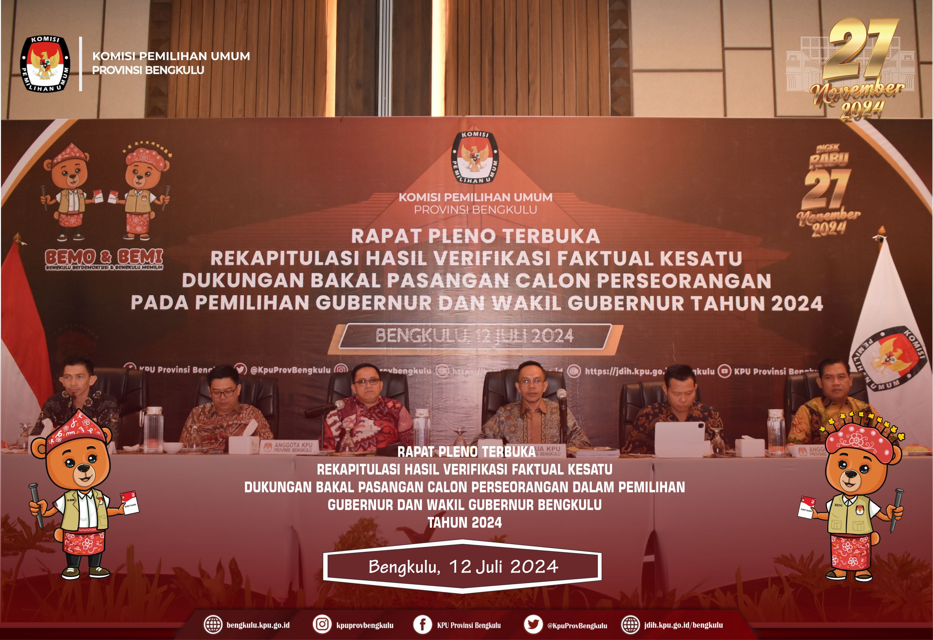 Bengkulu, bengkulu.kpu.go.id - Ketua KPU Provinsi Bengkulu Rusman Sudarsono didampingi Anggota KPU Provinsi Bengkulu Alpin Samsen, Dodi Hendra Supiarso, Emex Verzoni, dan Sarjan Efendi serta Sekretaris Kemas Mohammad Ajir membuka Rapat Pleno Rekapitulasi Hasil Verifikasi Faktual Kesatu Dukungan Bakal Pasangan Calon Perseorangan Pada Pemilihan Gubernur dan Wakil Gubernur Bengkulu Tahun 2024, Jum'at (12/7/2024) di Hotel Mercure Bengkulu. Rapat Terbuka dihadiri LO Bakal Pasangan Calon, Kejati,, Polda, Kesbangpol, Bawaslu Provinsi, Ketua, Anggota, Kasubbag Teknis Penyelenggaraan Pemilu Partisipasi dan Hubungan Masyarakat serta Operator Silon KPU Kabupaten/Kota se-Provinsi Bengkulu serta Anggota Bawaslu Kabupaten/Kota se-Provinsi Bengkulu. Rapat Pleno dibuka dengan menyanyikan Lagu Kebangsaan Indonesia Raya dan Jingle Pemilihan Gubernur dan Wakil Gubernu Bengkulu dan pembacaan doa. Setelah dibuka acara dilanjutkan dengan pembacaan tata Tertib dan Tata Cara Rapat Pleno Terbuka Rekapitulasi Hasil Verifikasi Faktual Kesatu Dukungan Bakal Pasangan Calon Perseorangan Pada Pemilihan Gubernur dan Wakil Gubernur Bengkulu Tahun 2024 yang dibacakan oleh Anggota KPU Provinsi Bengkulu Emex Verzoni dan Sarjan Efendi. Rapat Pleno dipimpin Ketua KPU Provinsi Bengkulu Rusman Sudarsono dimulai dengan KPU Kabupaten/Kota membacakan berita acara Rekapitulasi Hasil Verifikasi Faktual Kesatu Dukungan Bakal Pasangan Calon Perseorangan yang dinyatakan memenuhi syarat dan tidak memenuhi syarat secara bergantian melalui aplikasi Silon. Bahwa setelah itu, KPU Provinsi Bengkulu melakukan Rekapitulasi yang dituangkan ke dalam berita acara melalui generate Silon. Ketua KPU Provinsi Bengkulu Rusman Sudarsono menyampaikan berita acara rekapitulasi hasil verifikasi faktual kesatu bakal pasangn calon perseorangan kepada Petugas Penghubung dan Anggita Bawaslu Provinsi Bengkulu serta ditutup dengan foto bersama.