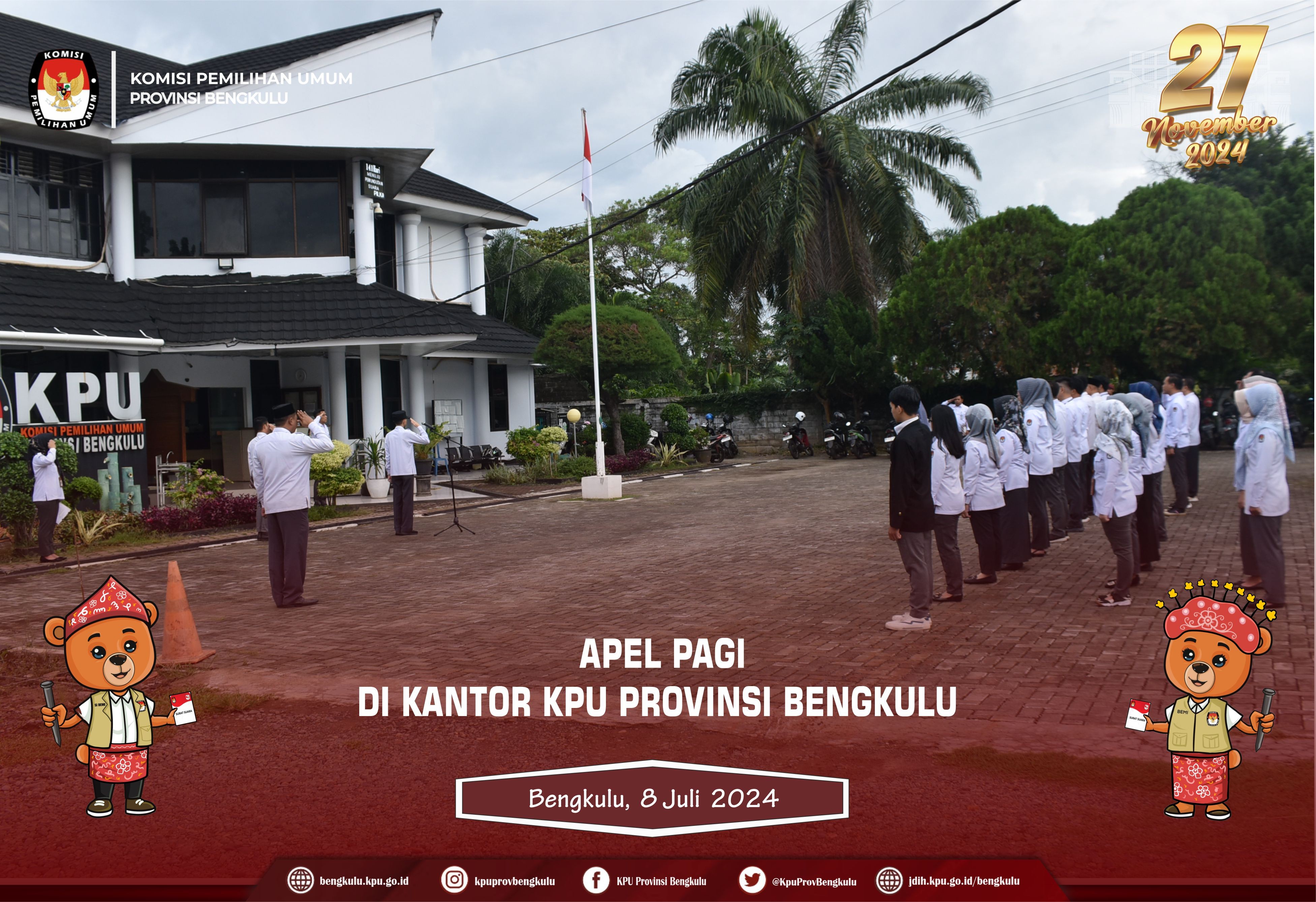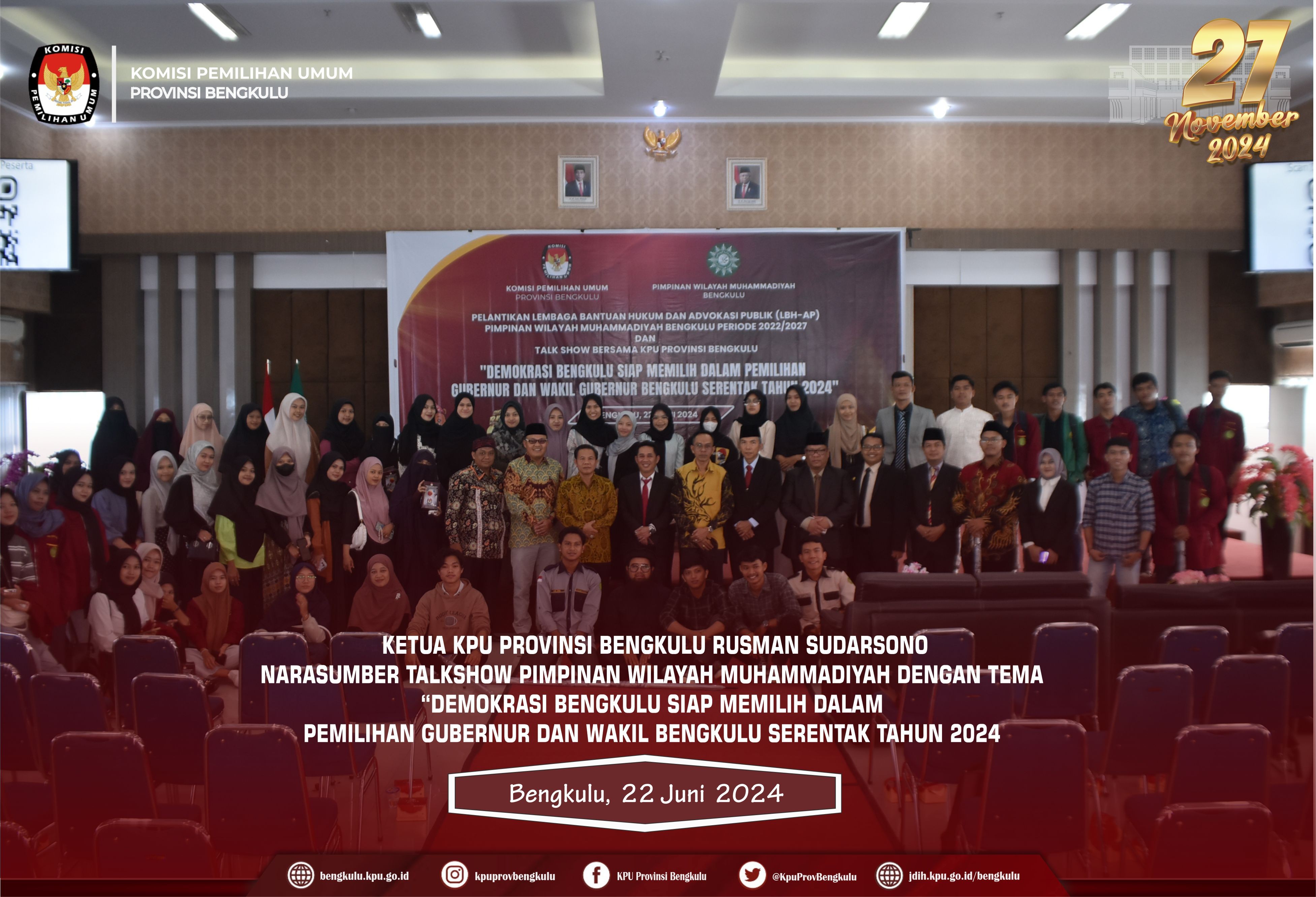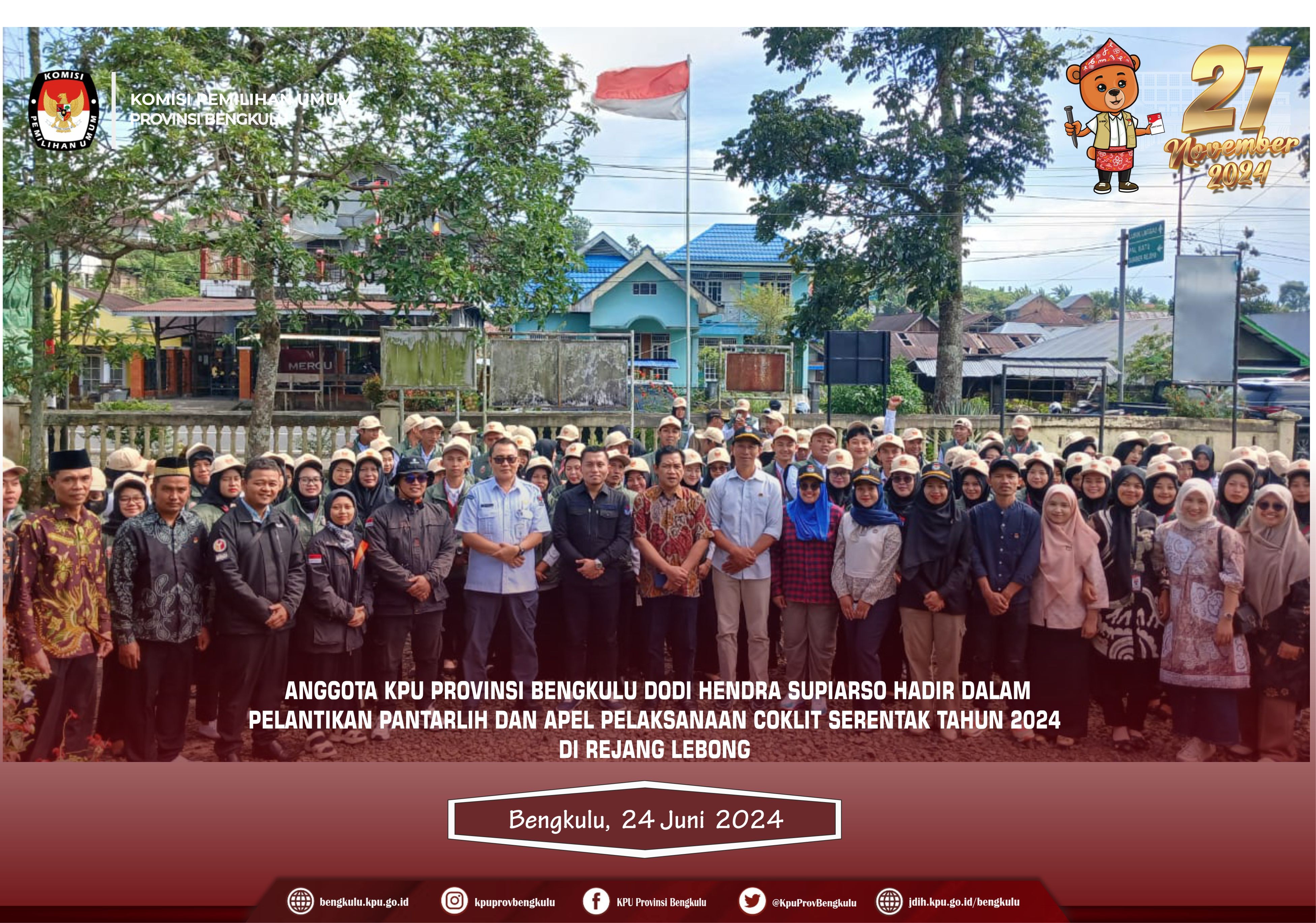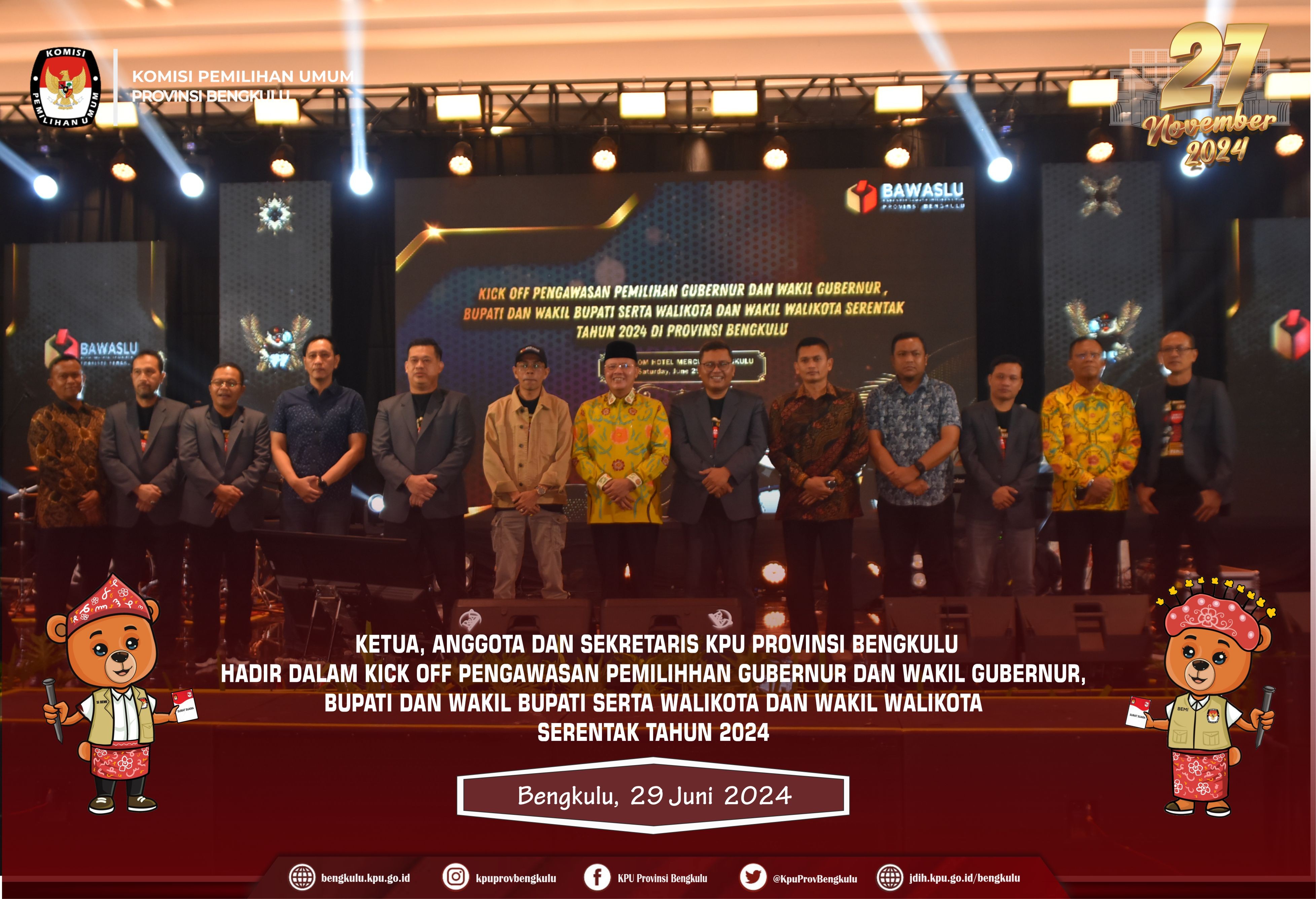 Bengkulu, bengkulu.kpu.go.id - Ketua KPU Provinsi Bengkulu Rusman Sudarsono bersama Anggota Alpin Samsen, Dodi Hendra Supiarso, Emex Verzoni dan Sarjan Efendi serta Sekretaris Kemas Mohammad Ajir hadir dalam Kick Off Pengawasan Pemilihan Gubernur dan Wakil Gubernur, Bupati dan Wakil Bupati serta Walikota dan Wakil Walikota Serentak Tahun 2024 yang diselenggarakan Bawaslu Provinsi Bengkulu, Sabtu (29/6/2024) di Hotel Mercure Bengkulu. Hadir dalam kegiatan, yaitu Gubernur, Unsur Forkopimda, Bawaslu dan KPU Kabupaten/Kota se-Provinsi Bengkulu serta Panitia Pengawas Kecamatan se-Provinsi Bengkulu. Acara dibuka dengan menyanyikan Lagu Kebangsaan Indonesia Raya dan Mars Bawaslu, pembacaan doa, sambutan Ketua Bawaslu Provinsi Bengkulu Fahamsyah, Kick Off pengawasan yang ditandai dengan pemukulan dol dan foto bersama serta penampilan spesial Band Andra The Back Bone.
