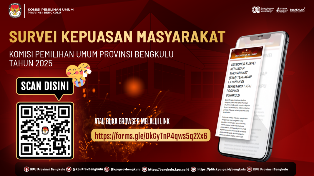 Bengkulu, Bengkulu.kpu.go.id – Komisi Pemilihan Umum (KPU) Provinsi Bengkulu kembali menunjukkan komitmennya dalam meningkatkan kualitas pelayanan publik. Melalui sebuah pengumuman resmi, KPU Provinsi Bengkulu mengajak seluruh masyarakat, khususnya yang berdomisili di wilayah Provinsi Bengkulu, untuk berpartisipasi aktif dalam pengisian Survei Kepuasan Masyarakat (SKM) terhadap layanan yang diberikan di Sekretariat KPU Provinsi Bengkulu. Survei ini bertujuan untuk menjaring masukan, kritik, dan saran konstruktif dari masyarakat sebagai pengguna layanan sekaligus tindak lanjut dari Surat Dinas Sekretaris Jenderal Komisi Pemilihan Umum Nomor : 2544/ORT.07-SD/01/2025 tanggal 28 Juli 2025 perihal Pelaksanaan Surver Kepuasan Masyarakat (SKM). Data yang terkumpul nantinya akan menjadi bahan evaluasi penting bagi KPU Provinsi Bengkulu untuk terus berbenah dan mengoptimalkan setiap aspek pelayanan, mulai dari kemudahan akses informasi, kecepatan respons, hingga sikap profesionalisme para petugas. "Partisipasi masyarakat sangat kami harapkan. Survei ini adalah cerminan dari komitmen kami untuk mewujudkan KPU yang lebih transparan, akuntabel, dan berorientasi pada pelayanan publik yang prima," ujar Lugisti Suryadinata selaku Kapala Bagian Perencanaan, Data, Informasi, Partisipas, Hubungan Masyarakat, dan Sumber Daya Manusia, dalam keterangannya. Masyarakat bisa mengakses survei ini secara daring melalui tautan khusus yang disediakan berikut ini : https://forms.gle/kSybAskNbVLwUjPe7 , atau melalui pemindaian/scan QR Code yang terdapat pada gambar utama berita ini. "Setiap suara dan masukan dari masyarakat sangat berharga. Kami berharap partisipasi yang tinggi agar data yang kami peroleh benar-benar representatif. Dengan begitu, upaya perbaikan yang akan kami lakukan tepat sasaran dan sesuai dengan harapan masyarakat," tambahnya. KPU Provinsi Bengkulu menekankan bahwa kerahasiaan data responden akan dijamin sepenuhnya. Informasi yang diberikan hanya akan digunakan untuk keperluan evaluasi internal dan tidak akan disalahgunakan. Ajakan ini merupakan langkah konkret KPU Provinsi Bengkulu dalam menjalankan prinsip-prinsip tata kelola pemerintahan yang baik (good governance). Partisipasi masyarakat dalam survei ini diharapkan dapat memperkuat sinergi antara penyelenggara pemilu dan publik, demi terciptanya proses demokrasi yang lebih baik di Provinsi Bengkulu. Masyarakat diimbau untuk segera mengisi survei ini dan memberikan penilaian yang objektif. Batas waktu pengisian survei hingga tanggal 30 Agustus 2025. (Humas : Firman/Foto : Meaghito)