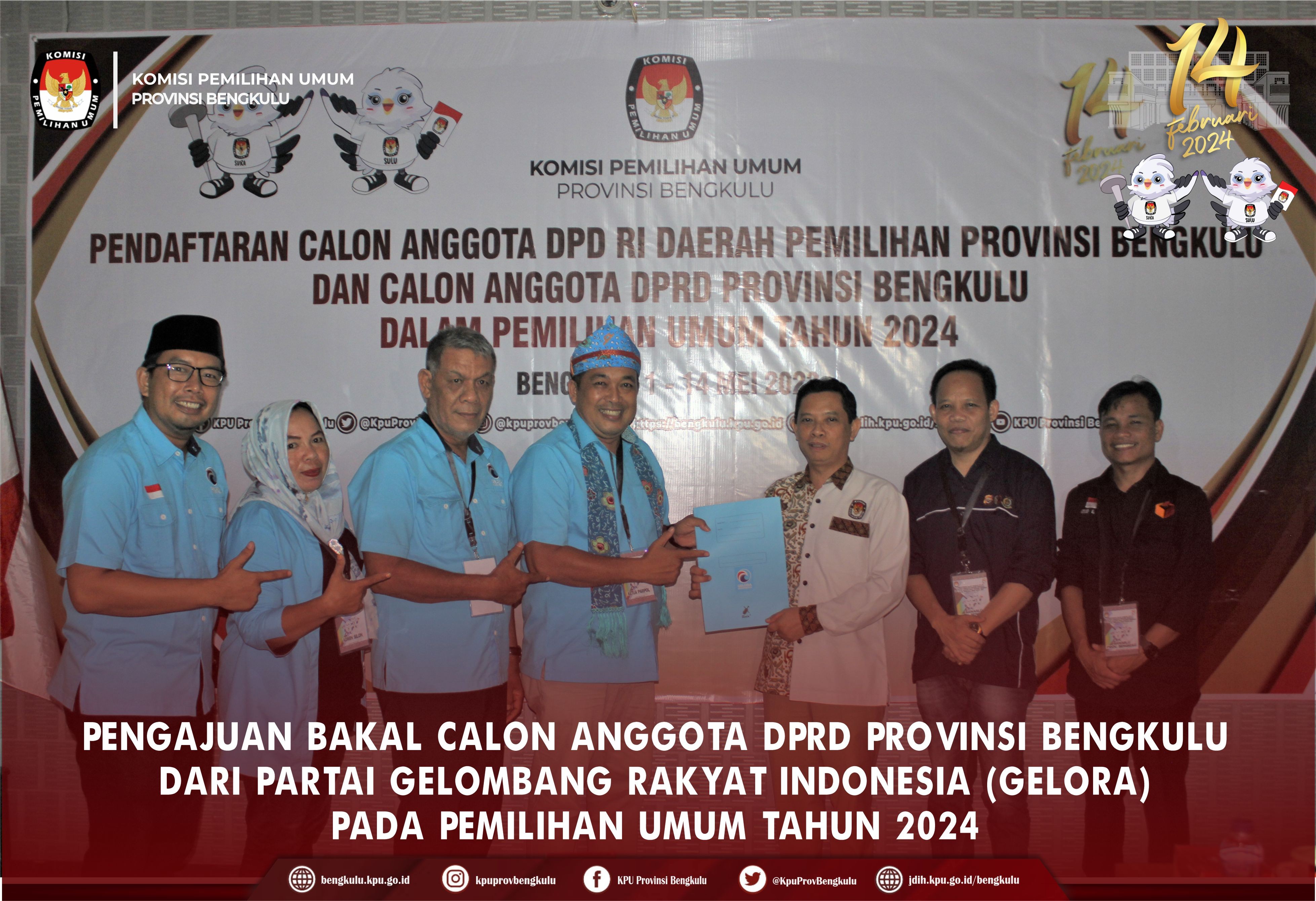 Bengkulu-bengkulu.kpu.go.id, Ketua KPU Provinsi Bengkulu Irwan Saputra bersama Anggota Darlinsyah, Emex Verzoni dan Irna Riza Yuliastuty serta Sekretaris Kemas Mohammad Ajir menerima Pengajuan Bakal Calon Anggota Dewan Perwakilan Rakyat Daerah Pemilihan Provinsi Bengkulu dari Partai Gelombang Rakyat Indonesia (Gelora) pada Pemilihan Umum Serentak 2024, Minggu (14/5/2023) di Kantor KPU Provinsi Bengkulu. Rangkaian acara berjalan khidmat dan lancar, dalam pelaksanaanya diisi dengan penyampaian maksud dan tujuan dari Partai Gelombang Rakyat Indonesia (Gelora), penyerahan dokumen syarat Pengajuan Bakal Calon, sambutan dari Ketua KPU Provinsi Bengkulu Irwan Saputra, foto bersama, pemeriksaan dokumen syarat calon dan konferensi pers. Hadir dalam Pengajuan Bakal Calon Anggota Dewan Perwakilan Rakyat Daerah adalah Pengurus DPW Partai Gelombang Rakyat Indonesia (Gelora), Ketua Bawaslu Provinsi Bengkulu Halid Saifullah dan Anggota Dodi Herwansyah, serta Natijo Elem. Pelaksanaan Pengajuan disiarkan live streaming melalui youtube KPU Provinsi Bengkulu.