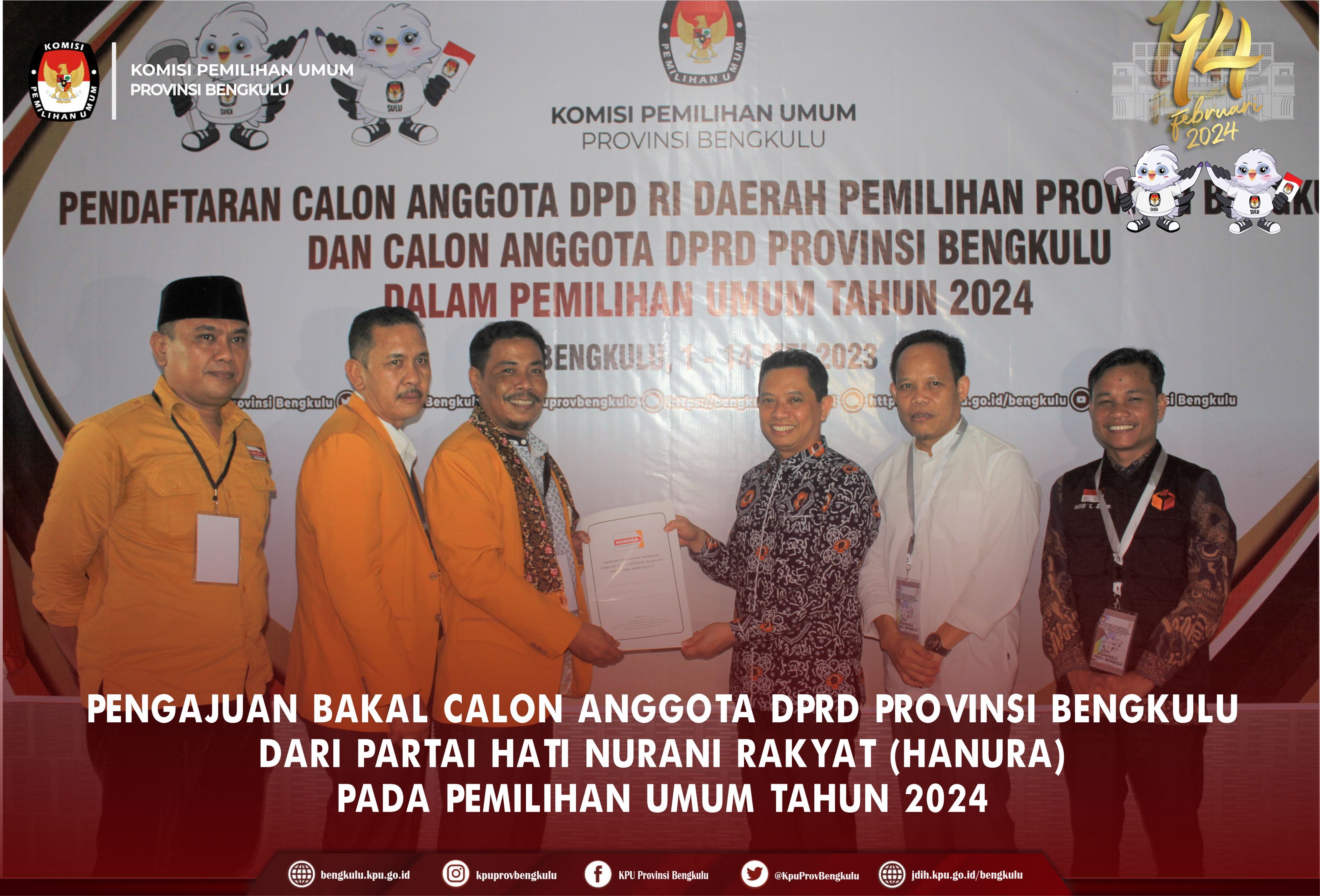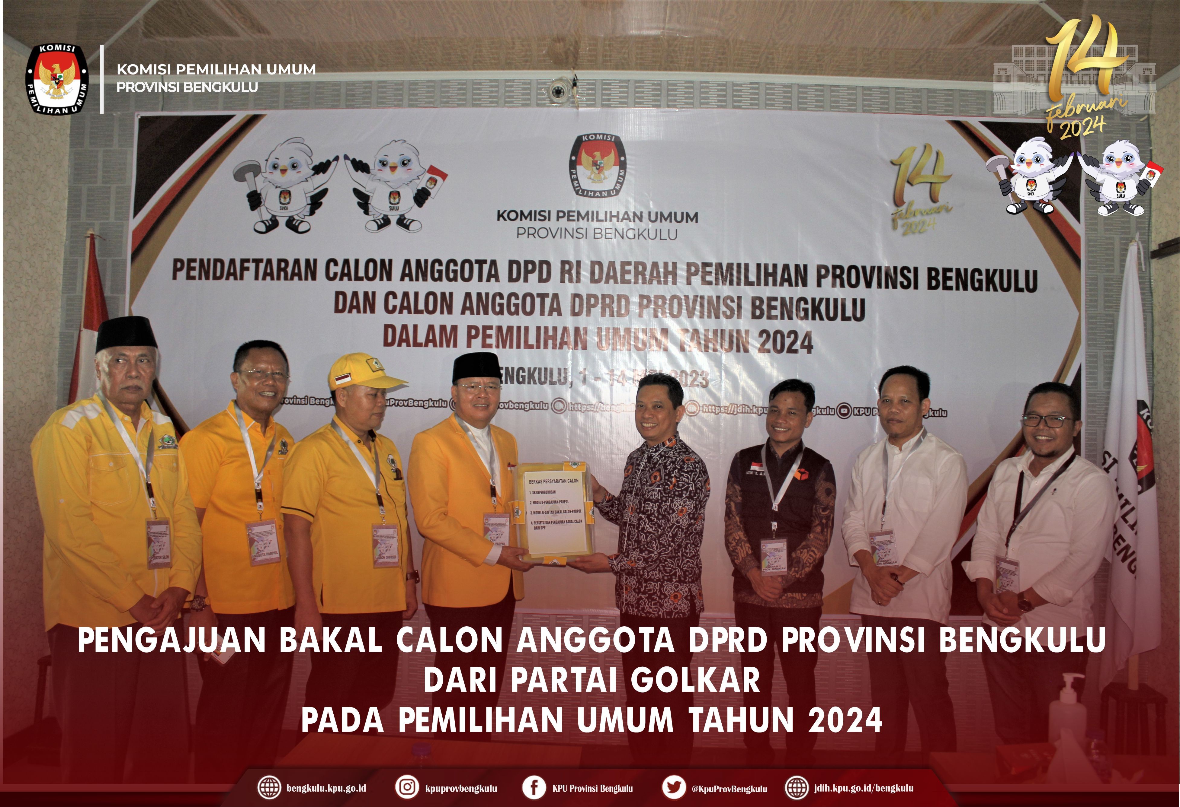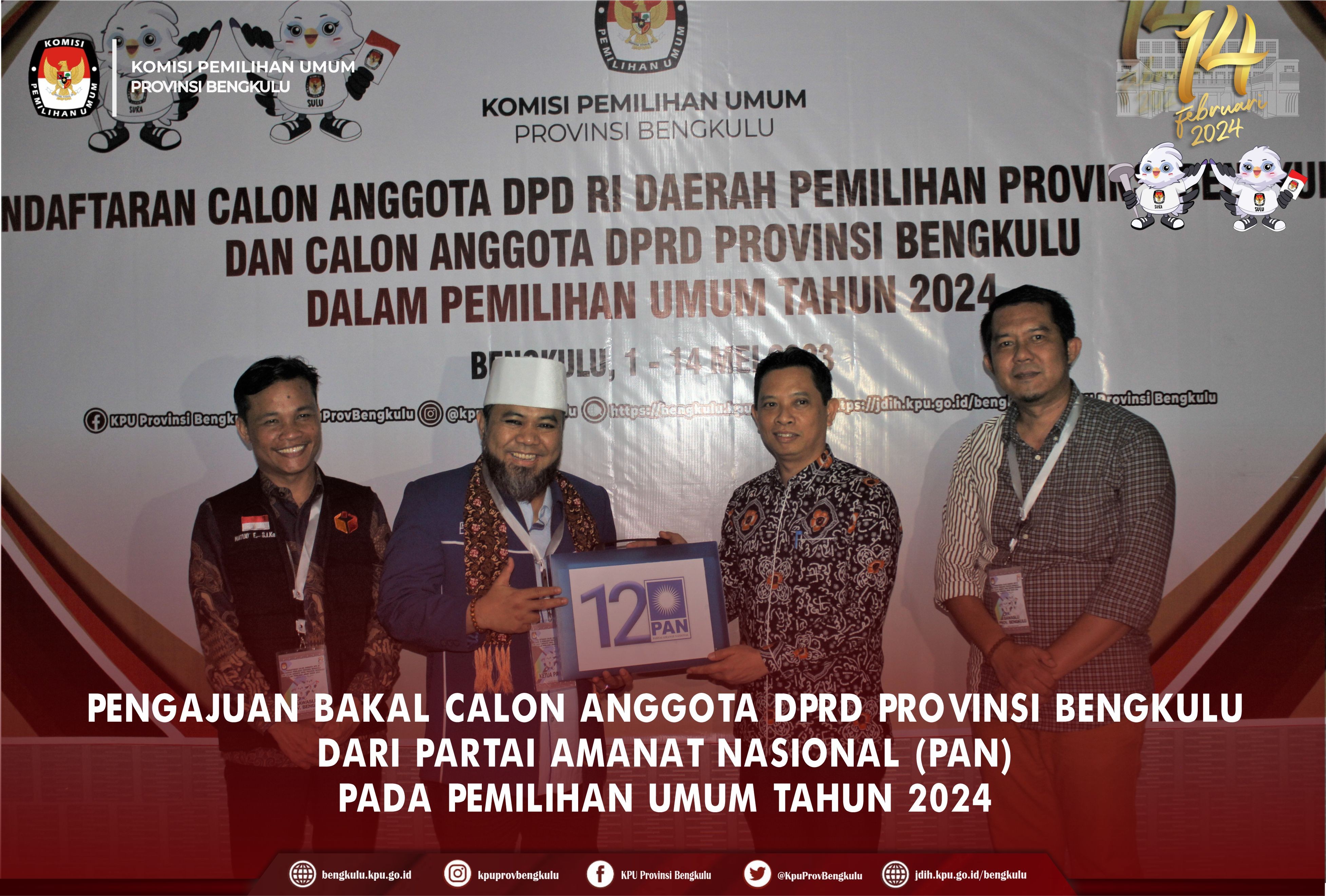 Bengkulu-bengkulu.kpu.go.id, Ketua KPU Provinsi Bengkulu Irwan Saputra bersama Anggota Darlinsyah, Emex Verzoni dan Irna Riza Yuliastuty serta Sekretaris Kemas Mohammad Ajir menerima Pengajuan Bakal Calon Anggota Dewan Perwakilan Rakyat Daerah Pemilihan Provinsi Bengkulu dari Partai Persatuan Pembangunan (PPP) pada Pemilihan Umum Serentak 2024, Sabtu (13/5/2023) di Kantor KPU Provinsi Bengkulu. Rangkaian acara berjalan khidmat dan lancar, dalam pelaksanaanya diisi dengan penyampaian maksud dan tujuan dari Partai Persatuan Pembangunan (PPP), penyerahan dokumen syarat Pengajuan Bakal Calon, sambutan dari Ketua KPU Provinsi Bengkulu Irwan Saputra, foto bersama, pemeriksaan dokumen syarat calon dan konferensi pers. Hadir dalam Pengajuan Bakal Calon Anggota Dewan Perwakilan Rakyat Daerah adalah Pengurus DPW Partai Partai Persatuan Pembangunan (PPP), Ketua Bawaslu Provinsi Bengkulu Halid Saifullah dan Anggota Dodi Herwansyah serta Natijo Elem. Pelaksanaan Pengajuan disiarkan live streaming melalui youtube KPU Provinsi Bengkulu.