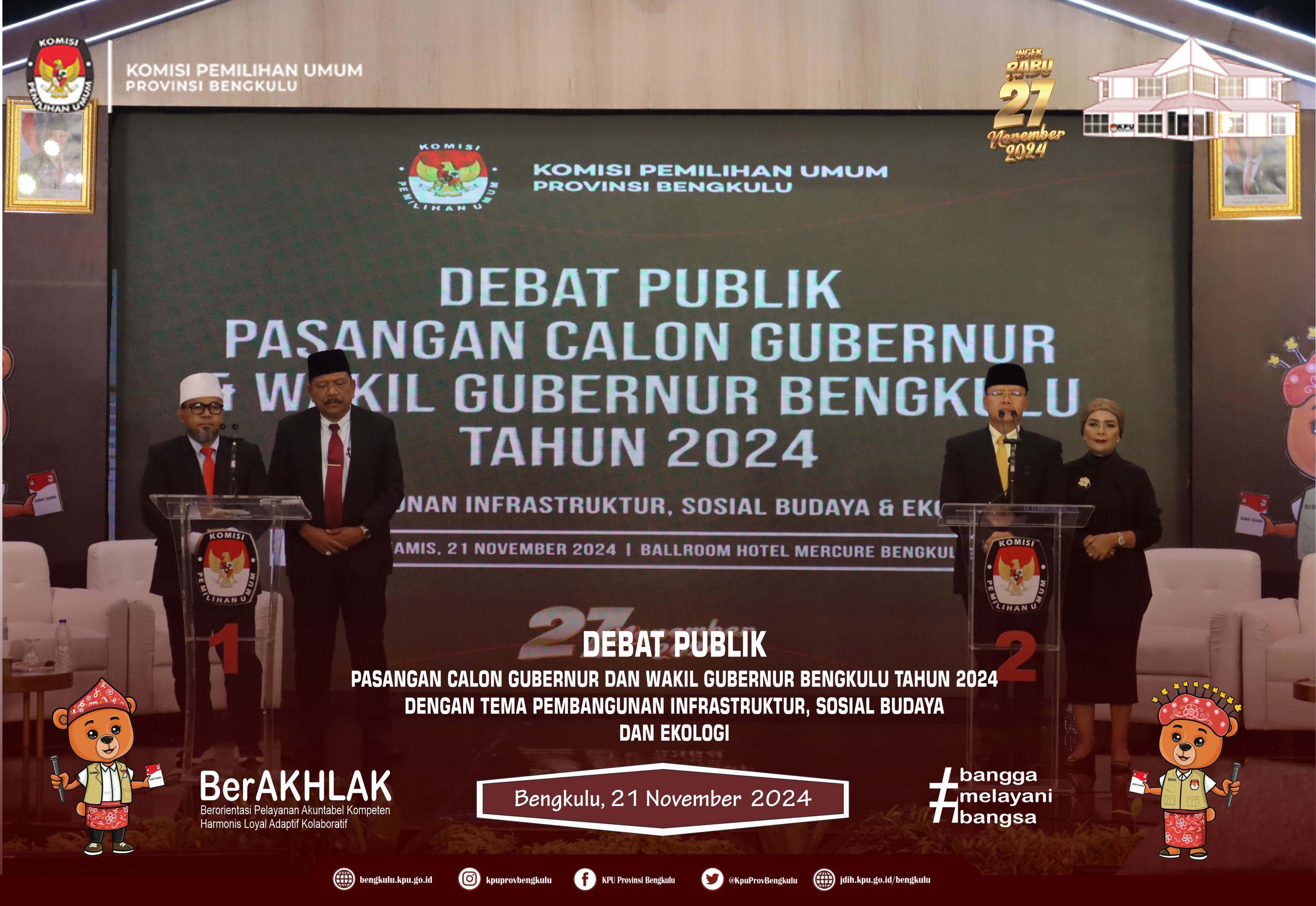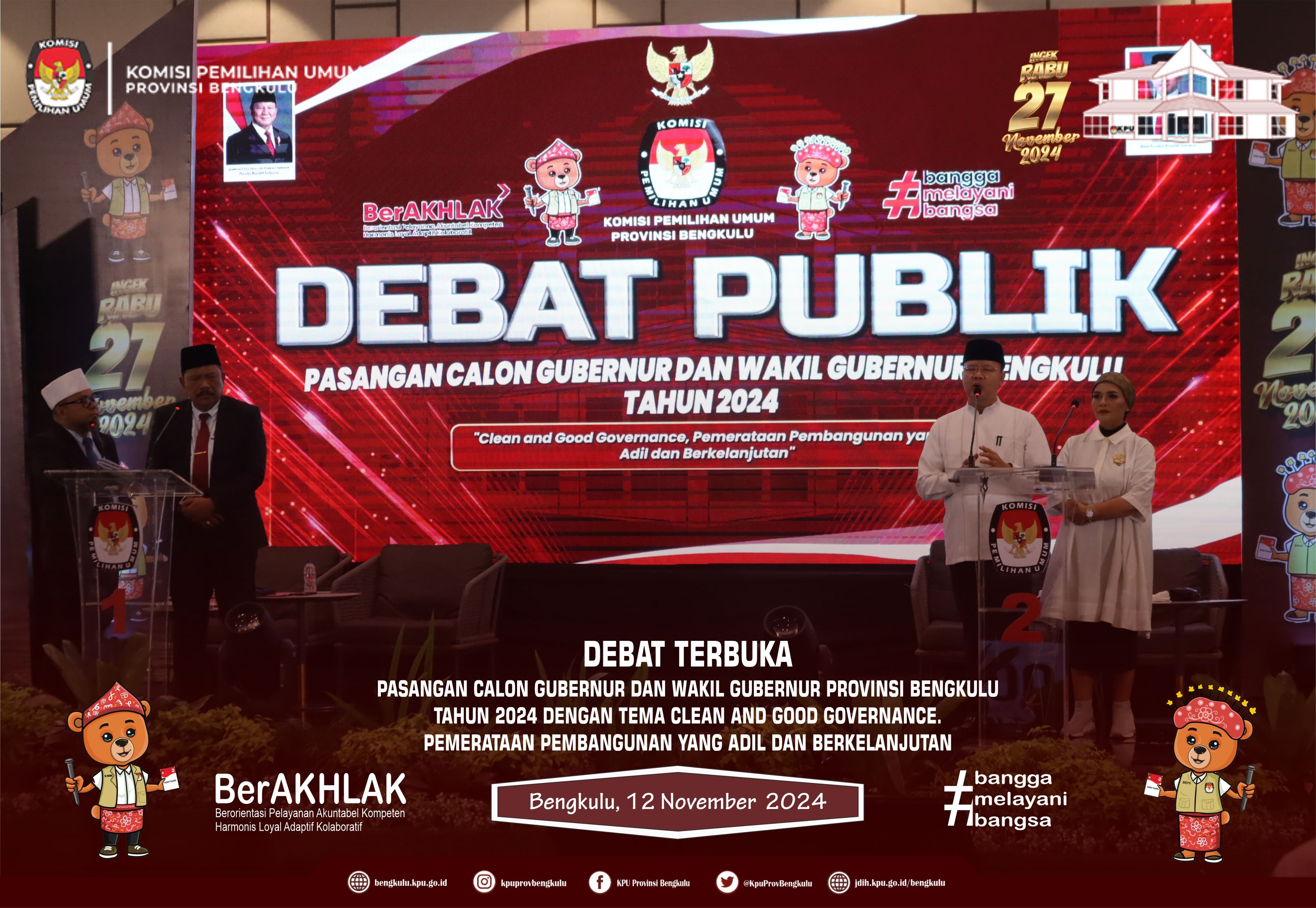 Bengkulu, bengkulu.kpu.go.id - KPU Provinsi Bengkulu menggelar Debat Terbuka Pasangan Calon Gubernur dan Wakil Gubernur Provinsi Bengkulu Tahun 2024, Selasa (12/11/2024) disiarkan langsung oleh BETV, TVRI dan RRI dan live streaming medsos youtube dan facebook KPU Provinsi Bengkulu dari Hotel Mercure Bengkulu. Hadir dalam Debat Terbuka Unsur Forkompinda Provinsi Bengkulu, Anggota DPD dan DPR RI Dapil Provinsi Bengkulu, Tokoh Agama, Tokoh Adat, Tim Perumus dan Tim Panelis, Pasangan Calon Nomor Urut 1 H. Helmi Hasan, SE - Ir. H. Mian dan Pasangan Calon Nomor Urut 2 Dr. H. Rohidin Mersyah, MMA - Meriani, SH, Bawaslu Provinsi Bengkulu, Partai Politik atau Gabungan Partai Politik Pengusul, Tim Pendukung Pasangan Calon dan Awak Media Massa Cetak, Elektronik dan Daring. Dalam Sambutannya Ketua KPU Provinsi Bengkulu Bapak Rusman Sudarsono menyampaikan bahwa Debat Publik atau Debat Terbuka Antar Pasangan Calon ini merupakan salah satu bentuk metode kampanya yg tujuannya adalah sarana pendidikan politik masyarakat dan penyampaian informasi kepada masyarakat dalam bentuk visi misi dan program pasangan calon yang bentuk outputnya adalah partisipasi pemilih pda Rabu 27 November 2024. Bapak Rusman berharap debat ini berjalan dengan baik dan pasangan calon dan tim pendukungnya untuk mematuhi aturan dan tata tertib yang telah disepakati. Debat Terbuka yang dimoderatori Presenter Zackia Arfan ini dengan Tema Clean and Good Governance, Pemerataan Pembangunan yang adil dan berkelanjutan serta Sub Tema meliputi Reformasi Birokrasi, Teknologi Informasi, Pelayanan Publik yang efisien dan berkeadilan, Keberpihakan/affirmative action pada kesetaraan gender, disabilitas, kelompok minoritas dan marginal, Sinergitas pembangunan antar Provinsi dan Kabupaten/Kota serta Hilirisasi komoditas unggulan. Debat Terbuka terbagi menjadi 6 (enam) segmen, yakni Segmen Kesatu (Pembukaan, Penbacaan Tata Tertib, dan Penyampaian Visi Misi dan Program Kerja), Segmen Kedua dan ketiga (Pendalaman Visi, Misi dan Program Kerja), Segmen Empat dan Lima (Tanya Jawab dan Tanggapan) serta Segmen Enam (Penutup). Secara keseluruhan pelaksanaan debat berjalan aman, kondusif dan lancar.
