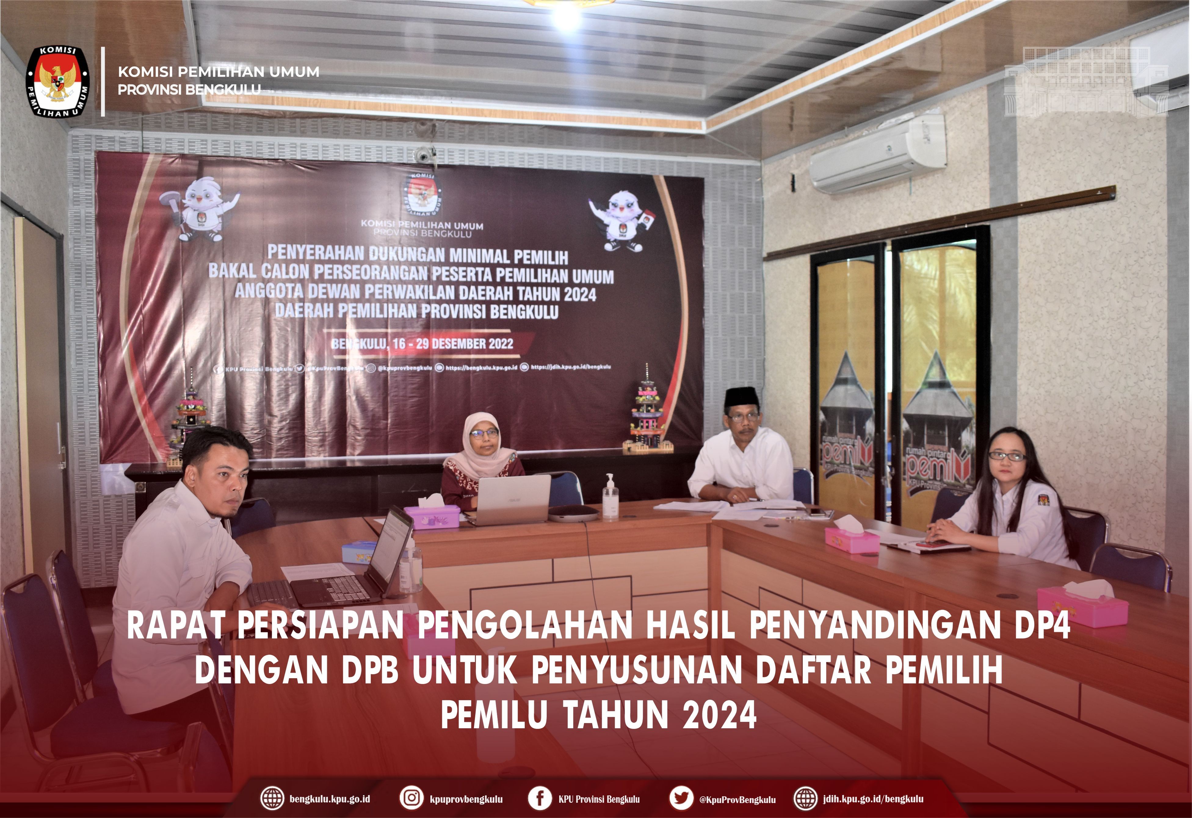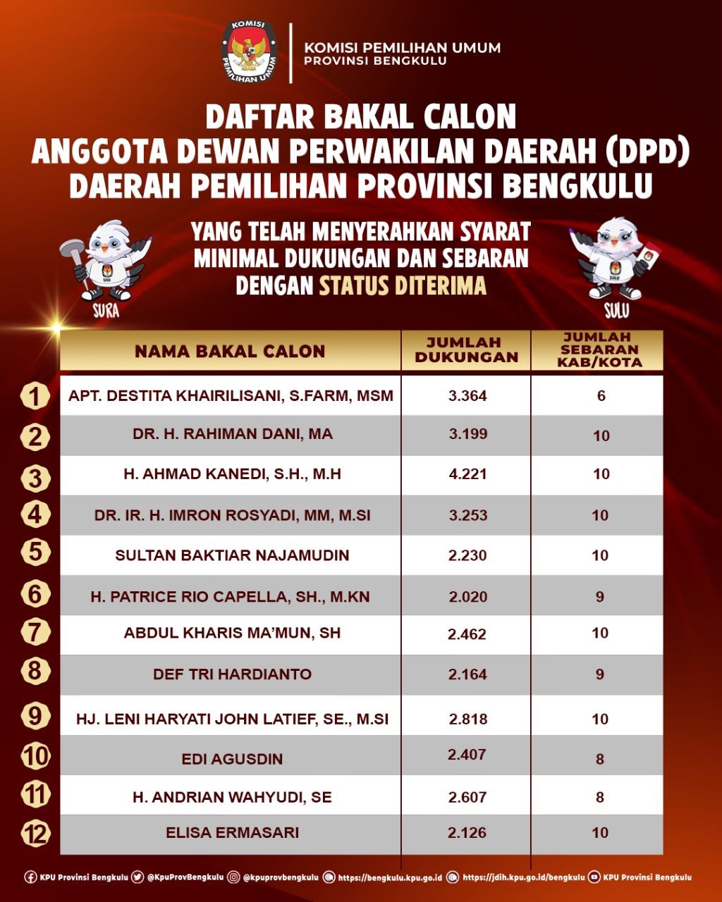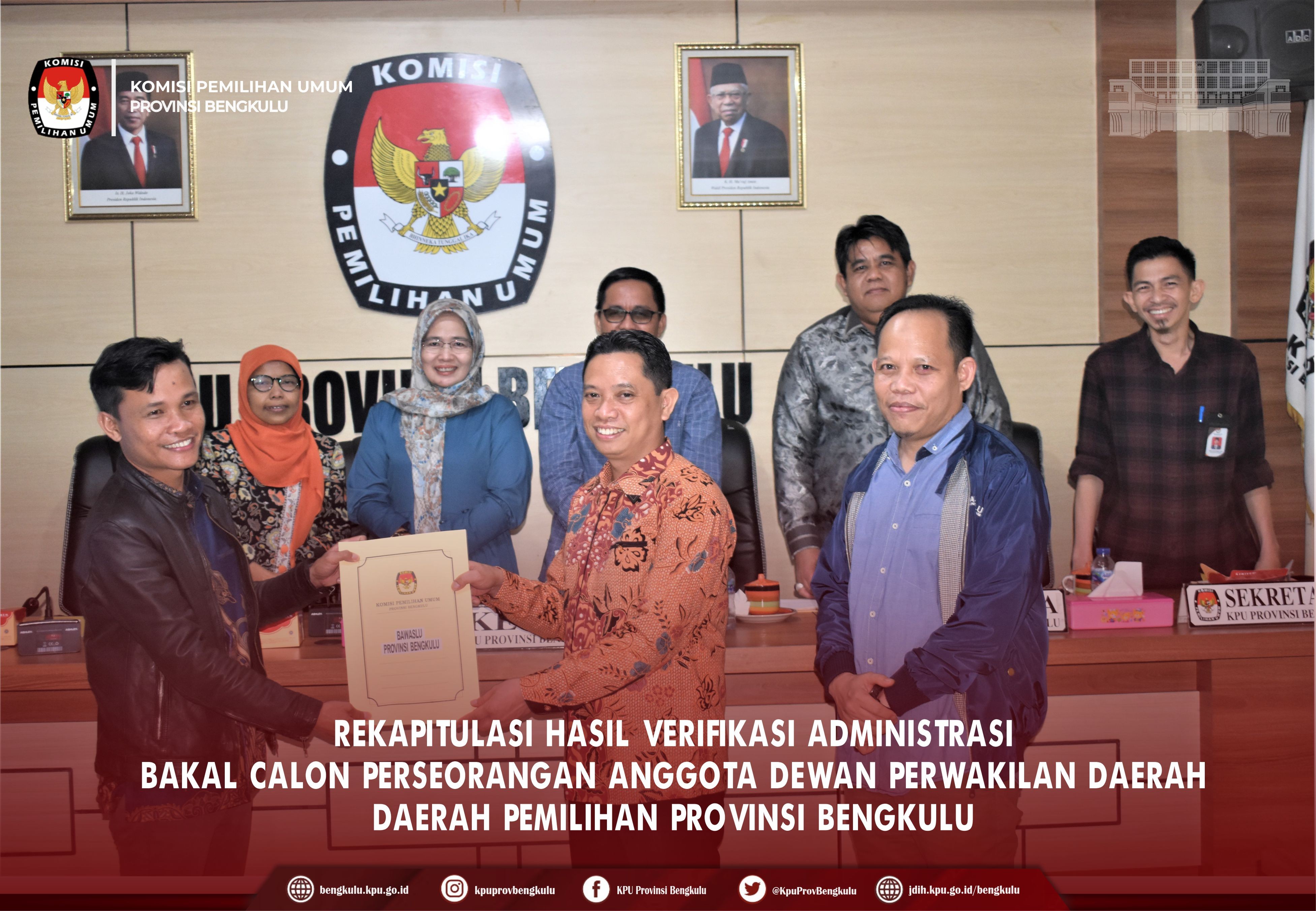 Ketua KPU Provinsi Bengkulu Irwan Saputra bersama Anggota KPU Provinsi Bengkulu Siti Baroroh, Darlinsyah, Emex Verzoni, dan Irna Riza Yuliastuty serta Sekretaris Kemas Mohammad Ajir membuka acara Rekapitulasi Hasil Verifikasi Administrasi Bakal Calon Perseorangan Anggota Dewan Perwakilan Daerah (DPD) Daerah Pemilihan Provinsi Bengkulu, Minggu (15/1). Rekapitulasi tersebut dihadiri Bakal Calon, Petugas Penghubung/Admin/Operator Silon Bakal Calon, dan Ketua Bawaslu Provinsi Bengkulu Halid Saifullah dan Anggota Natijo Elem dan sekretariat Bawaslu Provinsi Bengkulu. Dalam sambutannya Irwan menyampaikan bahwa rekapitulasi hasil verifikasi administrasi bakal calon DPD ini nantinya jika memenuhi syarat maka akan lanjut ke tahapan verifikasi faktual sedangkan yang belum memenuhi syarat akan melakukan perbaikan terhitung tanggal 16-22 Januari 2023. Rekapitulasi hasil dibacakan oleh Anggota KPU Provinsi Bengkulu Emex Verzoni terhadap 12 (dua belas) bakal calon DPD sesuai dengan SILON DPD secara berurutan. Hasilnya 8 (delapan) Bakal Calon DPD dinyatakan memenuhi syarat, yaitu Abdul Kharis Ma’mun, Ahmad Kanedi, Andrian Wahyudi, Destita Khairilisani, Edi Agusdin, Imron Rosyadi, Rahiman Dani, dan Sultan Baktiar Najamudin sedangkan yang dinyatakan Belum Memenuhi Syarat sebanyak 4 (empat) bakal calon, yaitu Def Tri Hardianto, Elisa Ermasari, Leni Haryati John Latief dan Patrice Rio Capella.