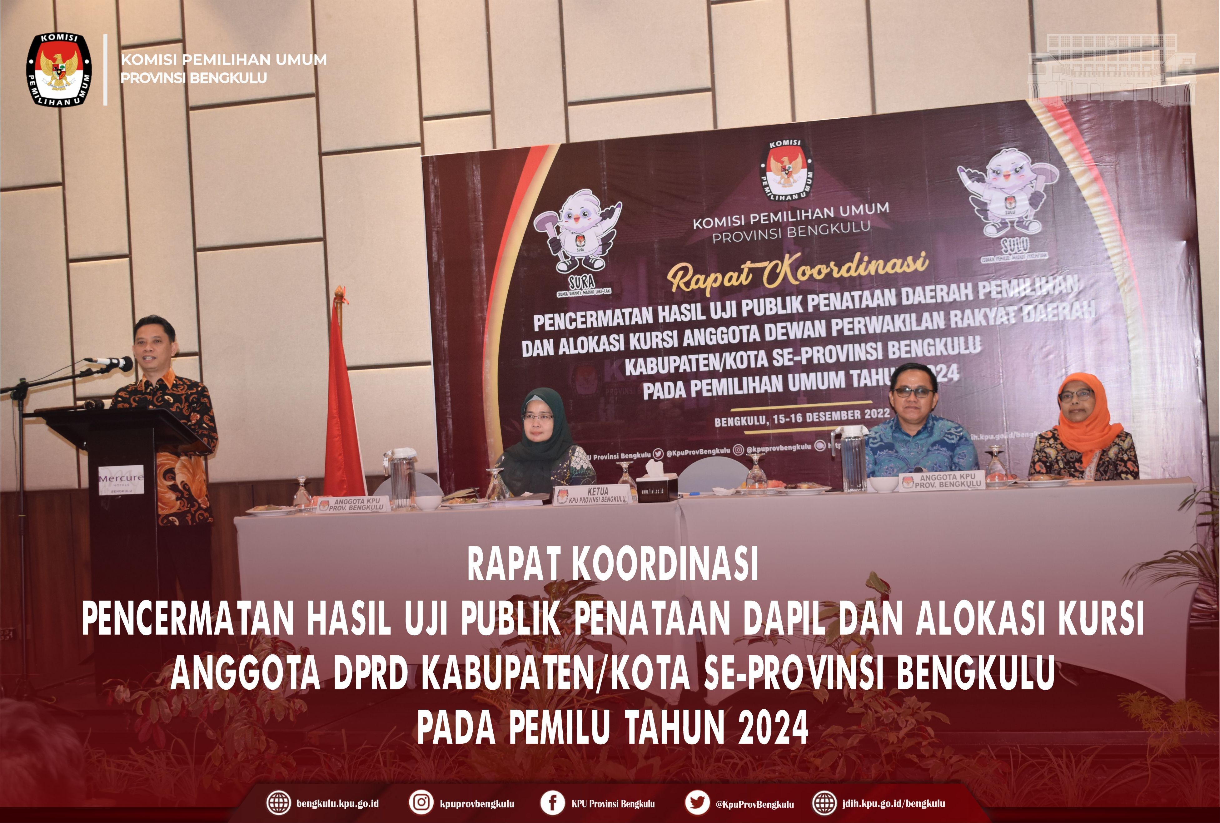 Bengkulu-bengkulu.kpu.go.id, Ketua KPU Provinsi Bengkulu Irwan Saputra didampingi Anggota KPU Provinsi Bengkulu Siti Baroroh, Darlinsyah, Emex Verzoni, dan Irna Riza Yuliastuty membuka Rapat Pleno Rekapitulasi Hasil Verifikasi Faktual Perbaikan Partai Politik Calon Peserta Pemilu Tahun 2024 Tingkat Provinsi Bengkulu di Hotel Santika Bengkulu, Sabtu (10/12).