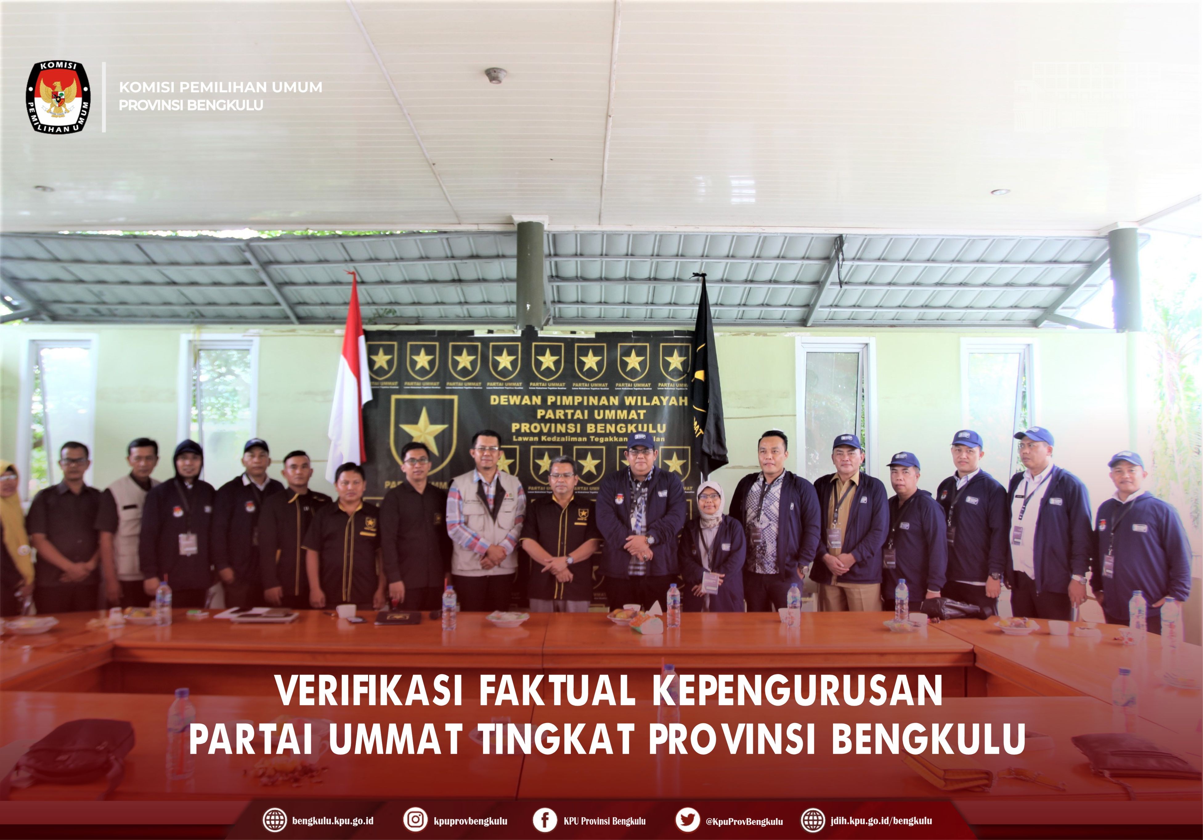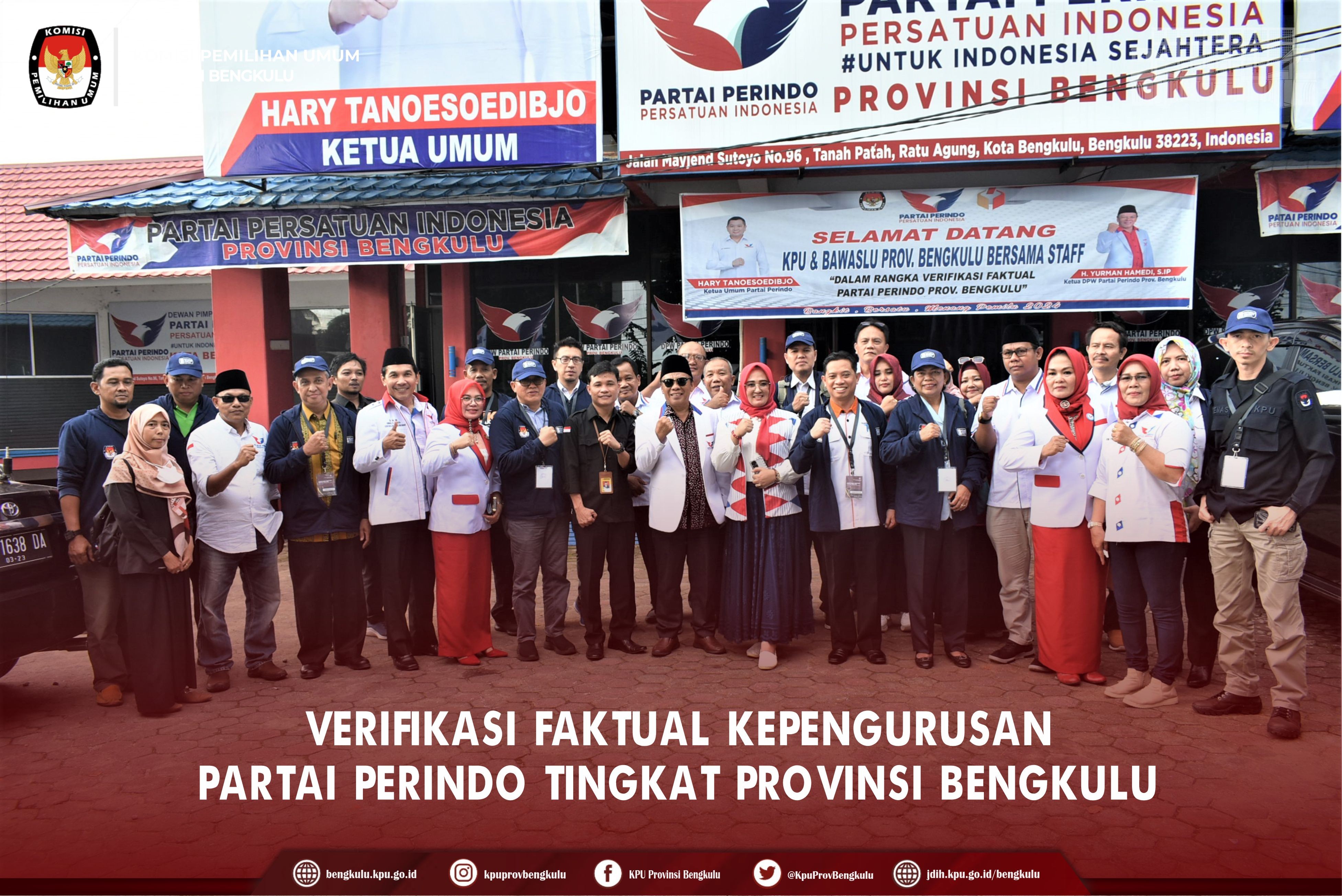 Bengkulu-bengkulu.kpu.go.id, Ketua KPU Provinsi Bengkulu Irwan Saputra bersama Anggota KPU Provinsi Bengkulu Emex Verzoni serta Sekretaris Kemas Mohammad Ajir dan Tim Pelaksana Kegiatan Verifikasi Partai Politik Peserta Pemilu 2024, yaitu Polda, Kesbangpol, Kejaksaan Tinggi dan Kanwil Kemenkumham Bengkulu mendatangi Sekretariat Dewan Pimpinan Wilayah Partai Persatuan Indonesia (PERINDO) Tingkat Provinsi Bengkulu dalam rangka melaksanakan Verifikasi Faktual Kepengurusan Partai Politik, Senin (17/10).