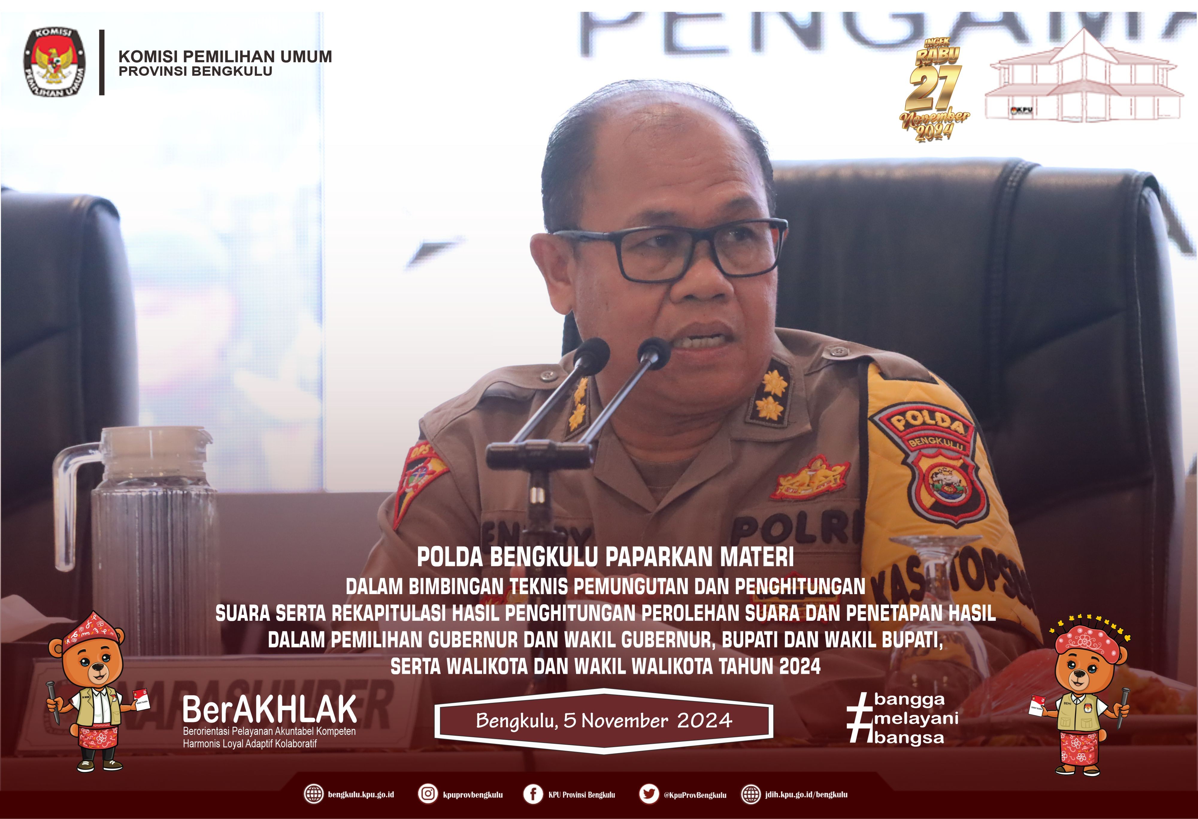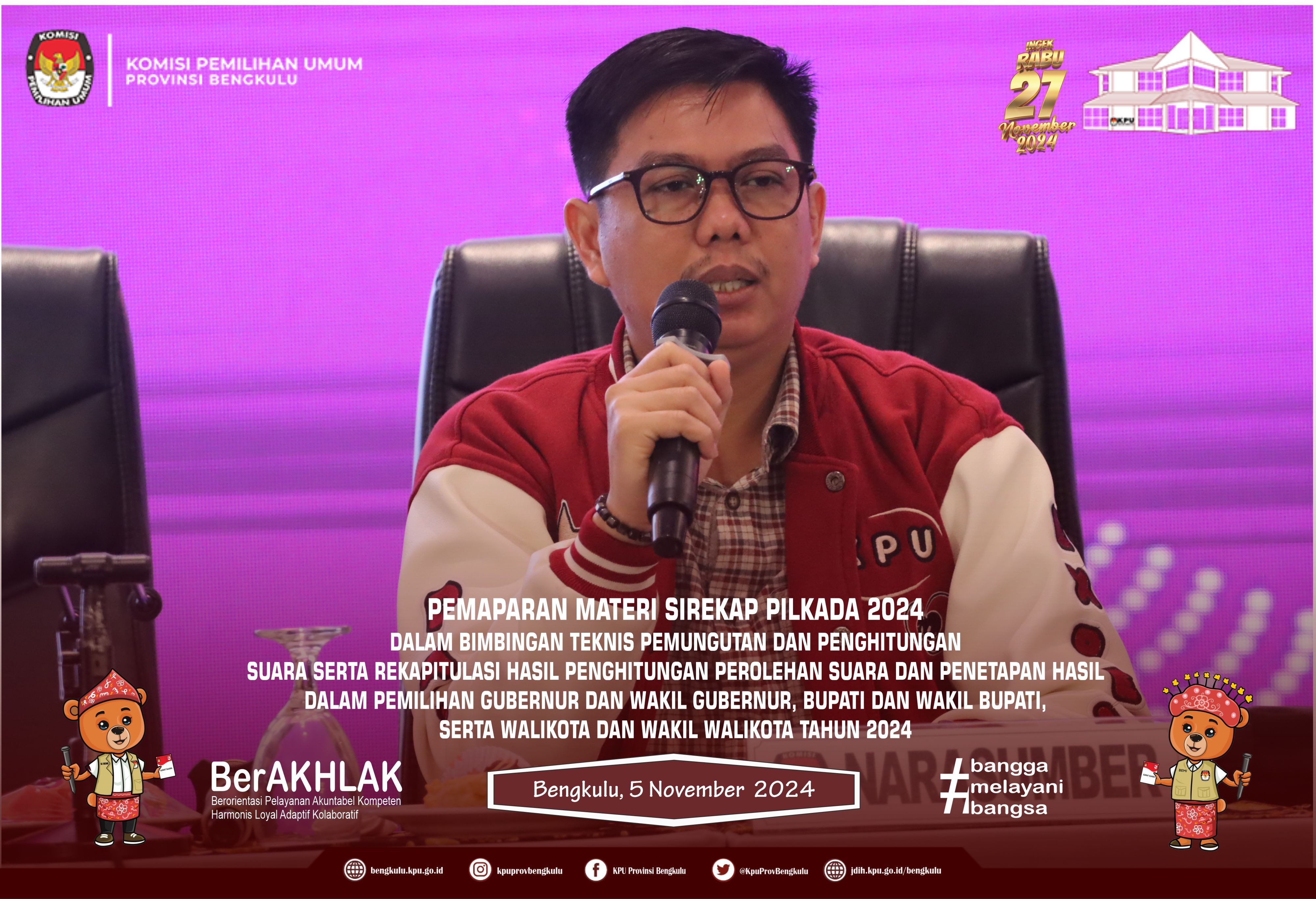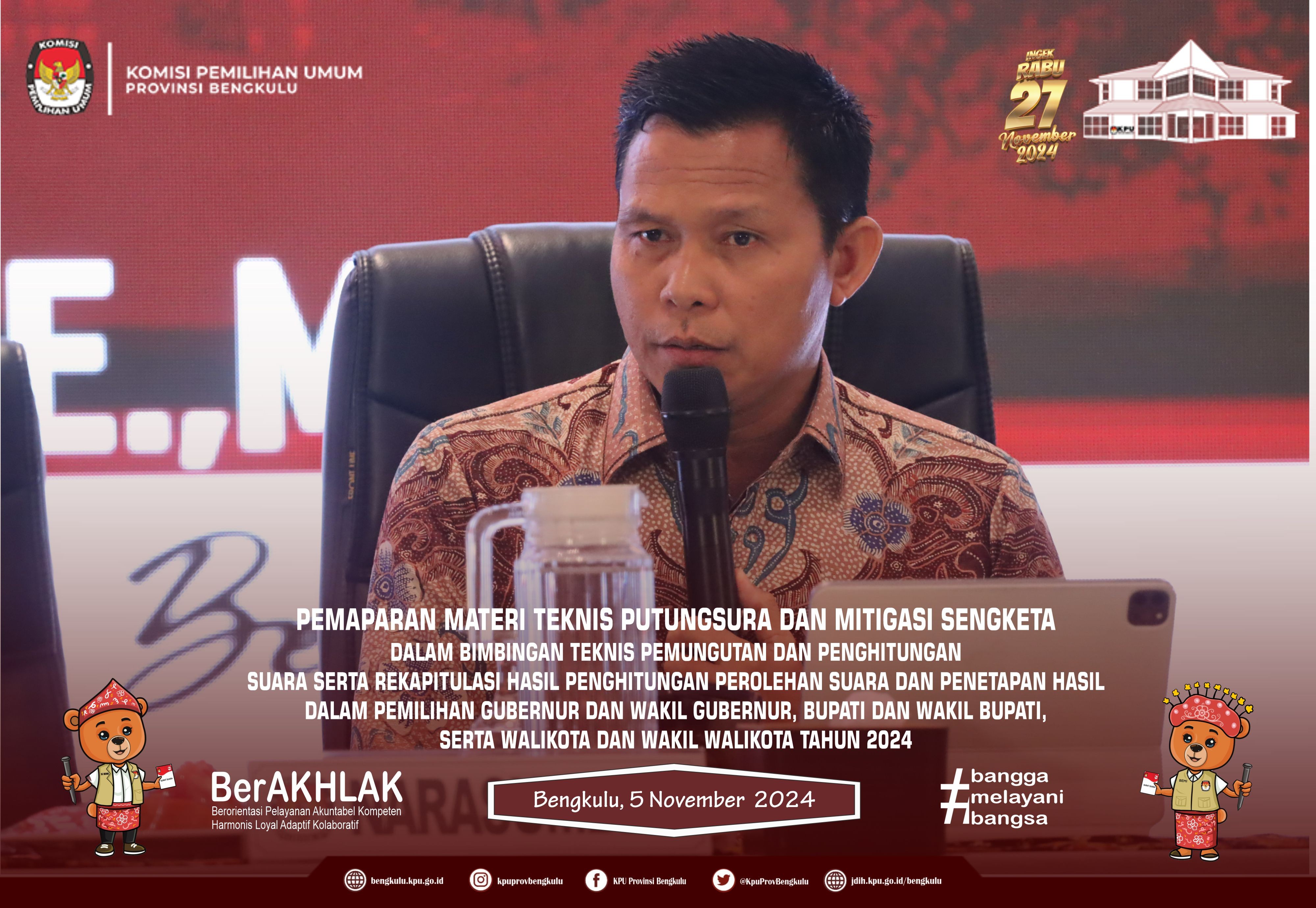 Bengkulu, bengkulu.kpu.go.id - Hari Kedua Bimbingan Teknis Pemungutan dan Penghitungan Suara serta Rekapitulasi Hasil Penghitungan Perolehan Suara dan Penetapan Hasil dalam Pemilihan Gubernur dan Wakil Gubernur, Bupati dan Wakil Bupati serta Walikota dan Wakil Walikota Tahun 2024 diisi dengan penyampaian materi oleh Ketua Divisi Teknis Penyelenggaraan KPU Provinsi Bengkulu Bapak Sarjan Efendi yang menyampaikan materi Teknis Persiapan dan Pelaksanaan Pemungutan dan Penghitungan Suara berdasarkan Draft Rancangan PKPU, Tugas Ketua dan Anggota KPPS pada tahapan Pemungutan Suara dan tahapan Penghitugan Suara, Denah TPS, Suara dinyatakan sah dan tidak sah, dan sebagainya sedangkan Ketua Divisi Hukum dan Pengawasan KPU Provinsi Bengkulu Bapak Emex Verzoni yang memaparkan materi mitigasi dan potensi permasalahan sengketa pada tahapan Pemungutan dan Penghitungan Suara dan berharap kepada jajaran KPU Kabupaten/Kota dan PPK mengawal dan memastikan setiap tahapan pungut hitung tidak terjadi permasalahan demi suksesnya Pemilihan Gubernur dan Wakil Gubernur, Bupati dan Wakil Bupati serta Walikota dan Wakil Walikota di Provinsi Bengkulu dan sebagainya. Selain materi juga diisi dengan diskusi tanya jawab.