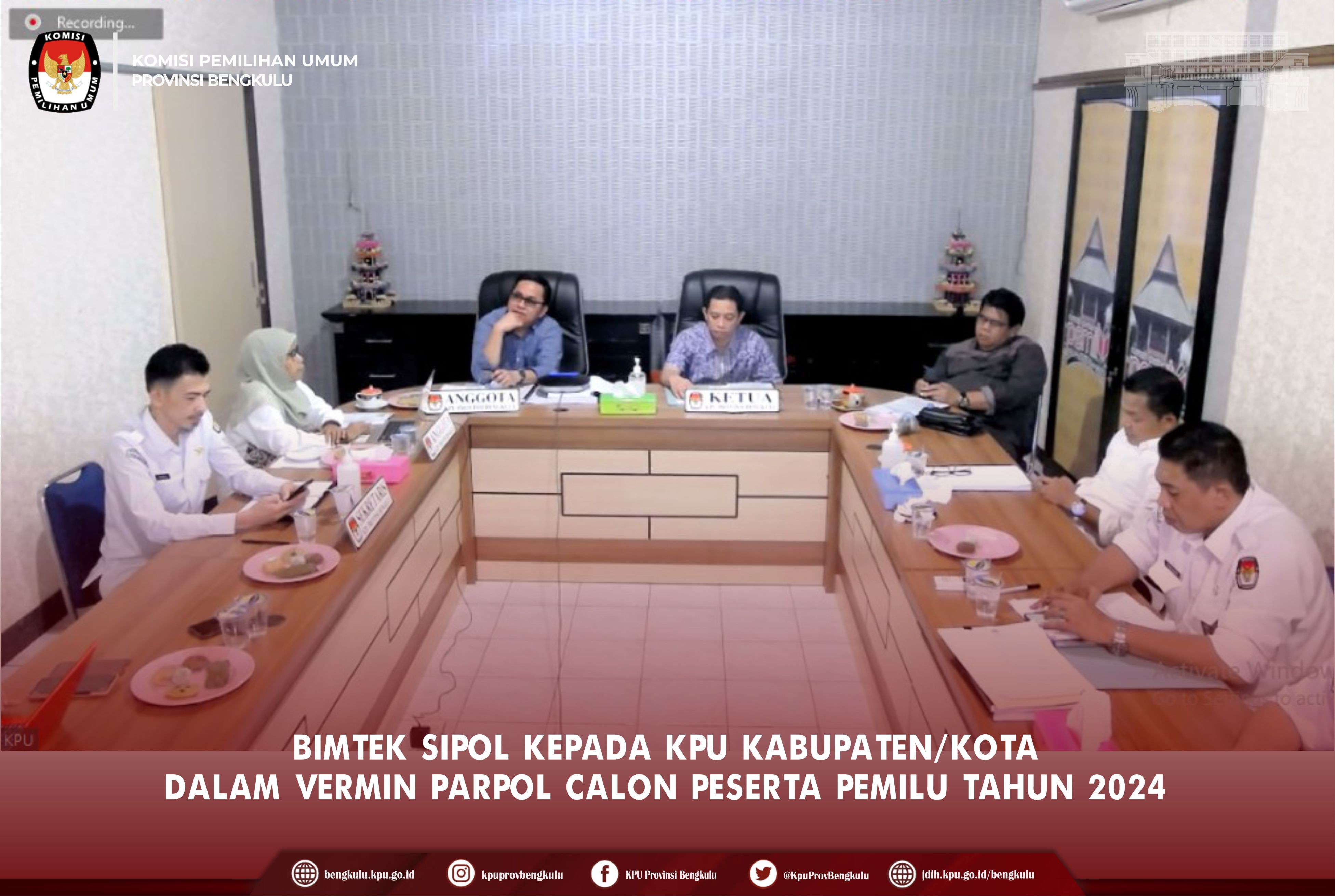 Bengkulu-bengkulu.kpu.go.id, Ketua KPU Provinsi Bengkulu Irwan Saputra didampingi Anggota KPU Provinsi Bengkulu Eko Sugianto, Siti Baroroh, Darlinsyah dan Emex Verzoni serta Sekretaris Kemas Mohammad Ajir, Kabag TPPPHHS Oktan Huzaeiry, Kasubbag TPHHH M. Benny Eka Putra, Operator Sipol Riko Sukmanna dan staf TPPHHS membuka kegiatan Bimbingan Teknis Sipol kepada KPU Kabupaten/Kota dalam Verifikasi Administrasi Partai Politik Calon Peserta Pemilu Tahun 2024 secara daring (zoom meeting) Kamis (18/8). Kegiatan Bimtek tersebut diikuti Ketua Divisi Teknis Penyelenggaraan, Ketua Divisi Perencanaan Data dan Informasi, Kasubbag TPPPH dan Operator Sipol KPU Kabupaten/Kota Se-Provinsi Bengkulu. Dalam arahannya Irwan menyampaikan bimtek ini penting dilakukan agar ada persamaan persepsi sesuai dengan regulasi yang mengatur mekanisme pelaksanaan vermin nantinya. Setelah dibuka acara dilanjutkan dengan penyampaian arahan dari Anggota dan Sekretaris KPU Provinsi Bengkulu. Darlinsyah menyampaikan agar KPU Kabupaten/Kota yakni Komisioner dan Sekretariat menjaga soliditas, profesional dan bekerja secara baik. Siti Baroroh menekankan agar KPU Kabupaten/Kota perkuat dan pahami regulasi serta teknis kerja dalam pelaksanaan vermin parpol. Eko Sugianto menyampaikan agar pelaksanaan vermin tidak menjadi objek gugatan sehingga perlu menyamakan persepsi sesuai dengan regulasi. Kemas Mohammad Ajir menekankan agar sekretariat membantu secara maksimal pelaksanaan vermin parpol diantaranya dukungan sarana prasarana seperti Laptop/PC, Jaringan Internet, Jaringan Listrik serta Sumber Daya Manusia (SDM) setiap Satker. Emex Verzoni menekankan pada persiapan yang wajib dilakukan oleh KPU Kabupaten/Kota pasca disampaikannya jumlah keanggotaan parpol sekaligus melakukan pemetaan dan mensiasati teknis kerja vermin. selain itu, kegiatan bimtek juga diisi dengan penyampaian laporan dari KPU Kabupaten/Kota se-Provinsi Bengkulu secara bergantian mengenai gambaran persiapan vermin yang akan dilaksanakan.
