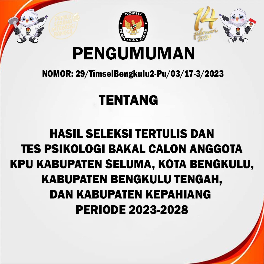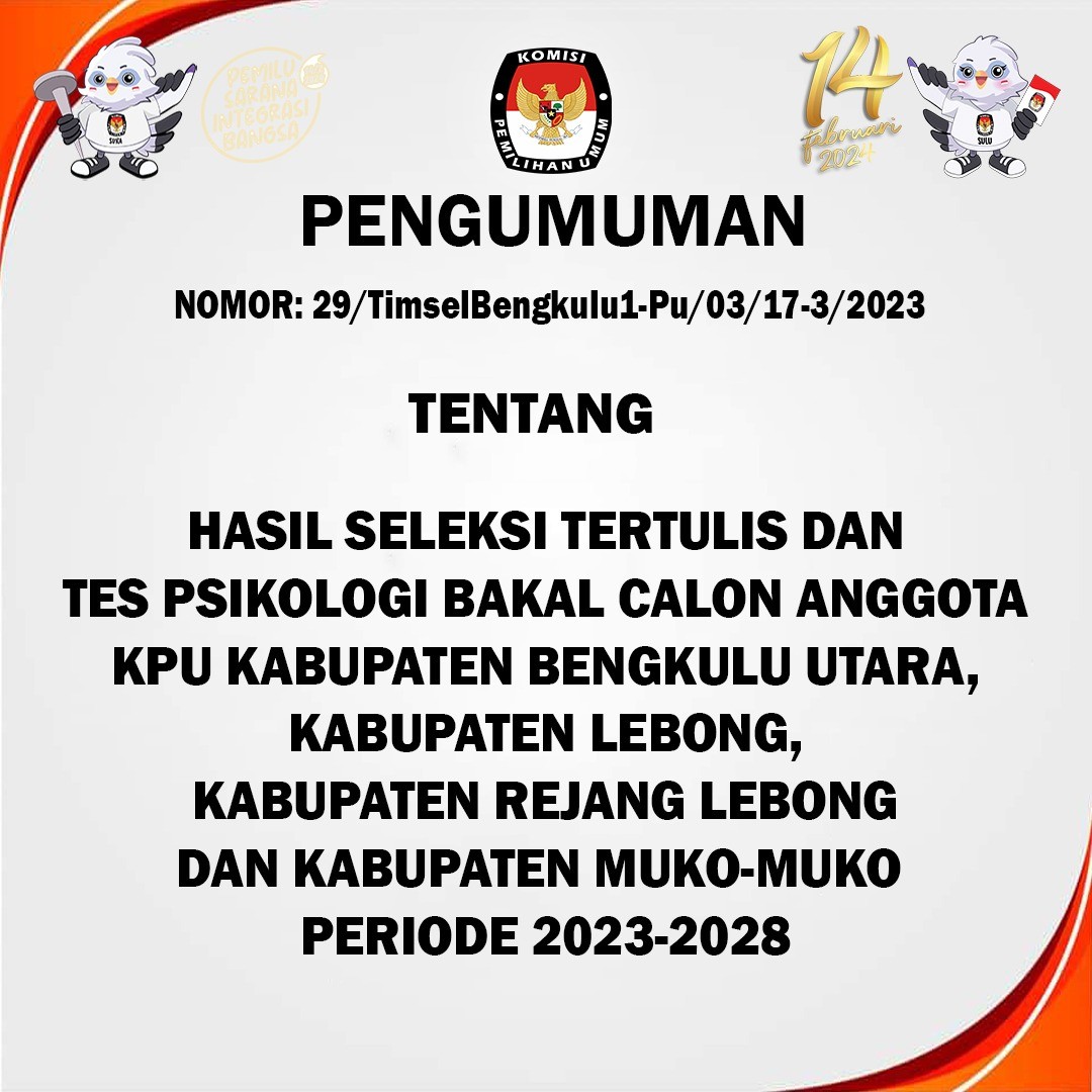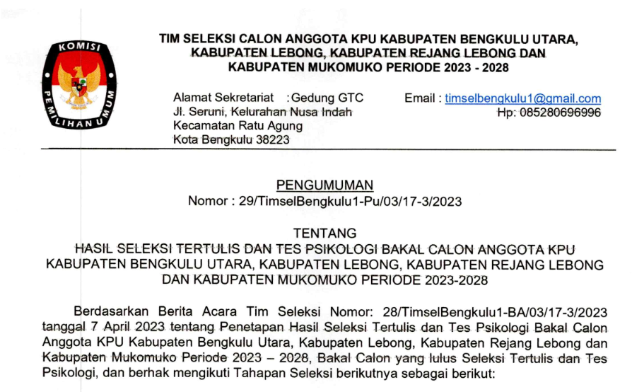 Bengkulu-bengkulu.kpu.go.id, Berikut Pengumuman Hasil Seleksi Tertulis dan Tes Psikologi Bakal Calon Anggota KPU Kabupaten Seluma, Kota Bengkulu, Kabupaten Bengkulu Tengah dan Kepahiang Periode 2023-2028