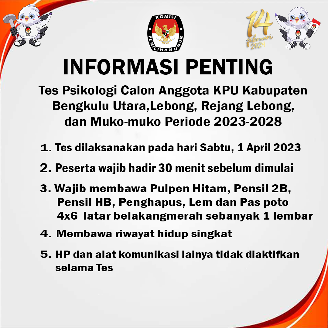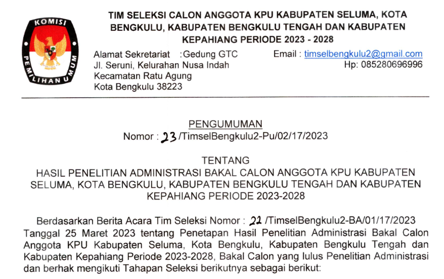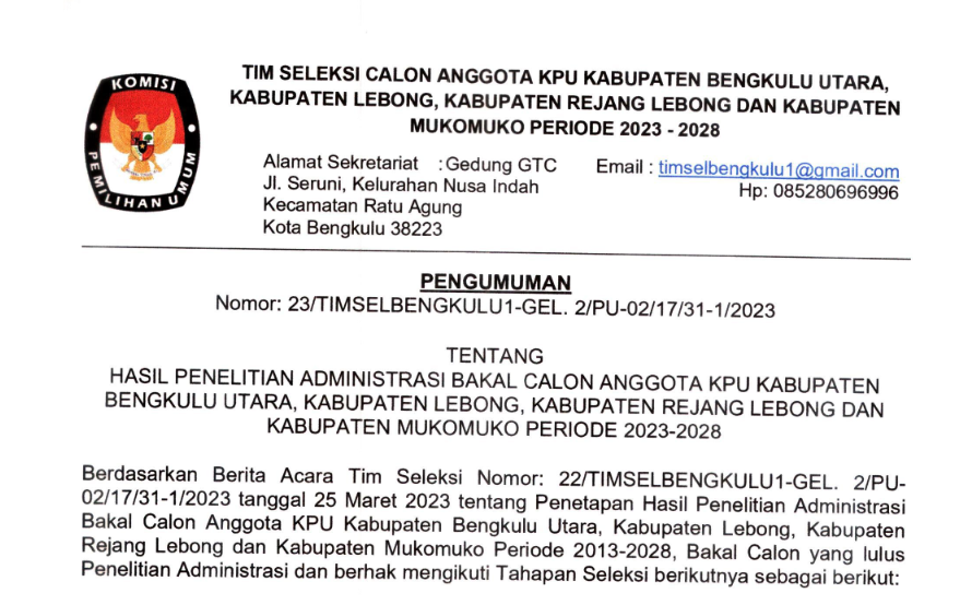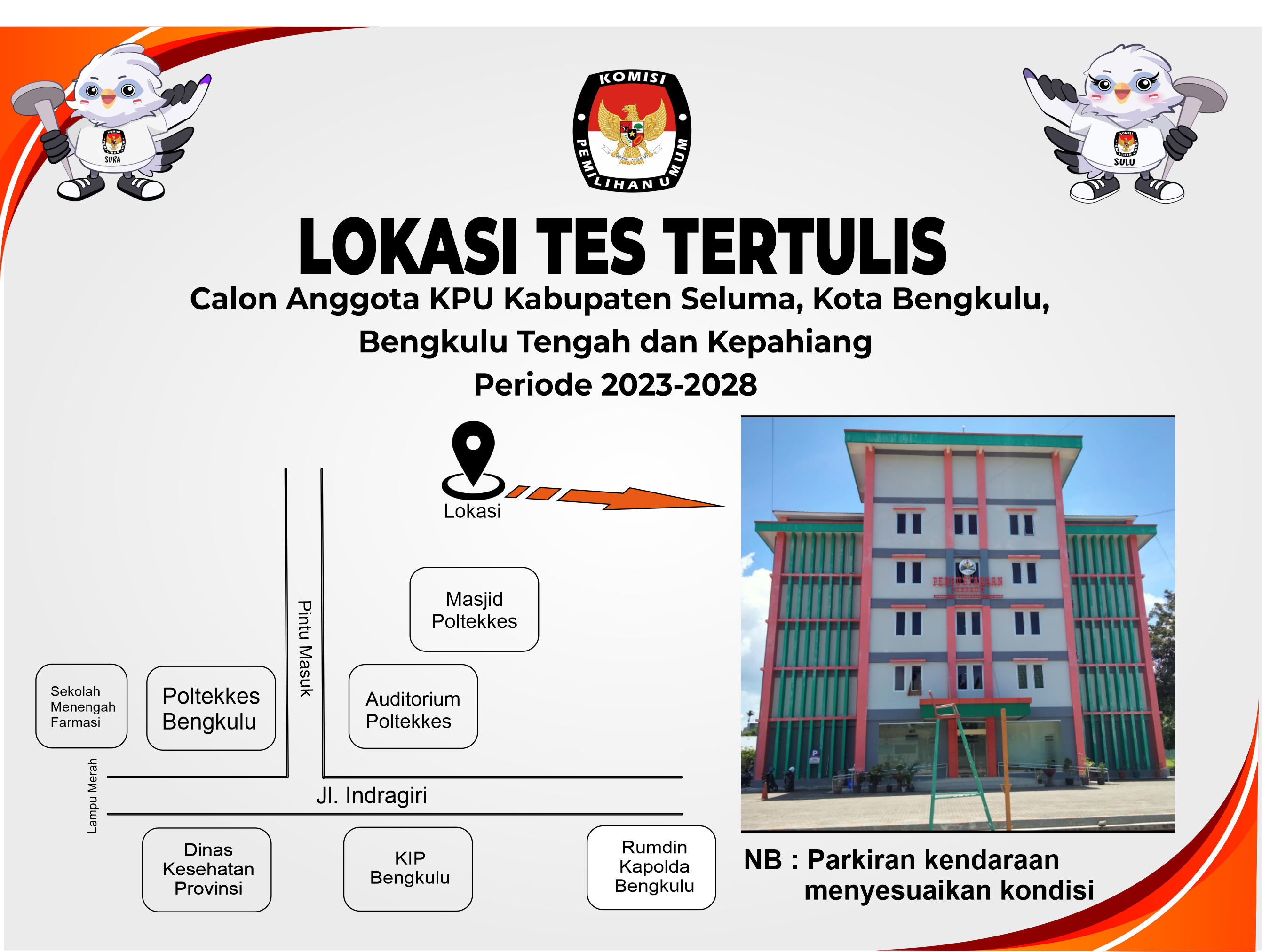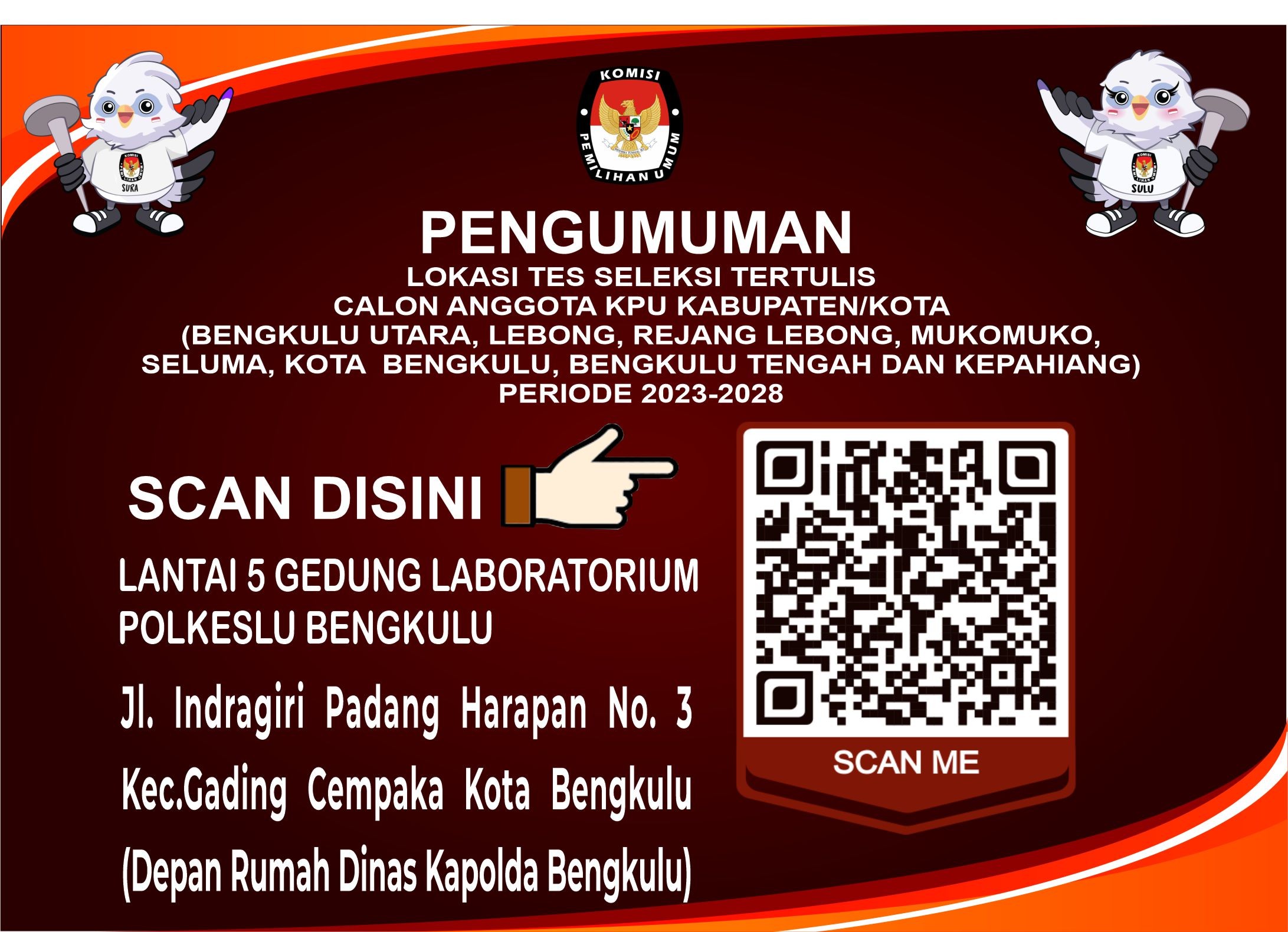 Bengkulu-bengkulu.kpu.go.id, Berikut Lokasi Tes Seleksi Tertulis Calon Anggota KPU Kabupaten Bengkulu Utara, Lebong, Rejang Lebong, Mukomuko, Seluma, Bengkulu Tengah, Kepahiang dan Kota Bengkulu Periode 2023-2028. Lokasi di Gedung Polkeslu Bengkulu Dengan alamat Jl. Indragiri Padang Harapan No. 3 Kec. Gading Cempaka Kota Bengkulu (Depan Rumah Dinas Kapolda Bengkulu) atau dapat menscan barcode dibawah ini!