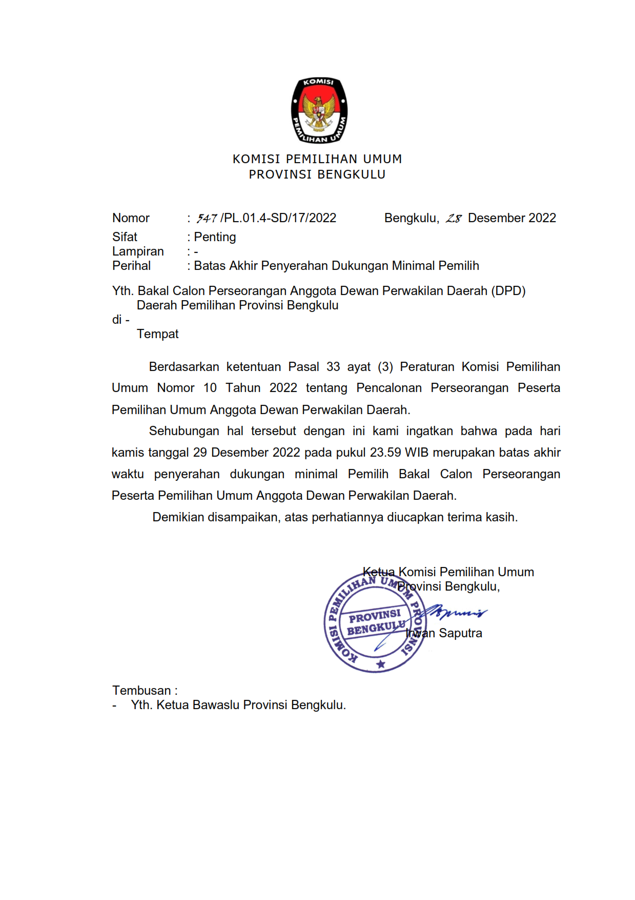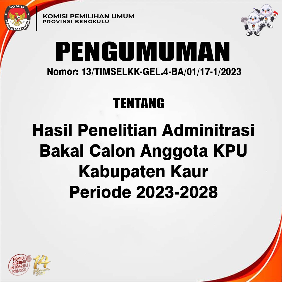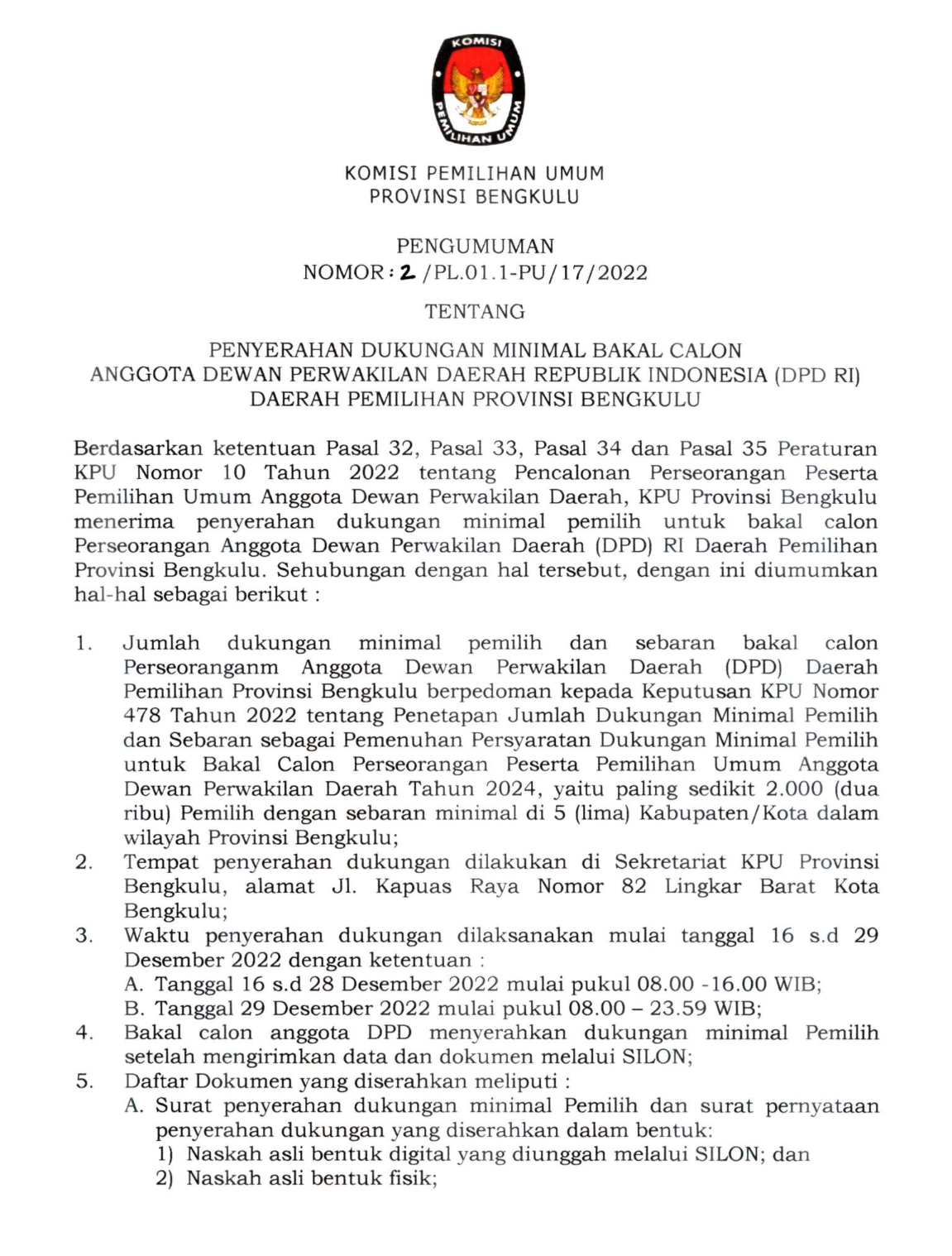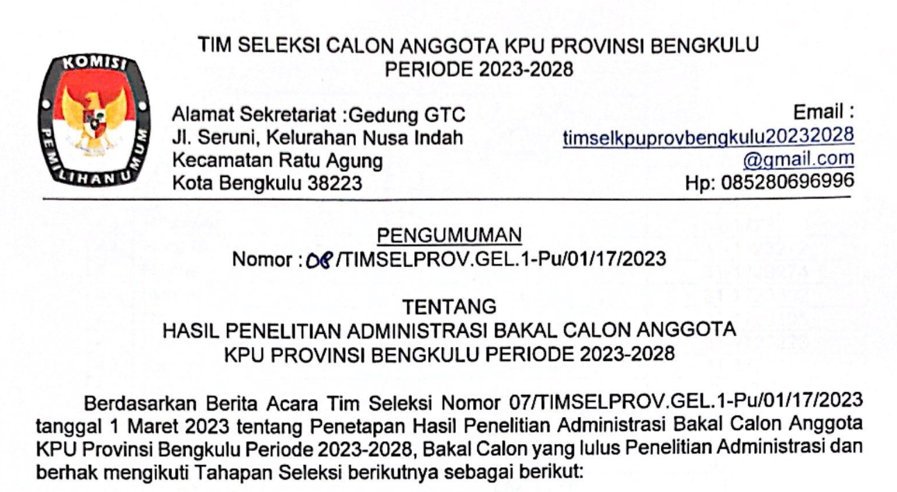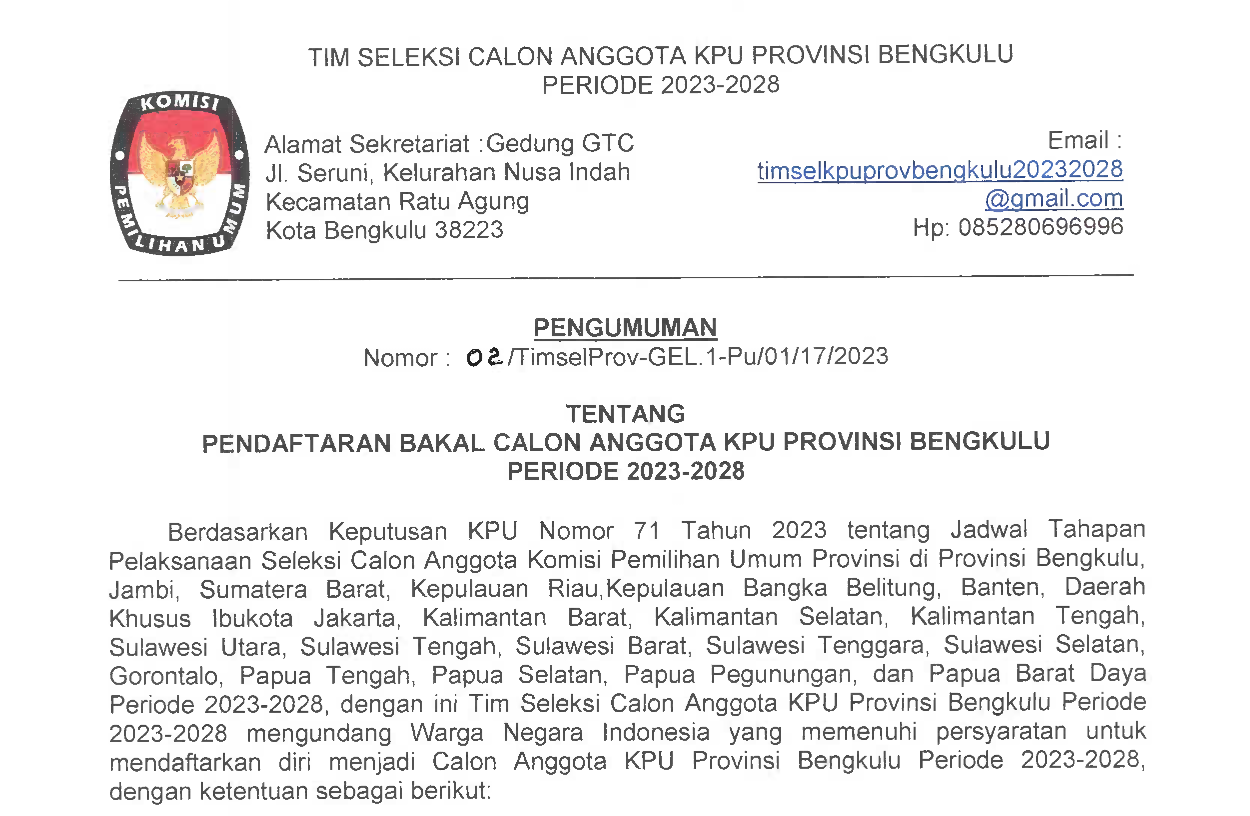 Pengumuman Pendaftaran Bakal Calon Anggota KPU Provinsi Bengkulu Periode 2023-2028