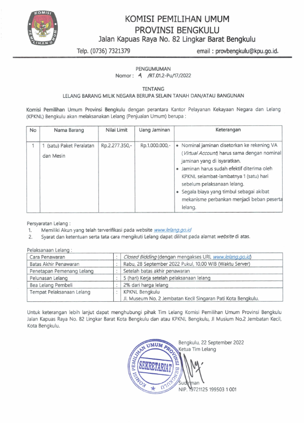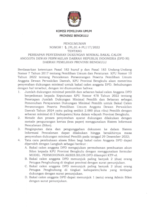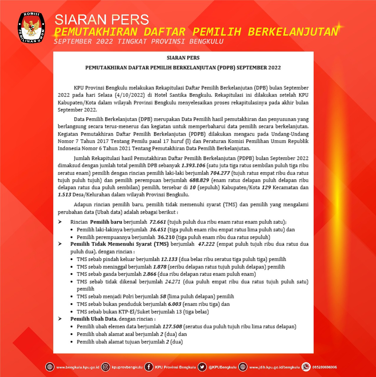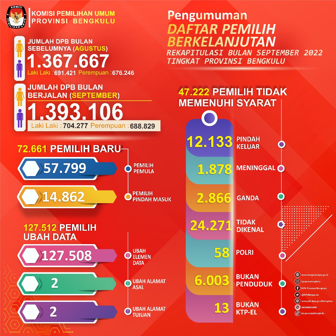 Jumlah Rekapitulasi hasil Pemutakhiran Daftar Pemilih Berkelanjutan (PDPB) bulan September 2022 dengan jumlah total pemilih DPB sebanyak 1.393.106 (satu juta tiga ratus sembilan puluh tiga ribu seratus enam) pemilih dengan rincian pemilih laki-laki berjumlah 704.277 (tujuh ratus empat ribu dua ratus tujuh puluh tujuh) dan pemilih perempuan berjumlah 688.829 (enam ratus delapan puluh delapan delapan ratus dua puluh sembilan) pemilih, tersebar di 10 Kabupaten / Kota 129 Kecamatan dan 1.513 Desa / Kelurahan dalam wilayah Provinsi Bengkulu.