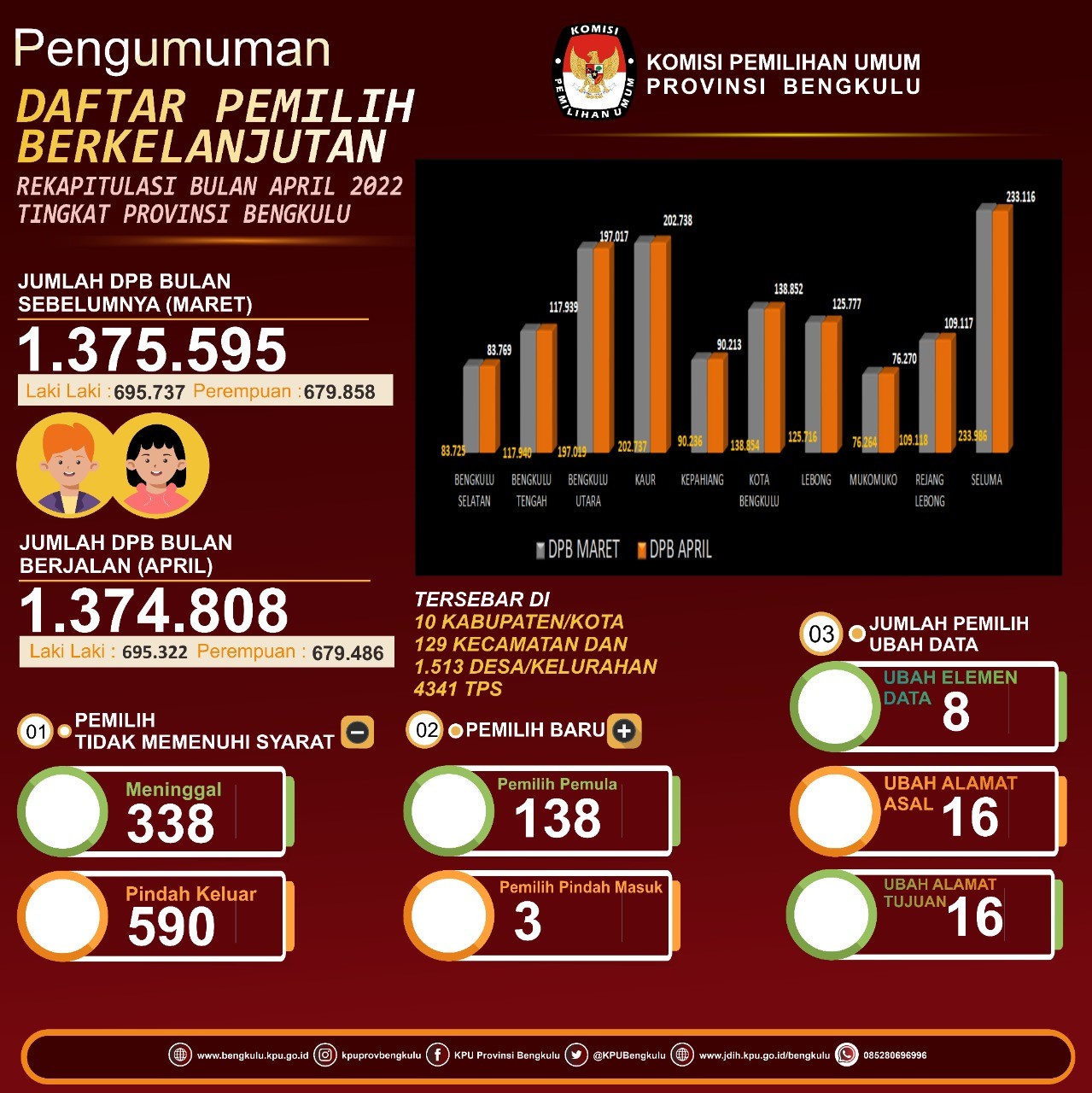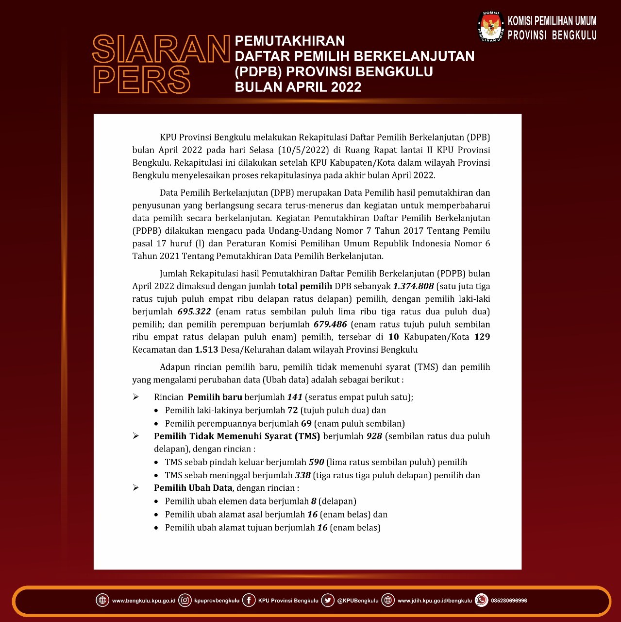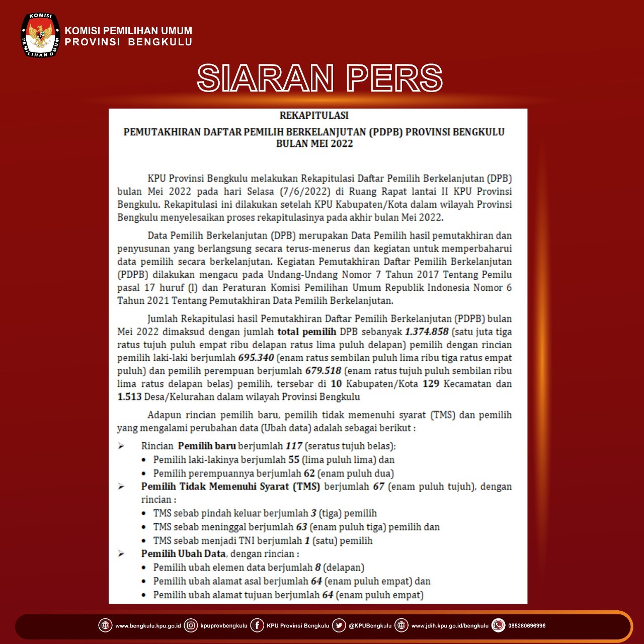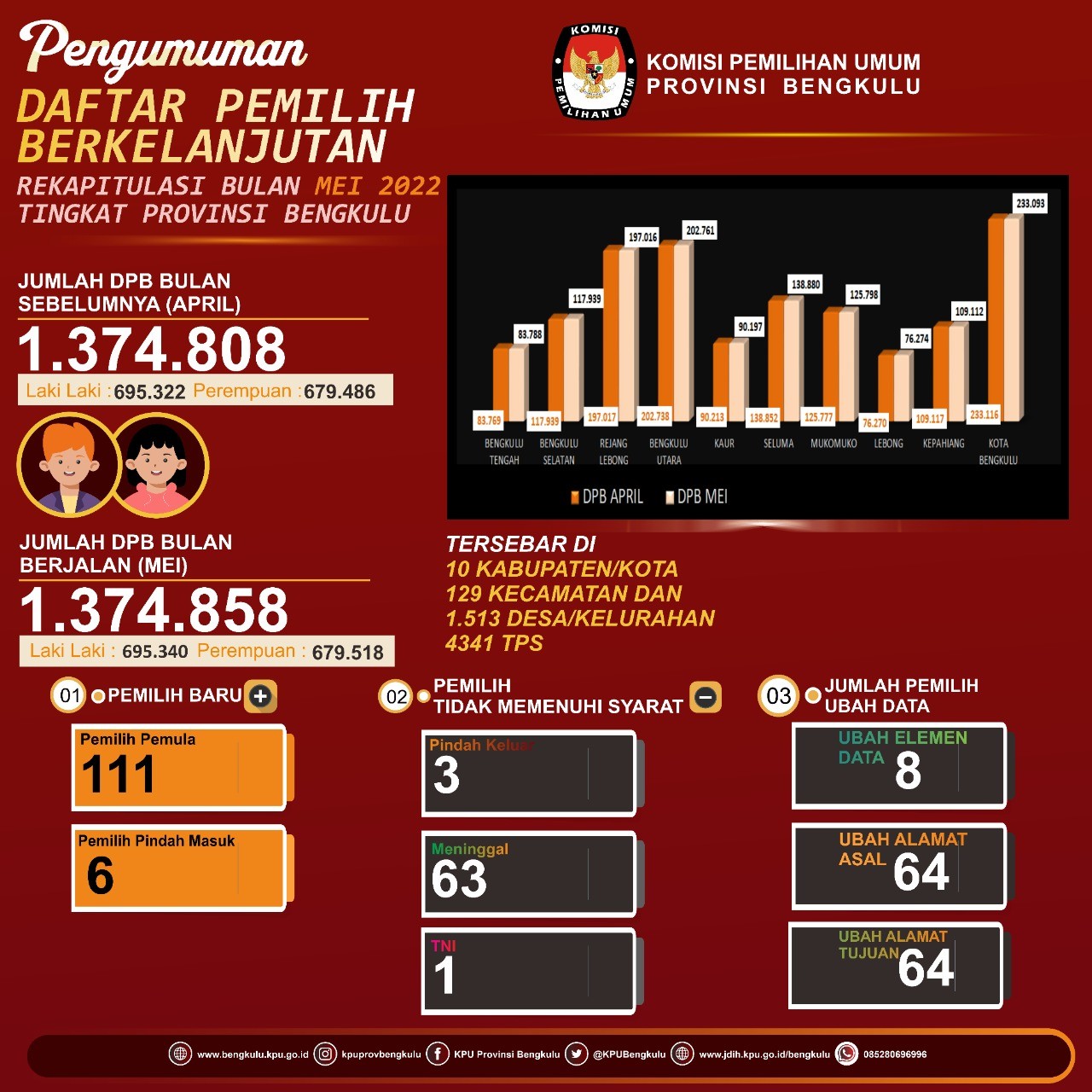 Bengkulu-bengkulu.kpu.go.id, KPU Provinsi Bengkulu telah melakukan Rekapitulasi Daftar Pemilih Berkelanjutan (DPB) bulan Mei 2022 yang bersumber dari Rekapitulasi DPB di 10 KPU Kabupaten/Kota se-Provinsi Bengkulu. Rapat Rekapitulasi dilaksanakan pada Selasa tanggal 7 Juni 2022. Jumlah Rekapitulasi hasil Pemutakhiran Daftar Pemilih Berkelanjutan (PDPB) bulan Mei 2022 dengan jumlah total pemilih DPB sebanyak 1.374.858 (satu juta tiga ratus tujuh puluh empat ribu delapan ratus lima puluh delapan) pemilih dengan rincian pemilih laki-laki berjumlah 695.340 (enam ratus sembilan puluh lima ribu tiga ratus empat puluh) dan pemilih perempuan berjumlah 679.518 (enam ratus tujuh puluh sembilan ribu lima ratus delapan belas) pemilih, tersebar di 10 Kabupaten/Kota 129 Kecamatan dan 1.513 Desa/Kelurahan dalam wilayah Provinsi Bengkulu. Pemutakhiran Data Pemilih Berkelanjutan (PDPB) bulan Mei 2022, melakukan penambahan pemilih yang berasal dari Pemilih Baru berjumlah 117 pemilih yang meliputi pemilih pemula berjumlah 111 pemilih dan pemilih pindah masuk berjumlah 6 pemilih; selanjutnya melakukan pengurangan terhadap Pemilih Tidak Memenuhi Syarat (TMS) sejumlah 67 pemilih yang meliputi TMS sebab pindah keluar berjumlah 3 pemilih, TMS sebab meninggal berjumlah 63 pemilih dan TMS sebab menjadi TNI berjumlah 1 pemilih; dalam proses pemutakhiran ini juga dilakukan ubah data (Pemilih Ubah Data) dengan rincian Pemilih ubah elemen data berjumlah 8 pemilih, pemilih ubah alamat asal berjumlah 64 pemilih dan pemilih ubah alamat tujuan berjumlah 64 pemilih. Model A.2-DPB Mei 2022 (Rekapitulasi) Model A-DPB Mei 2022