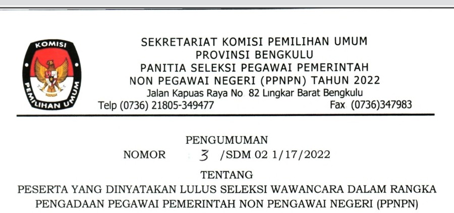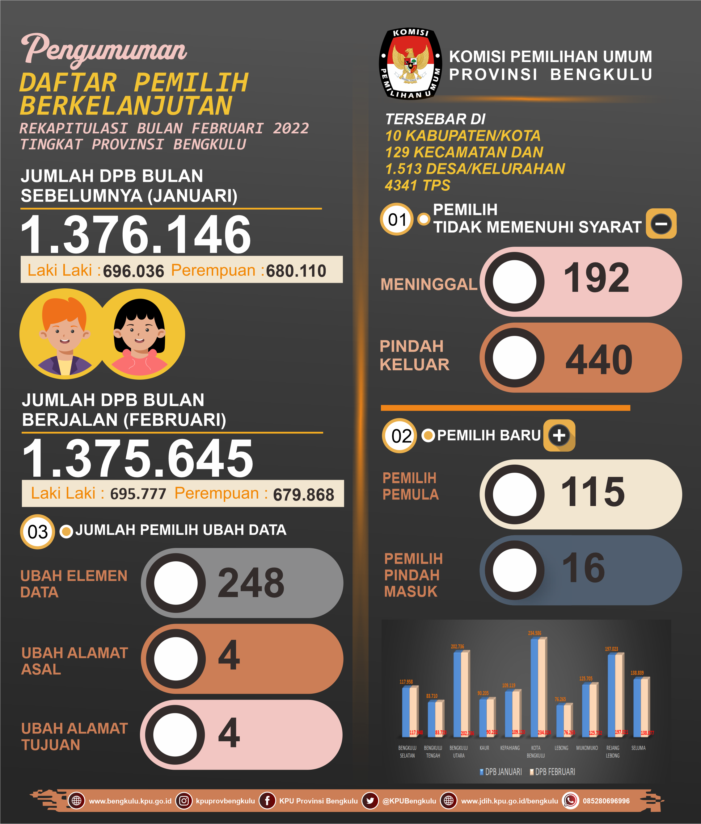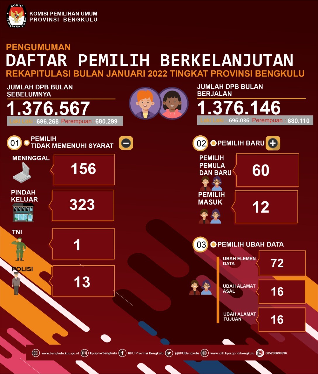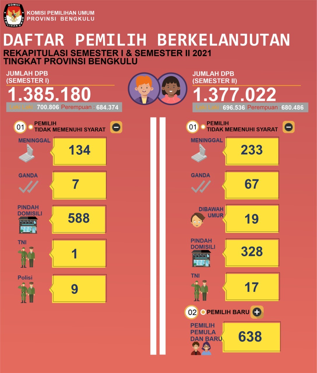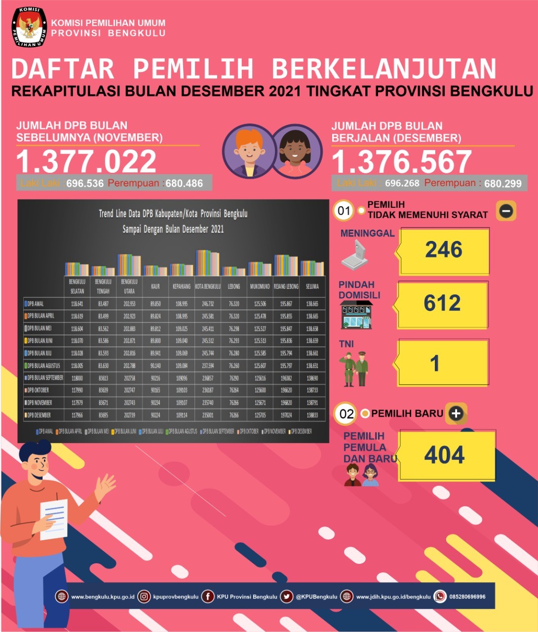 KPU Provinsi Bengkulu telah melakukan rekapitulasi Daftar Pemilih Berkelanjutan (DPB) bulan Desember tahun 2021 yang bersumber dari Berita Acara Pleno Penetapan DPB yang dilaporkan KPU Kabupaten/Kota se Provinsi Bengkulu untuk bulan Desember 2021.