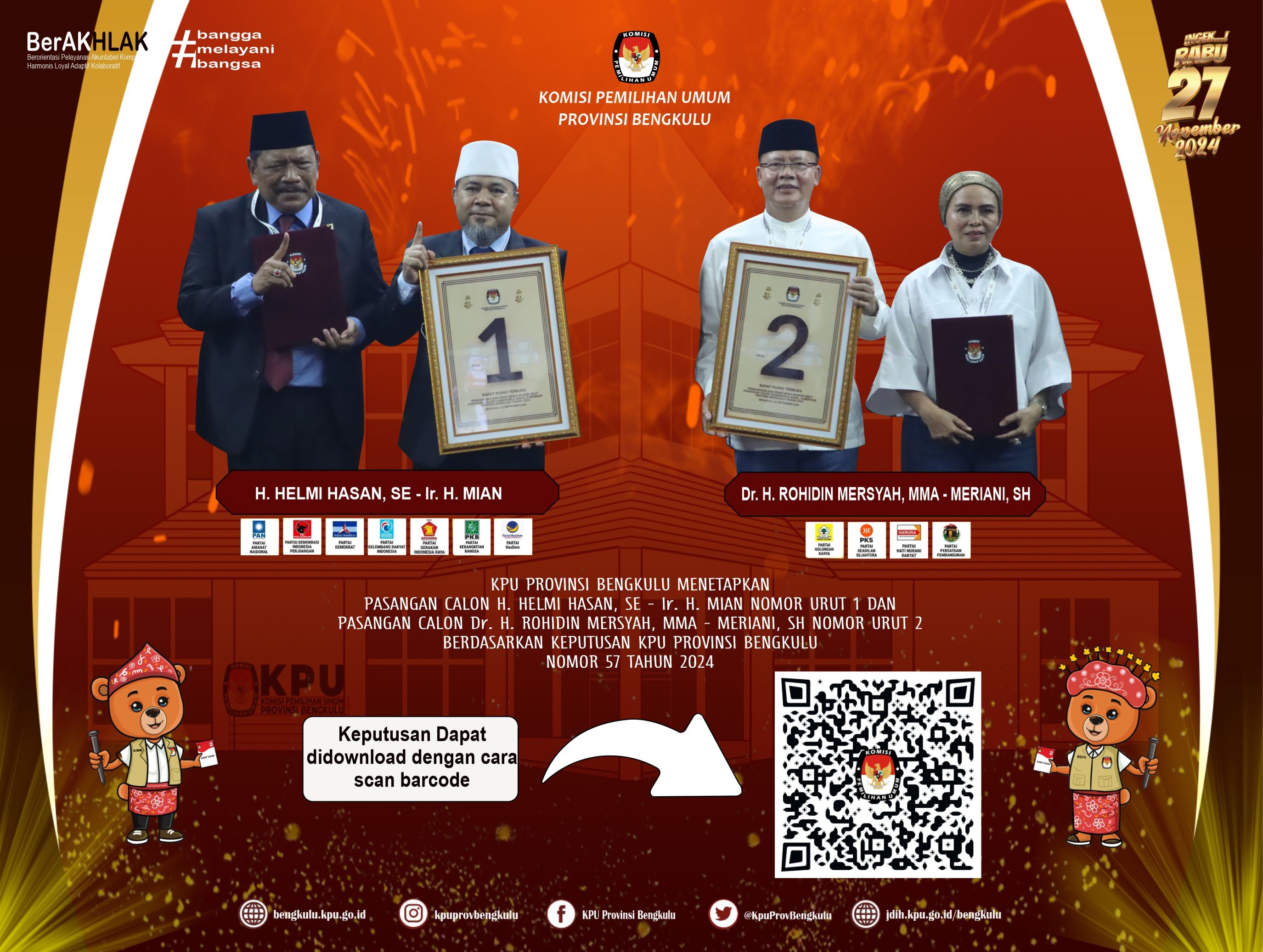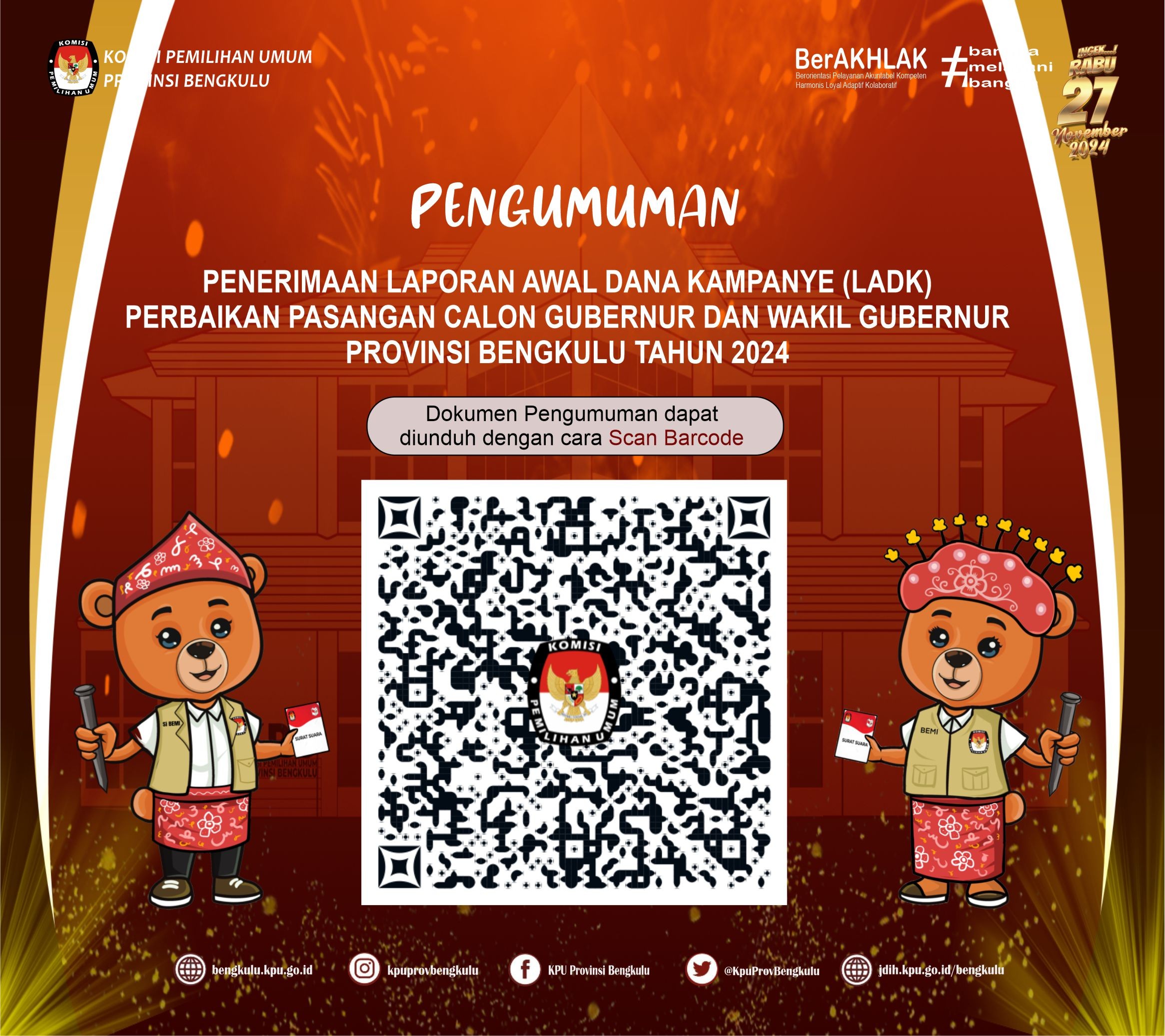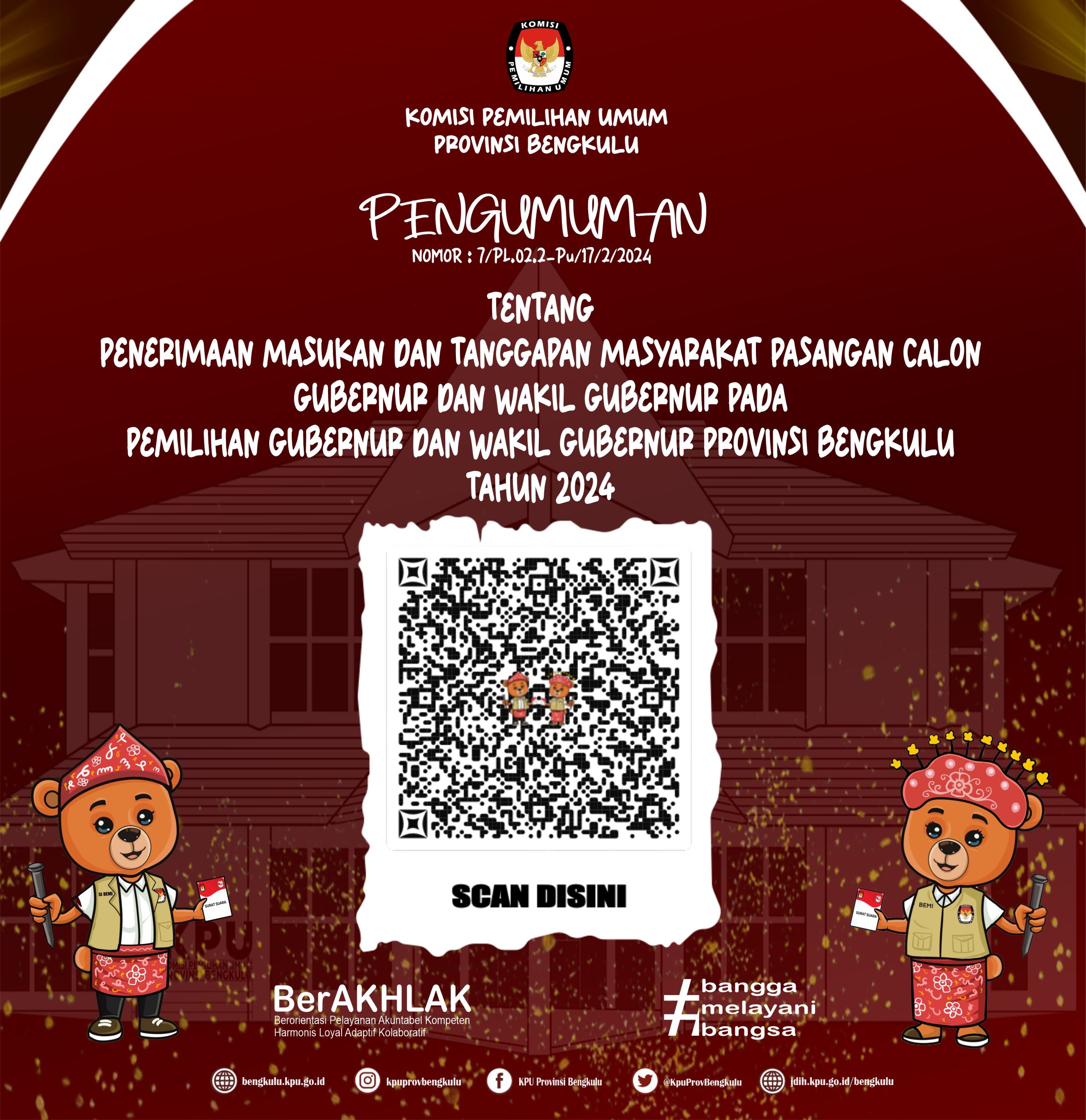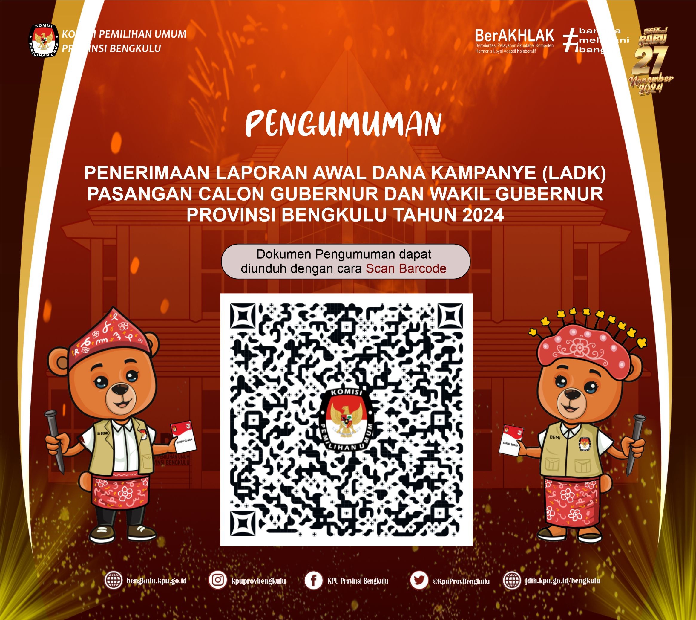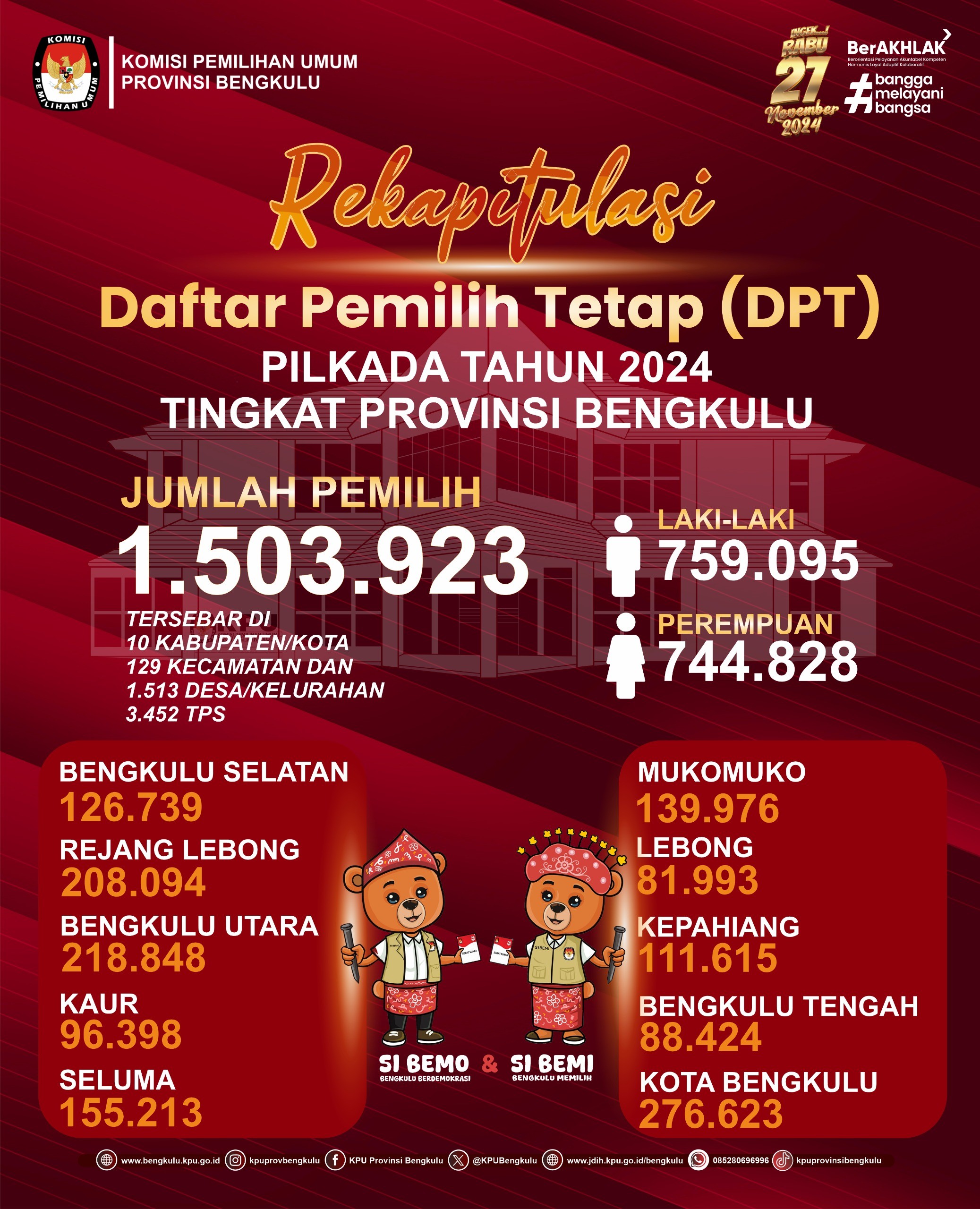 Bengkulu, bengkulu.kpu.go.id - KPU Provinsi Bengkulu menetapkan Daftar Pemilih Tetap (DPT) Tingkat Provinsi Bengkulu pada Pemilihan Serentak Tahun 2024 berdasarkan Keputusan KPU Provinsi Bengkulu Nomor 56 Tahun 2024 berjumlah 1.503.923 Pemilih yang dapat dijelaskan dengan rincian Laki-Laki sebanyak 759.923 pemilih dan Perempuan sebanyak 744.828 pemilih yang tersebar pada 10 kabupaten/Kota, 129 kecamatan, 1.513 Desa/Kelurahan dan 3.452 TPS. Rinciannya Bengkulu Selatan sebanyak 126.739 pemilih, Rejang Lebong sebanyak 208.094 pemilih, Bengkulu Utara sebanyak 218.848 pemilih, Kaur sebanyak 96.398 pemilih, Seluma sebanyak 155.213 pemilih, Mukomuko sebanyak 139.976 pemilih, Lebong sebanyak 81.993 pemilih, Kepahiang sebanyak 111.615 pemilih, Bengkulu Tengah sebanyak 88.424 pemilih dan Kota Bengkulu sebanyak 276.623 pemilih.