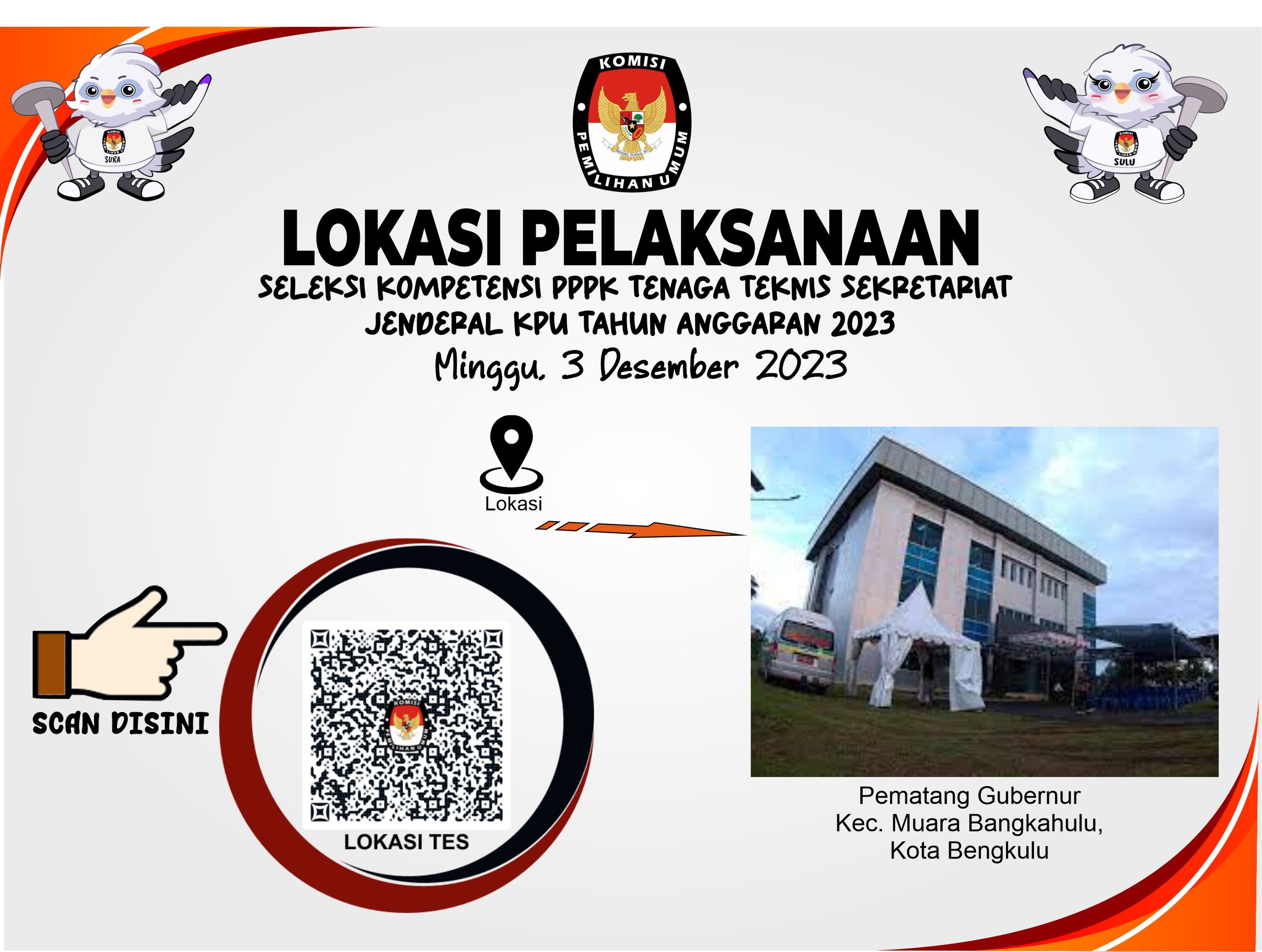 Bengkulu, bengkulu.kpu.go.id - Kamu harus tahu ini loh, Lokasi Pelaksanaan Seleksi Kompetensi Pegawai Pemerintah dengan Perjanjian Kerja Tenaga Teknis Sekretariat Jenderal Komisi Pemilihan Umum Tahun Anggaran 2023, di UPT BKN Bengkulu dengan alamat Pematang Gubernur Kec. Muara Bangkahulu Kota Bengkulu Kode Pos 38119 atau mengetahui lokasi dimaksud dapat melakukan scan barcode.