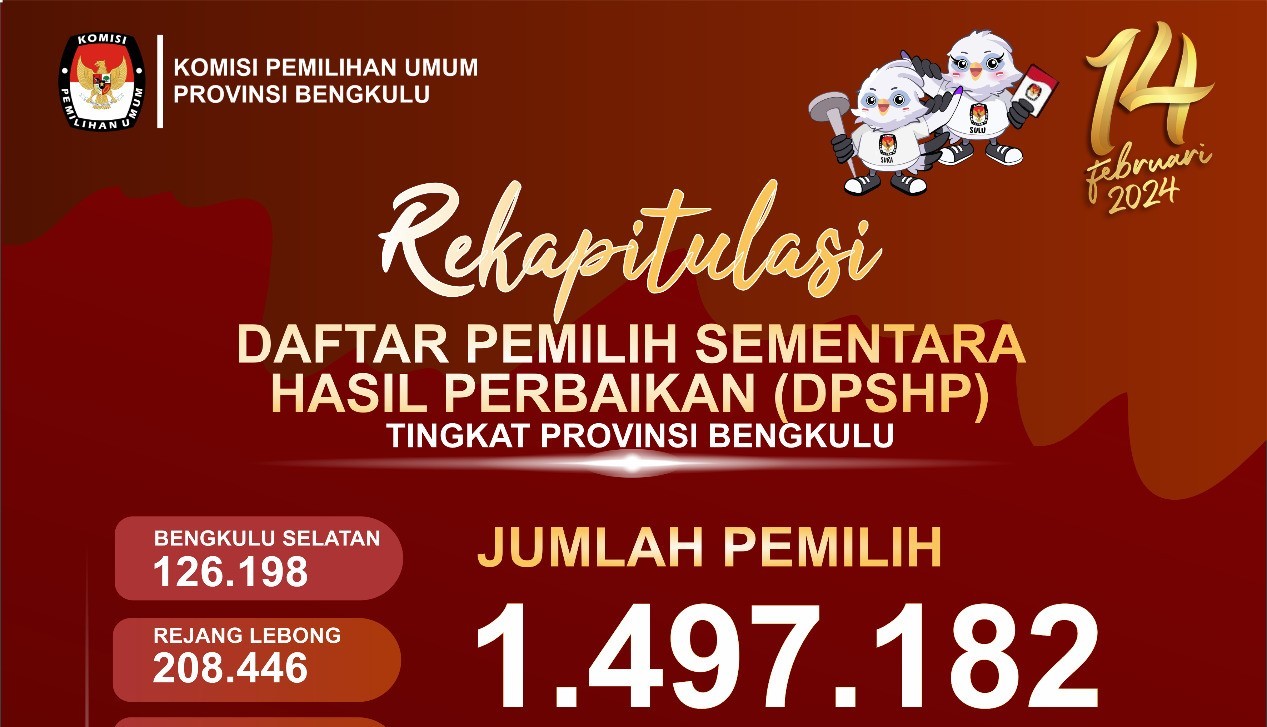 Bengkulu-bengkulu.kpu.go.id, Rekapitulasi Daftar Pemilih Sementara Hasil Perbaikan (DPSHP) Provinsi Bengkulu berjumlah 1.497.182 pemilih dengan rincian 755.997 laki-laki dan 741.185 perempuan yang tersebar di 129 Kecamatan, 1.513 desa/kelurahan dan 6.213 TPS. Dengan Rincian Bengkulu Selatan sebanyak 126.198 pemilih, Rejang Lebong sebanyak 208.446 pemilih, Bengkulu Utara sebanyak 218.324 pemilih, Kaur sebanyak 96.179 pemilih, Seluma sebanyak 157.007 pemilih, Mukomuko sebanyak 138.413 pemilih, Lebong sebanyak 81.846 pemilih, Kepahiang sebanyak 112.463 pemilih, Bengkulu Tengah sebanyak 87.485 pemilih, Kota Bengkulu sebanyak 270.821 pemilih.